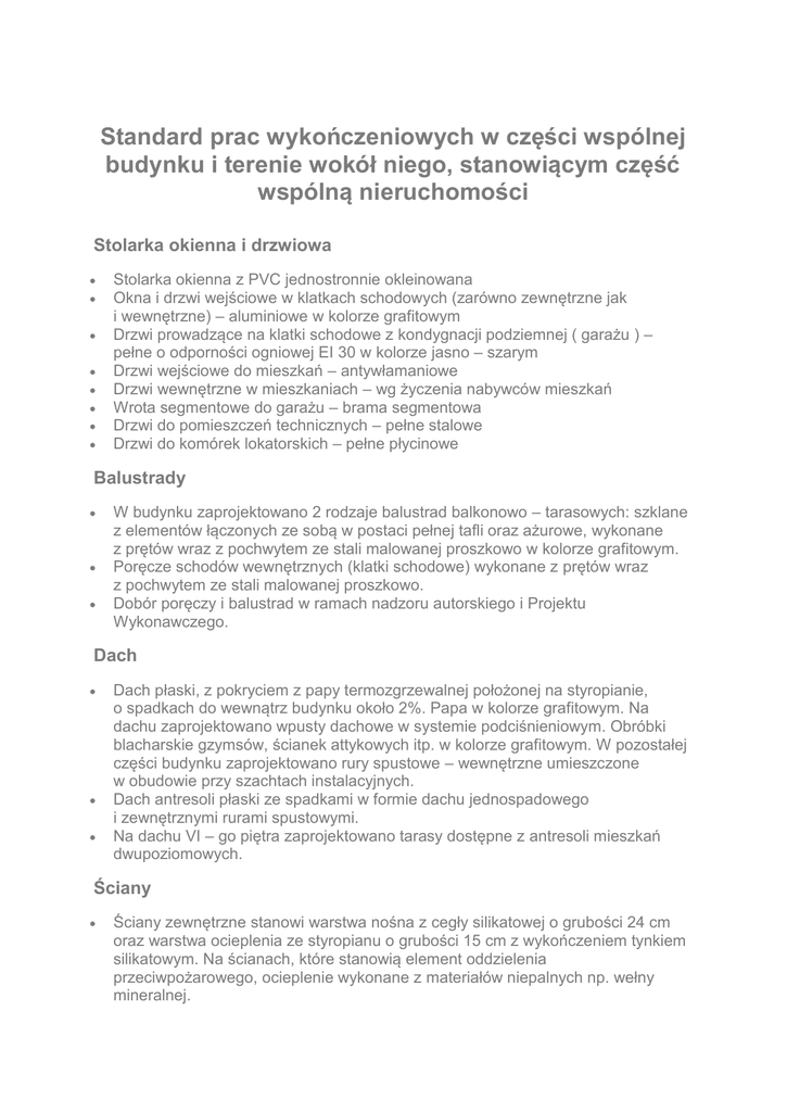 Standard prac wykończeniowych w części wspólnej budynku i terenie wokół niego, stanowiącym część wspólną nieruchomości Stolarka okienna i drzwiowa Stolarka okienna z PVC jednostronnie okleinowana Okna i drzwi wejściowe w klatkach schodowych (zarówno zewnętrzne jak i wewnętrzne) – aluminiowe w kolorze grafitowym Drzwi prowadzące na klatki schodowe z kondygnacji podziemnej ( garażu ) – pełne o odporności ogniowej EI 30 w kolorze jasno – szarym Drzwi wejściowe do mieszkań – antywłamaniowe Drzwi wewnętrzne w mieszkaniach – wg życzenia nabywców mieszkań Wrota segmentowe do garażu – brama segmentowa Drzwi do pomieszczeń technicznych – pełne stalowe Drzwi do komórek lokatorskich – pełne płycinowe Balustrady W budynku zaprojektowano 2 rodzaje balustrad balkonowo – tarasowych: szklane z elementów łączonych ze sobą w postaci pełnej tafli oraz ażurowe, wykonane z prętów wraz z pochwytem ze stali malowanej proszkowo w kolorze grafitowym. Poręcze schodów wewnętrznych (klatki schodowe) wykonane z prętów wraz z pochwytem ze stali malowanej proszkowo. Dobór poręczy i balustrad w ramach nadzoru autorskiego i Projektu Wykonawczego. Dach Dach płaski, z pokryciem z papy termozgrzewalnej położonej na styropianie, o spadkach do wewnątrz budynku około 2%. Papa w kolorze grafitowym. Na dachu zaprojektowano wpusty dachowe w systemie podciśnieniowym. Obróbki blacharskie gzymsów, ścianek attykowych itp. w kolorze grafitowym. W pozostałej części budynku zaprojektowano rury spustowe – wewnętrzne umieszczone w obudowie przy szachtach instalacyjnych. Dach antresoli płaski ze spadkami w formie dachu jednospadowego i zewnętrznymi rurami spustowymi. Na dachu VI – go piętra zaprojektowano tarasy dostępne z antresoli mieszkań dwupoziomowych. Ściany Ściany zewnętrzne stanowi warstwa nośna z cegły silikatowej o grubości 24 cm oraz warstwa ocieplenia ze styropianu o grubości 15 cm z wykończeniem tynkiem silikatowym. Na ścianach, które stanowią element oddzielenia przeciwpożarowego, ocieplenie wykonane z materiałów niepalnych np. wełny mineralnej. W elewacjach budynków zaprojektowano zróżnicowanie barwne oraz zaakcentowane dekoracyjne, nieregularne belkowanie i plastrowanie. Przyjęta kolorystyka to grafit, jasnoszary oraz biel. Zdecydowany akcent kolorystyczny stanowią elementy w intensywnym kolorze bordo. Wewnętrzne ściany – murowane z cegły silikatowej o zróżnicowanej grubości: pomiędzy mieszkaniami z cegły o grubości 24 cm, pozostałe ściany z cegły o grubości 12 cm. Wszystkie ściany pokryte tynkiem gipsowym. Ściany wewnętrzne w przestrzeniach ogólnych – malowane farbą lateksową, fragmentarycznie w okładzinie z tynku mozaikowego lub terakoty wg Projektu Wykonawczego. Posadzki W całej części podziemnej (garażu) zaprojektowano płytę ze spadkami. W strefach ogólnodostępnych tj. klatki schodowe, schody, korytarze – jako wykończenie posadzek przyjęto terakotę lub gres. W mieszkaniach wykończenie podłóg stanowi podłoga indywidualna (np. terakota lub panele podłogowe) zgodna życzeniem nabywcy mieszkania (wylewka pod warstwę wykończeniową). Instalacje W budynku zaprojektowano następujące wewnętrzne instalacje: elektryczną i odgromową oraz teletechniczną wodno-kanalizacyjną centralnego ogrzewania zasilaną z węzła cieplnego wentylację mechaniczną części podziemnej – w tym także wentylację kanałową oddymiającą wentylację mechaniczną hybrydową wszystkich pomieszczeń higienicznosanitarnych w mieszkaniach, przy uwzględnieniu iż zarówno w kuchni jak i w aneksie kuchennym są to 2 kanały (dającą możliwość podłączenia okapów kuchennych) wentylację mechaniczną hybrydową wszystkich lokali usługowych system sygnalizacji pożaru (powiązanie z instalacją wentylacji oddymiającej oraz elektryczną. Każde mieszkanie posiada własny zestaw liczników instalacji wewnętrznych. Pomiar instalacji wewnętrznych tj. c.o. i woda znajduje się przy mieszkaniach, w szachtach instalacyjnych klatek schodowych na poszczególnych kondygnacjach. Liczniki energii elektrycznej poszczególnych mieszkań usytuowano w garażu podziemnym przy danej klatce schodowej, tak by były dostępne dla pracowników PGE-ŁZE. Rozprowadzenie instalacji w podtynkowo. Dostęp do klatek schodowych oraz na teren wydzielonej działki budowlanej za pomocą KONTROLI DOSTĘPU tj. domofony. Lokalizacja domofonów przy wejściach do klatek schodowych oraz przy furtce prowadzącej na wewnętrzny dziedziniec. Furtka o szerokości 150 cm. Określenie zakresu i standardu prac wykończeniowych, do których wykonania zobowiązuje się deweloper Standard wykończenia mieszkań: drzwi wejściowe do lokalu antywłamaniowe, drzwi wewnętrzne - bez drzwi wewnętrznych, podłoga - posadzka cementowa zatarta na gładko, tynki na ścianach - gipsowe wykonane na mokro, parapety okienne wewnętrzne jasne, parapety zewnętrzne np. stalowe powlekane, punkty poboru wody - zaślepione korkami, instalacja elektryczna o mocy 12,5 kW- bez opraw oświetleniowych, gniazda wtykowe, włączniki oświetlenia, aparat domofonu, gniazdo telefoniczne w pokoju dziennym i większej sypialni, gniazdo TV w pokoju dziennym i większej sypialni, instalacja wodna z polietylenu, instalacja kanalizacyjna z PCV, instalacja ogrzewania z grzejnikami płytowymi np. firmy Viessmann, instalacja internetowa w pokoju dziennym, liczniki zużycia wody zimnej i ciepłej, energii elektrycznej oraz energii cieplnej.