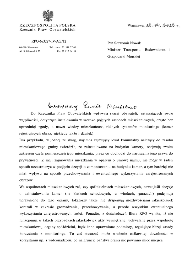 R Z E C Z P O S P O L I T A POLSKA Rzecznik Praw Obywatelskich RPO-683227-IV-AG/12 00-090 Warszawa Al. Solidarności 77 Tel. centr. 22 551 77 00 Fax 22 827 64 53 Pan Sławomir Nowak Minister Transportu, Budownictwa i Gospodarki Morskiej Do Rzecznika Praw Obywatelskich wpływają skargi obywateli, zgłaszających swoje wątpliwości, dotyczące instalowania w szeroko pojętych zasobach mieszkaniowych, często bez uprzedniej zgody, a nawet wiedzy mieszkańców, różnych systemów monitoringu (kamer rejestrujących obraz, niekiedy także i dźwięk). Dla przykładu, w jednej ze skarg, najemca zajmujący lokal komunalny należący do zasobu mieszkaniowego gminy twierdził, że zainstalowane na budynku kamery, obejmują swoim zakresem część pomieszczeń jego mieszkania, przez co dochodzi do naruszenia jego prawa do prywatności. Z racji zajmowania mieszkania w oparciu o umowę najmu, nie mógł w żaden sposób uczestniczyć w podjęciu decyzji o zamontowaniu na budynku kamer, a tym bardziej nie miał wpływu na sposób przechowywania i ewentualnego wykorzystania zarejestrowanych obrazów. We wspólnotach mieszkaniowych zaś, czy spółdzielniach mieszkaniowych, nawet jeśli decyzje o zainstalowaniu kamer (na klatkach schodowych, w windach, garażach) podejmują uprawnione do tego organy, lokatorzy także nie dysponują możliwościami jakiejkolwiek kontroli w zakresie gromadzenia, przechowywania, a przede wszystkim ewentualnego wykorzystania zarejestrowanych treści. Ponadto, z doświadczeń Biura RPO wynika, iż nie funkcjonują w takich przypadkach jakiekolwiek akty wewnętrzne, uchwalane przez wspólnotę mieszkaniową, organy spółdzielni, bądź inne uprawnione podmioty, regulujące bliżej zasady korzystania z monitoringu. To zaś stwarzać może wrażenie całkowitej dowolności w korzystaniu np. z wideonadzoru, co na gruncie państwa prawa nie powinno mieć miejsca. 2 Zauważyć w tym miejscu trzeba, że instalowanie kamer i rejestrowanie pochodzącego z nich obrazu w miejscach przebywania ludzi jest zjawiskiem coraz powszechniejszym i dotyczy zarówno miejsc użyteczności publicznej, czy zakładów pracy, jak też budynków mieszkalnych i biurowych. Mimo to, choć z monitorowaniem spotkać się można np. w środkach komunikacji miejskiej, na stadionach, w windach i na klatkach schodowych budynków mieszkalnych, brak jest przepisów prawa normujących kwestie związane z instalowaniem i wykorzystaniem zapisów monitoringu. W takiej sytuacji osoba, która uznaje, iż np. jej wizerunek został w wyniku nagrań monitoringu w sposób nieuprawniony wykorzystany, każdorazowo poszukiwać musi ochrony prawnej na drodze sądowej, mając świadomość, iż dowodzenie bezprawności działania może powodować znaczne trudności. Skoro bowiem nie funkcjonują żadne regulacje, dotyczące monitoringu i zasad jego wykorzystania, wykazanie bezprawności działania spowodowanego monitoringiem, może w praktyce nastręczać istotne trudności. Potencjalnie może też prowadzić do zróżnicowania orzecznictwa w takich sprawach, bowiem brak przepisów powszechnie obowiązujących, skutkować może odmienną interpretacją podobnych stanów faktycznych przez sądy. Tak więc brak przepisów dotyczących monitoringu w zasobach mieszkaniowych wpływać może negatywnie zarówno na poziom ochrony w zakresie dóbr osobistych, jak też ochrony danych osobowych. W ramach dotychczas podejmowanych przez Rzecznika Praw Obywatelskich w tej materii działań, w których poruszony już został problem braku regulacji dotyczących szeroko pojętego monitoringu, swoje stanowisko przedstawił zarówno Generalny Inspektor Ochrony Danych Osobowych, jak też Minister Spraw Wewnętrznych i Administracji. I tak w udzielonej Rzecznikowi odpowiedzi (pismo z dnia 13 stycznia 2011r., nr DOLiS-035-3173/10), dotyczącej problematyki wykorzystywania i upubliczniania materiałów pozyskanych przez Policję - nagrań monitoringu, Generalny Inspektor Ochrony Danych Osobowych wyraził pogląd, iż zainicjowanie prac legislacyjnych mających na celu unormowanie w przepisach rangi ustawowej ogólnych zasad dotyczących wideonadzoru, wydaje się konieczne. Jak trafnie zauważył wówczas Generalny Inspektor Ochrony Danych Osobowych, faktem jest, że różne podmioty stosują systemy monitoringu (wideonadzoru, monitoringu wizyjnego, czy audiowizualnego), a pozyskiwaniem tą drogą informacji zajmuje się coraz szerszy krąg podmiotów zarówno z sektora publicznego, jak i prywatnego. Skutkiem stosowania monitoringu może być tymczasem utrwalanie wizerunku osób fizycznych, a następnie jego przechowywanie, opracowywanie i wykorzystywanie dla różnych celów. 3 Zdaniem GIODO, coraz częściej informacja dotycząca wizerunku osób, informacja o obecności w określonych miejscach, o sposobie zachowania, jak również treści wypowiedzi, są utrwalane i mogą być wykorzystywane w różnych celach. W niektórych przypadkach używanie systemów monitoringu (wizualnego, audiowizualnego) jest obowiązkowe, zgodnie z przepisami szczególnymi (np. w kasynach, na stadionach w czasie odbywania się imprez masowych). W innych sytuacjach monitoring może być stosowany z uwagi na szczególnie ważny, usprawiedliwiony cel określonych podmiotów zarówno publicznych, jak i prywatnych. Systemy te są stosowane w celach nie tylko zapewnienia bezpieczeństwa, lecz szeroko rozumianego „nadzoru". W odniesieniu do tych przypadków brak jest odpowiednych regulacji. Jak zasadnie zaś wskazał Generalny Inspektor Ochrony Danych Osobowych, w piśmie skierowanym w dniu 24 sierpnia 2011r. do Ministra Spraw Wewnętrznych i Administracji, istnieje wiele miejsc, w których monitoring jest stosowany, a do których nie odnoszą się żadne regulacje, m.in. ciągi komunikacyjne w budynkach, budynki wspólnot i spółdzielni mieszkaniowych. Brak regulacji dotyczących stosowania monitoringu i jego specyfika sprawia, że naruszane są podstawowe prawa osób