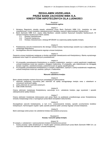 Załącznik nr 1 do Zarządzenia Członka Zarządu nr 277/2014 z dn. 27.06.2014 r. REGULAMIN UDZIELANIA PRZEZ BANK ZACHODNI WBK S.A. KREDYTÓW HIPOTECZNYCH DLA LUDNOŚCI Rozdział I Postanowienia ogólne 1. 2. 1. 2. Artykuł 1 Niniejszy Regulamin określa zasady udzielania przez Bank Zachodni WBK S.A., kredytów na cele mieszkaniowe i innych kredytów zabezpieczonych hipoteką, zwanych dalej kredytami hipotecznymi. Bank Zachodni WBK S.A., zwany dalej Bankiem, udziela osobom fizycznym kredytów hipotecznych. W ramach kredytów hipotecznych Bank udziela: 2.1. Kredyty mieszkaniowe, 2.2. PoŜyczki hipoteczne, 2.3. Kredyty mieszkaniowe z dotacją NFOŚiGW na częściową spłatę kapitału kredytu. Artykuł 2 Podstawowe warunki kredytowania dla danego rodzaju kredytu hipotecznego zawarte są w załącznikach do niniejszego Regulaminu. Szczegółowe warunki kredytowania reguluje umowa kredytowa. Artykuł 3 Zawarcie umowy kredytowej następuje w drodze zgodnego oświadczenia woli Kredytobiorcy i Banku wyraŜonego podpisami stron bądź ich upowaŜnionych przedstawicieli. 1. 2. Artykuł 4 W przypadku pozostawania Kredytobiorcy w związku małŜeńskim, opartym o ustrój wspólności majątkowej, umowa kredytowa moŜe być zawarta z obojgiem małŜonków. W przypadku, gdy małŜonkowie nie zaciągają kredytu wspólnie, udzielenie kredytu uzaleŜnione jest od zgody współmałŜonka. W przypadku pozostawania Kredytobiorcy w związku małŜeńskim, opartym o ustrój rozdzielności majątkowej, umowa kredytowa moŜe być zawarta z jednym z małŜonków. Rozdział II Warunki udzielenia kredytu Artykuł 5 Bank udziela kredytów osobom fizycznym posiadającym jednocześnie: 1. zdolność kredytową rozumianą jako zdolność do spłaty zaciągniętego kredytu wraz z odsetkami w umownych terminach spłaty, 2. pełną zdolność do czynności prawnych, 3. stałe źródło dochodu, Artykuł 6 Ocena zdolności kredytowej Kredytobiorcy warunkuje m.in.: udzielenie kredytu, jego wysokość i sposób zabezpieczenia spłaty kredytu. Artykuł 7 Ocena zdolności kredytowej dokonywana jest przez Bank na podstawie przedłoŜonego przez Kredytobiorcę wniosku kredytowego wraz z wymaganym przez Bank kompletem dokumentów. Artykuł 8 Szczegółowe warunki kredytowania, w tym m.in.: przeznaczenie kredytu, sposób uruchomienia środków kredytowych, harmonogram wypłat i spłat, sposób pobrania opłat i prowizji reguluje umowa kredytowa. Artykuł 9 Bank zastrzega sobie prawo nie udzielenia kredytu bez podania przyczyny. Rozdział III Koszty i warunki spłaty kredytu Artykuł 10 W związku z udzieleniem i wykorzystaniem kredytu Kredytobiorca ponosi: 1. koszty prowizji i opłat określonych w Taryfie opłat i prowizji pobieranych przez Bank Zachodni WBK S.A. za czynności bankowe dla ludności i umowie kredytowej, Załącznik nr 1 do Zarządzenia Członka Zarządu nr 277/2014 z dn. 27.06.2014 r. 2. koszty odsetek od wykorzystanego kredytu. 1. 2. Artykuł 11 Spłata kredytu wraz z odsetkami następuje w sposób określony w umowie kredytowej. Sposób wypłaty i spłaty kredytu, w tym w szczególności sposób spłaty rat kredytu - w systemie okresowo równych rat lub w systemie rat malejących – określa umowa kredytowa. Artykuł 12 Bank ma prawo wypowiedzieć umowę kredytową zgodnie z zasadami i w terminach przewidzianych w ustawie Prawo bankowe (Dz.U. Nr 72 z 2002 r., poz. 665, z późniejszymi zmianami). Rozdział IV Zabezpieczenie spłaty kredytu Artykuł 13 Podstawowym zabezpieczeniem wierzytelności Banku jest hipoteka ustanowiona na prawie własności nieruchomości, prawie uŜytkowania wieczystego, własnościowym spółdzielczym prawie do lokalu mieszkalnego lub prawie do domu jednorodzinnego w spółdzielni mieszkaniowej. 1. 2. 3. Artykuł 14 Dodatkowym prawnym zabezpieczeniem spłaty kredytu hipotecznego moŜe być m.in.: 1.1. zastaw, zastaw rejestrowy 1.2. przewłaszczenie na zabezpieczenie, 1.3. poręczenie według prawa cywilnego lub wekslowego osoby fizycznej lub prawnej, 1.4. weksle własne in blanco, 1.5. cesja praw z tytułu majątkowej polisy ubezpieczeniowej, 1.6. ustanowienie Banku jako uposaŜonego z polisy ubezpieczenia na Ŝycie Kredytobiorcy, 1.7. cesja praw do rachunku bankowego, 1.8. pełnomocnictwo do dysponowania rachunkiem bankowym. Poszczególne formy zabezpieczenia mogą występować łącznie. Koszty związane z ustanowieniem, zmianą, utrzymaniem i wygaśnięciem prawnego zabezpieczenia spłaty kredytu hipotecznego ponosi Kredytobiorca. Rozdział V Postanowienia końcowe Artykuł 15 W sprawach nieuregulowanych w niniejszym Regulaminie mają zastosowanie powszechnie obowiązujące przepisy prawa, a w szczególności: Ustawa z dnia 29.08.1997 r. Prawo bankowe (Dz.U. Nr 72 z 2002 r., poz. 665, z późniejszymi zmianami), Ustawa z dnia 23.04.1964 r. Kodeks cywilny (Dz.U. z 1964r. Nr 16 poz. 93, z późniejszymi zmianami) i Ustawa z dnia 20 lipca 2001r. o kredycie konsumenckim (Dz. U. Nr 100, poz. 1081, z późniejszymi zmianami). Artykuł 16 Oferta dotycząca usług i cen obowiązuje we wszystkich placówkach* i obsługujących klientów jednostkach centralnych Banku Zachodniego WBK S.A., Artykuł 17 Regulamin udzielania przez Bank Zachodni WBK S.A. kredytów hipotecznych dla ludności obowiązuje od dnia 01 lipca 2014r. * przez placówkę rozumie się Oddziały Banku Zachodniego WBK S.A. oraz placówki partnerskie działające pod oznaczeniem „Bank Zachodni WBK Partner”