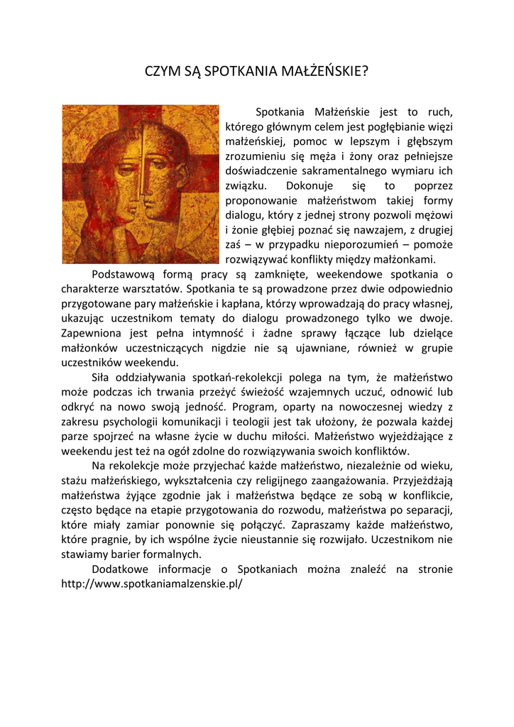 CZYM SĄ SPOTKANIA MAŁŻEŃSKIE? Spotkania Małżeńskie jest to ruch, którego głównym celem jest pogłębianie więzi małżeńskiej, pomoc w lepszym i głębszym zrozumieniu się męża i żony oraz pełniejsze doświadczenie sakramentalnego wymiaru ich związku. Dokonuje się to poprzez proponowanie małżeństwom takiej formy dialogu, który z jednej strony pozwoli mężowi i żonie głębiej poznać się nawzajem, z drugiej zaś – w przypadku nieporozumień – pomoże rozwiązywać konflikty między małżonkami. Podstawową formą pracy są zamknięte, weekendowe spotkania o charakterze warsztatów. Spotkania te są prowadzone przez dwie odpowiednio przygotowane pary małżeńskie i kapłana, którzy wprowadzają do pracy własnej, ukazując uczestnikom tematy do dialogu prowadzonego tylko we dwoje. Zapewniona jest pełna intymność i żadne sprawy łączące lub dzielące małżonków uczestniczących nigdzie nie są ujawniane, również w grupie uczestników weekendu. Siła oddziaływania spotkań-rekolekcji polega na tym, że małżeństwo może podczas ich trwania przeżyć świeżość wzajemnych uczuć, odnowić lub odkryć na nowo swoją jedność. Program, oparty na nowoczesnej wiedzy z zakresu psychologii komunikacji i teologii jest tak ułożony, że pozwala każdej parze spojrzeć na własne życie w duchu miłości. Małżeństwo wyjeżdżające z weekendu jest też na ogół zdolne do rozwiązywania swoich konfliktów. Na rekolekcje może przyjechać każde małżeństwo, niezależnie od wieku, stażu małżeńskiego, wykształcenia czy religijnego zaangażowania. Przyjeżdżają małżeństwa żyjące zgodnie jak i małżeństwa będące ze sobą w konflikcie, często będące na etapie przygotowania do rozwodu, małżeństwa po separacji, które miały zamiar ponownie się połączyć. Zapraszamy każde małżeństwo, które pragnie, by ich wspólne życie nieustannie się rozwijało. Uczestnikom nie stawiamy barier formalnych. Dodatkowe informacje o Spotkaniach można znaleźć na stronie http://www.spotkaniamalzenskie.pl/ O SPOTKANIACH MAŁŻEŃSKICH W MARIAHOLM: 1. Spotkania Małżeńskie odbędą się w ośrodku rekolekcyjnym w Mariaholm (Stegenveien 1143, 1820 Spydeberg) w dniach od 24 do 26 marca 2017 roku. Prowadzone będą przez dwie pary animatorów z Polski - Jolę i Roberta Janczaków, Darię i Pawła Łabędzkich - oraz o. Piotra Idziaka. Ojciec Piotr to doświadczony kierownik duchowy prowadzący m.in. rekolekcje ignacjańskie i Lectio Divina. Pochodzi z Kruszwicy, a pracował między innymi w Lublinie, Bydgoszczy i od 2008 roku prowadzi rekolekcje Spotkań Małżeńskich w Ośrodku Kaliskim. 2. Spotkania zorganizowane są w formie warsztatów. Rozpoczniemy je kolacją w piątek o godzinie 18.00 i zakończymy obiadem w niedzielę około godziny 14.00. Spotkania Małżeńskie w Mariaholm organizowane są przy wsparciu księży z parafii St Hallvard w Oslo. 3. Dojazd do Mariaholm jest we własnym zakresie. Ośrodek dysponuje bezpłatnymi miejscami parkingowymi. 4. Ważne jest by wszyscy uczestnicy byli obecni od początku do końca rekolekcji. Zajęcia w piątek mają duże znaczenie dla wejścia w rytm ćwiczeń, są tam wyjaśniane podstawy metod animatorów. 5. W Spotkaniach uczestniczą tylko pary małżeńskie. Program rekolekcji jest intensywny i nie jesteśmy w stanie zapewnić w tym czasie opieki nad dziećmi. Ważne jest, aby uczestnicy mogli poświęcić czas warsztatów wyłącznie dla siebie. Dlatego zapraszamy na rekolekcje wtedy, kiedy dzieci będą mogły zostać pod czyjąś opieką w domu. 6. Całkowity koszt weekendu to 2400 koron od pary małżeńskiej. Koszt ten zapewnia zakwaterowanie w pokojach dwuosobowych z prysznicem, pełne wyżywienie, materiały, korzystanie z sal konferencyjnych. Proszę zabrać ze sobą poszewki na pościel, ręczniki i przybory toaletowe. 7. Zapisy na rekolekcje przyjmowane są mailowo (adresy znajdują się poniżej). W zgłoszeniu proszę podać: • imię i nazwisko małżonków, • staż małżeński, • adres zamieszkania, • numer telefonu, • adres mailowy 8. Opłatę za Spotkania Małżeńskie proszę wpłacać w terminie do 20 lutego 2017, po uprzednim skontaktowaniu z nami. Rezerwacja miejsc następuje według kolejności wpłat. Ilość miejsc jest ograniczona. 9. W razie potrzeby kontaktu z chęcią odpowiemy na dodatkowe pytania. Dostępni jesteśmy pod numerami telefonów 93286079 / 97524728 lub mailowo [email protected] / [email protected]. Małgorzata i Adam Laszczyńscy