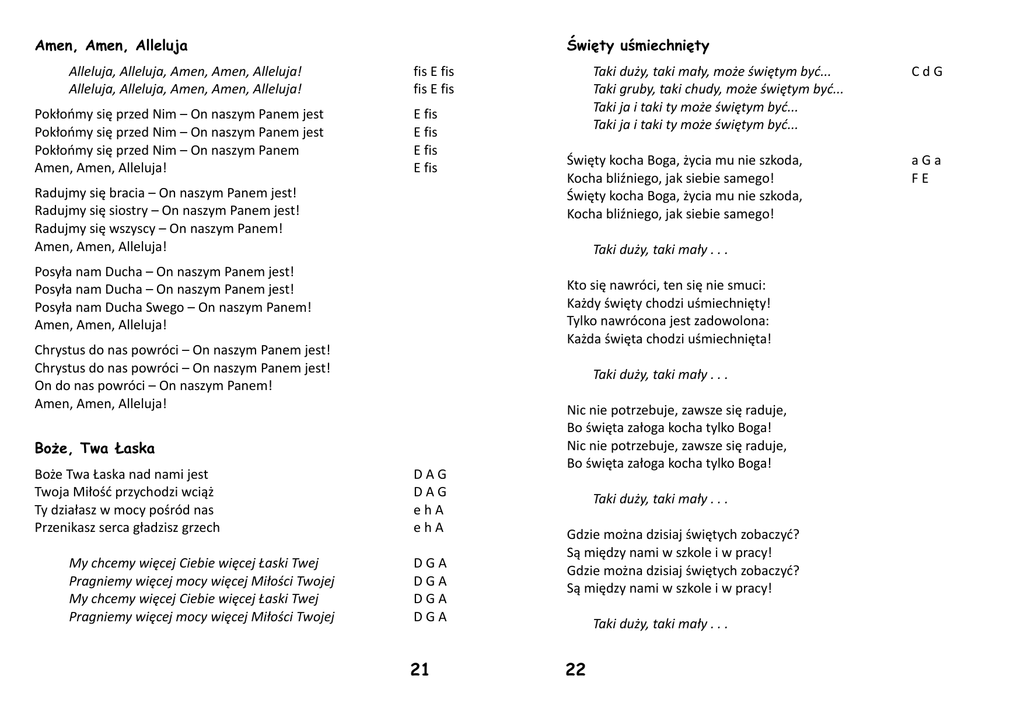 Amen, Amen, Alleluja Alleluja, Alleluja, Amen, Amen, Alleluja! Alleluja, Alleluja, Amen, Amen, Alleluja! Pokłońmy się przed Nim – On naszym Panem jest Pokłońmy się przed Nim – On naszym Panem jest Pokłońmy się przed Nim – On naszym Panem Amen, Amen, Alleluja! Święty uśmiechnięty fis E fis fis E fis E fis E fis E fis E fis Radujmy się bracia – On naszym Panem jest! Radujmy się siostry – On naszym Panem jest! Radujmy się wszyscy – On naszym Panem! Amen, Amen, Alleluja! Kto się nawróci, ten się nie smuci: Każdy święty chodzi uśmiechnięty! Tylko nawrócona jest zadowolona: Każda święta chodzi uśmiechnięta! Chrystus do nas powróci – On naszym Panem jest! Chrystus do nas powróci – On naszym Panem jest! On do nas powróci – On naszym Panem! Amen, Amen, Alleluja! Taki duży, taki mały . . . Boże, Twa Łaska My chcemy więcej Ciebie więcej Łaski Twej Pragniemy więcej mocy więcej Miłości Twojej My chcemy więcej Ciebie więcej Łaski Twej Pragniemy więcej mocy więcej Miłości Twojej Święty kocha Boga, życia mu nie szkoda, Kocha bliźniego, jak siebie samego! Święty kocha Boga, życia mu nie szkoda, Kocha bliźniego, jak siebie samego! Taki duży, taki mały . . . Posyła nam Ducha – On naszym Panem jest! Posyła nam Ducha – On naszym Panem jest! Posyła nam Ducha Swego – On naszym Panem! Amen, Amen, Alleluja! Boże Twa Łaska nad nami jest Twoja Miłość przychodzi wciąż Ty działasz w mocy pośród nas Przenikasz serca gładzisz grzech Taki duży, taki mały, może świętym być... Taki gruby, taki chudy, może świętym być... Taki ja i taki ty może świętym być... Taki ja i taki ty może świętym być... DAG DAG ehA ehA DGA DGA DGA DGA 21 Nic nie potrzebuje, zawsze się raduje, Bo święta załoga kocha tylko Boga! Nic nie potrzebuje, zawsze się raduje, Bo święta załoga kocha tylko Boga! Taki duży, taki mały . . . Gdzie można dzisiaj świętych zobaczyć? Są między nami w szkole i w pracy! Gdzie można dzisiaj świętych zobaczyć? Są między nami w szkole i w pracy! Taki duży, taki mały . . . 22 CdG aGa FE