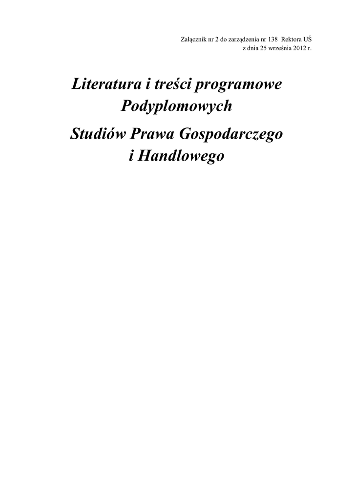 Załącznik nr 2 do zarządzenia nr 138 Rektora UŚ z dnia 25 września 2012 r. Literatura i treści programowe Podyplomowych Studiów Prawa Gospodarczego i Handlowego ZAŁOŻENIA ORGANIZACYJNO - PROGRAMOWE Opis zakładanych efektów kształcenia na studiach podyplomowych Nazwa studiów: Podyplomowe Studia Prawa Gospodarczego i Handlowego Typ studiów: doskonalące Forma studiów: niestacjonarne Efekty kształcenia dla studiów podyplomowych WIEDZA Posiada wiedzę z zakresu prawa gospodarczego i handlowego, prawa cywilnego, prawa spółek europejskiego prawa spółek, prawa publicznego gospodarczego, prawa podatkowego, prawa pracy. Ma wiedzę w zakresie zawierania i wykonywania umów gospodarczych. Posiada wiedzę w stopniu potrzebnym do oceny przesłanek zawarcia układu w postępowaniu upadłościowym oraz zgłoszenia wniosku o wszczęcie postępowania upadłościowego w przedmiocie ogłoszenia upadłości; odnośnie podmiotów występujących w upadłości; sąd, sędzia komisarz; upadły i wierzyciele; syndyk, zarządca, nadzorca sądowy. Ma wiedzę w zakresie powstawania i wygasania zobowiązań podatkowych. Zna konstrukcje podatków, składających się na polski system podatkowy; UMIEJĘTNOŚCI Potrafi wykorzystać metodę dogmatyczną przy formułowaniu opinii i wniosków. Jest przygotowany do samodzielnego opracowania zadanego tematu badawczego. Umie korzystać z orzecznictwa sądowego w zakresie prawa gospodarczego i handlowego, prawa cywilnego, prawa pracy prawa podatkowego oraz piśmiennictwa w tym zakresie. Potrafi sklasyfikować podatki. Ma umiejętność wypełnienia formularza zeznania podatkowego KOMPETENCJE SPOŁECZNE Posiada umiejętność odnalezienia właściwej regulacji prawnej odnoszącej się do określonego stanu faktycznego, dokonać ich przydatności dla rozstrzygnięcia konkretnej sprawy i na tej podstawie prognozować możliwe rozstrzygnięcia, jak tez zaproponować własne rozwiązanie. Posiada umiejętność zespołowego rozwiązywania wątpliwości powstających na tle interpretacji przepisów prawa i orzecznictwa sądowego. Posiada umiejętność zespołowego rozwiązywania wątpliwości powstających na tle interpretacji przepisów prawa i orzecznictwa sądowego. Zna organizację i funkcjonowanie spółek handlowych w obrocie gospodarczym. Potrafi rozwiązywać konflikty związane z redukcją zatrudnienia w procesach restrukturyzacji upadłego. Ma świadomość ważności tworzenia budżetu jako podstawowego planu finansowego. Rozumie konieczność odprowadzania danin publicznych. Nazwa przedmiotu/modułu kształcenia*) Język przedmiotu/modułu kształcenia*) Efekty kształcenia dla przedmiotu/modułu kształcenia*) (wiedza, umiejętności, kompetencje społeczne) Semestr, w którym przedmiot/moduł*) jest realizowany PRAWO CYWILNE Język polski Wiedza: - Ma wiedzę w zakresie źródeł i podstawowych instytucji prawa cywilnego; - Zna przesłanki ważności i skuteczności czynności prawnych (w szczególności umów); - Zna treść praw rzeczowych Umiejętności: - Potrafi sformułować treść umowy; - Umie korzystać ze źródeł prawa cywilnego; - Potrafi odnaleźć regulacje prawne z zakresu prawa cywilnego i dokonać ich przydatności do rozstrzygnięcia danej sprawy Kompetencje społeczne: - Ma świadomość konsekwencji i ryzyk związanych z zawarciem umów; - Rozumie konieczność pogłębiania swej wiedzy z zakresu prawa cywilnego. SEMESTR I i SEMESTR II Forma realizacji zajęć Wykład tradycyjny powiązany z rozwiązywaniem wybranych zagadnień praktycznych Wymagania wstępne i dodatkowe Brak Rodzaj i liczba godzin zajęć dydaktycznych wymagających bezpośredniego udziału nauczyciela akademickiego i słuchaczy Liczba punktów ECTS przypisana przedmiotowi/modułowi*) 45 godzin wykładów 11 Stosowane metody dydaktyczne Wykład wspomagany analizą aktów prawnych i orzecznictwa. W ramach pracy własnej słuchacz powinien sporządzić projekt umowy oparty na założeniach przedstawionych przez wykładowcę oraz zapoznać się z ustawami pozakodeksowymi I wskazanymi orzeczeniami Sądu Najwyższego. Sposób weryfikacji efektów kształcenia uzyskanych przez słuchaczy Słuchacz po zapoznaniu się z treścią Kodeksu cywilnego i innych ustaw oraz wskazanych orzeczeń (praca własna słuchacza) potrafi wskazać rozwiązanie prostych zagadnień z zakresu prawa cywilnego. Słuchacz potrafi przygotować projekt prostej umowy. Forma i warunki zaliczenia przedmiotu/modułu*), w tym zasady dopuszczenia do egzaminu, zaliczenia ZALICZENIE 1. Źródła prawa cywilnego 2. Podmioty prawa cywilnego 3. Czynności prawne i przesłanki ich ważności 4. Zawieranie umów 5. Przedstawicielstwo 6. Przedawnienie 7. Umowy zobowiązaniowe i ich treść 8. Odpowiedzialność kontraktowa 9. Wygaśnięcie zobowiązań 10. Zmiana wierzyciela lub dłużnika 11. Odpowiedzialność za długi spadkowe 12. Odpowiedzialność małżonków za zobowiązania 13. Pojęcie i przeniesienie własności 14. Ograniczone prawa rzeczowe 15. Użytkowanie wieczyste 16. Księgi wieczyste I własność lokali 17. Umowa sprzedaży 18. Umowa najmu I dzierżawy 19. Umowa o dzieło I zlecenie 20. Poręczenie I spółka cywilna Literatura podstawowa: A. Wolter, Prawo cywilne zarys części ogólnej Wykaz literatury obowiązkowej i uzupełniającej Z. Radwański, Prawo cywilne – część ogólna W. Czachórski i inni, Zobowiązania E. Gniewek, Prawo rzeczowe Literatura uzupełniająca: E. Gniewek (red.), Podstawy prawa cywilnego T. Smyczyński, Prawo rodzinne i opiekuńcze E. Skowrońska – Bocian, Prawo spadkowe Nazwa przedmiotu/modułu kształcenia*) Język przedmiotu/modułu kształcenia*) Prawo spółek polski Zna organizację i funkcjonowanie spółek handlowych w obrocie gospodarczym. Efekty kształcenia dla przedmiotu/modułu kształcenia*) (wiedza, umiejętności, kompetencje społeczne) Potrafi wykorzystać metodę dogmatyczną przy formułowaniu opinii i wniosków. Posiada umiejętn