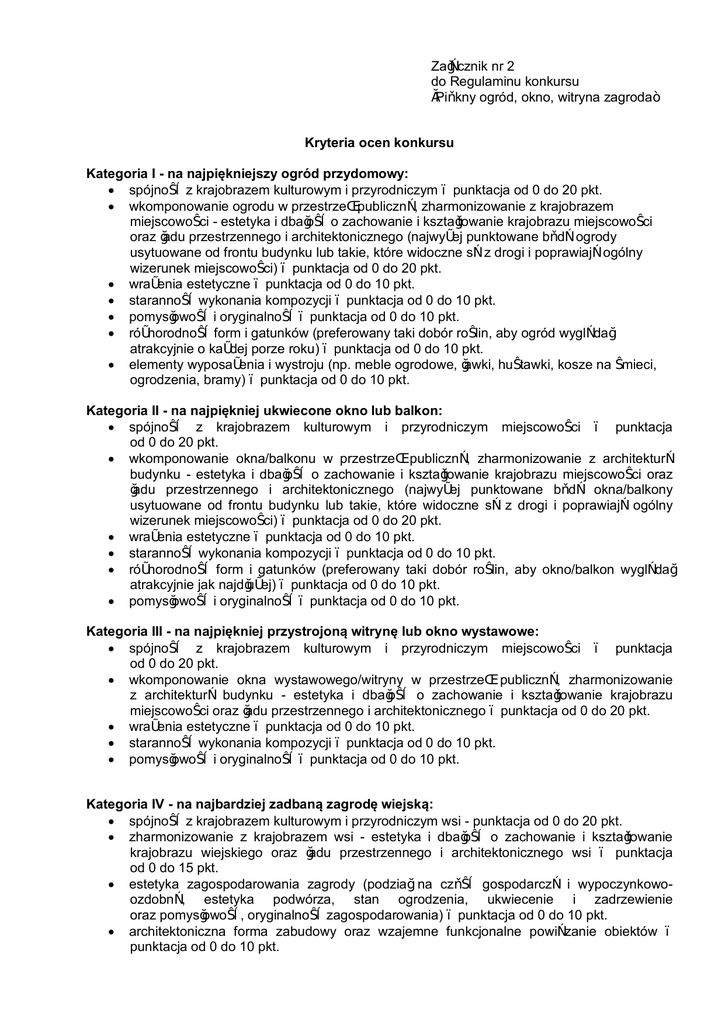 Załącznik nr 2 do Regulaminu konkursu „Piękny ogród, okno, witryna zagroda” Kryteria ocen konkursu Kategoria I - na najpiękniejszy ogród przydomowy: · spójność z krajobrazem kulturowym i przyrodniczym – punktacja od 0 do 20 pkt. · wkomponowanie ogrodu w przestrzeń publiczną, zharmonizowanie z krajobrazem miejscowości - estetyka i dbałość o zachowanie i kształtowanie krajobrazu miejscowości oraz ładu przestrzennego i architektonicznego (najwyżej punktowane będą ogrody usytuowane od frontu budynku lub takie, które widoczne są z drogi i poprawiają ogólny wizerunek miejscowości) – punktacja od 0 do 20 pkt. · wrażenia estetyczne – punktacja od 0 do 10 pkt. · staranność wykonania kompozycji – punktacja od 0 do 10 pkt. · pomysłowość i oryginalność – punktacja od 0 do 10 pkt. · różnorodność form i gatunków (preferowany taki dobór roślin, aby ogród wyglądał atrakcyjnie o każdej porze roku) – punktacja od 0 do 10 pkt. · elementy wyposażenia i wystroju (np. meble ogrodowe, ławki, huśtawki, kosze na śmieci, ogrodzenia, bramy) – punktacja od 0 do 10 pkt. Kategoria II - na najpiękniej ukwiecone okno lub balkon: · spójność z krajobrazem kulturowym i przyrodniczym miejscowości – punktacja od 0 do 20 pkt. · wkomponowanie okna/balkonu w przestrzeń publiczną, zharmonizowanie z architekturą budynku - estetyka i dbałość o zachowanie i kształtowanie krajobrazu miejscowości oraz ładu przestrzennego i architektonicznego (najwyżej punktowane będą okna/balkony usytuowane od frontu budynku lub takie, które widoczne są z drogi i poprawiają ogólny wizerunek miejscowości) – punktacja od 0 do 20 pkt. · wrażenia estetyczne – punktacja od 0 do 10 pkt. · staranność wykonania kompozycji – punktacja od 0 do 10 pkt. · różnorodność form i gatunków (preferowany taki dobór roślin, aby okno/balkon wyglądał atrakcyjnie jak najdłużej) – punktacja od 0 do 10 pkt. · pomysłowość i oryginalność – punktacja od 0 do 10 pkt. Kategoria III - na najpiękniej przystrojoną witrynę lub okno wystawowe: · spójność z krajobrazem kulturowym i przyrodniczym miejscowości – punktacja od 0 do 20 pkt. · wkomponowanie okna wystawowego/witryny w przestrzeń publiczną, zharmonizowanie z architekturą budynku - estetyka i dbałość o zachowanie i kształtowanie krajobrazu miejscowości oraz ładu przestrzennego i architektonicznego – punktacja od 0 do 20 pkt. · wrażenia estetyczne – punktacja od 0 do 10 pkt. · staranność wykonania kompozycji – punktacja od 0 do 10 pkt. · pomysłowość i oryginalność – punktacja od 0 do 10 pkt. Kategoria IV - na najbardziej zadbaną zagrodę wiejską: · spójność z krajobrazem kulturowym i przyrodniczym wsi - punktacja od 0 do 20 pkt. · zharmonizowanie z krajobrazem wsi - estetyka i dbałość o zachowanie i kształtowanie krajobrazu wiejskiego oraz ładu przestrzennego i architektonicznego wsi – punktacja od 0 do 15 pkt. · estetyka zagospodarowania zagrody (podział na część gospodarczą i wypoczynkowoozdobną, estetyka podwórza, stan ogrodzenia, ukwiecenie i zadrzewienie oraz pomysłowość, oryginalność zagospodarowania) – punktacja od 0 do 10 pkt. · architektoniczna forma zabudowy oraz wzajemne funkcjonalne powiązanie obiektów – punktacja od 0 do 10 pkt. · · · · · stan techniczny i estetyka budynków – punktacja od 0 do 10 pkt. zachowanie tradycyjnych form w architekturze i urządzeniu posesji– punktacja od 0 do 10 pkt. usytuowanie oraz zabezpieczenie obiektów sanitarnych (lokalizacja i właściwe zabezpieczenie szamba, śmietnika, kompostowni) – punktacja od 0 do 10 pkt. stan sanitarny urządzeń i budynków służących do produkcji rolnej – punktacja od 0 do 10 pkt. sposób zagospodarowania odpadów roślinnych i odchodów zwierzęcych (zbiorniki na gnojowicę, miejsce składowania obornika lub kompostu) – punktacja od 0 do 10 pkt.