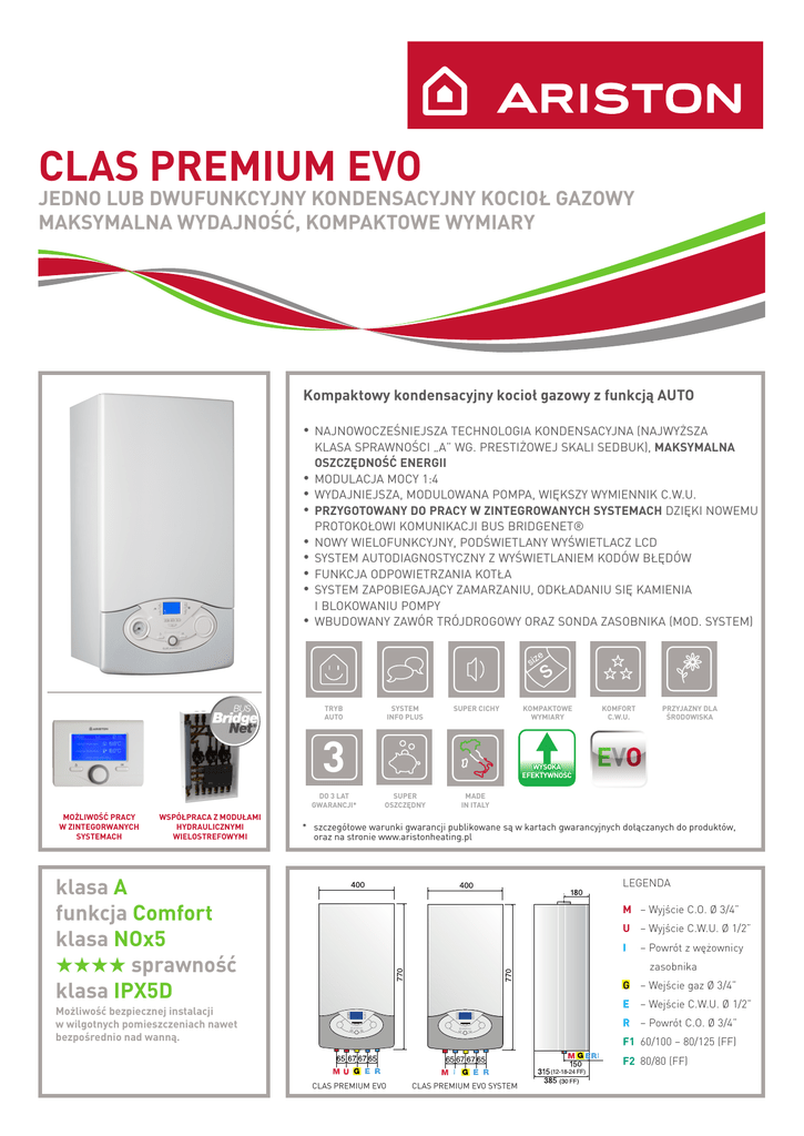 CLAS PREMIUM EVO JEDNO LUB DWUFUNKCYJNY Kondensacyjny KOCIOŁ GAZOWY Maksymalna wydajność, kompaktowe wymiary Kompaktowy kondensacyjny kocioł gazowy z funkcją AUTO •• najnowocześniejsza technologia kondensacyjna (najwyższa klasa sprawności „A” wg. prestiżowej skali SEDBUK), MAKSYMALNA OSZCZĘDNOŚĆ ENERGII •• modulacja mocy 1:4 •• wydajniejsza, modulowana pompa, WIĘKSZY WYMIENNIK C.W.U. •• PRZYGOTOWANY DO PRACY W zintegrowanych SYSTEMach DZIĘKI NOWEMU PROTOKOŁOWi KOMUNIKACJI BUS BRIDGENET® •• nowy wielofunkcyjny, podświetlany wyświetlacz lcd •• SYSTEM AUTODIAGNOSTYCZNY Z WYŚWIETLANIEM KODÓW BŁĘDÓW •• FUNKCJA ODPOWIETRZANIA KOTŁA •• SYSTEM ZAPOBIEGAJĄCY ZAMARZANIU, ODKŁADANIU SIĘ KAMIENIA I BLOKOWANIU POMPY •• wbudowany zawór trójdrogowy oraz sonda zasobnika (mod. system) TRYB AUTO SYSTEM INFO PLUS SUPER CICHY 3 DO 3 LAT GWARANCJI* MOŻLIWOŚĆ PRACY W ZINTEGORWANYCH SYSTEMACH WSPÓŁPRACA Z MODUŁAMI HYDRAULICZNYMI WIELOSTREFOWYMI KOMPAKTOWE WYMIARY KOMFORT C.W.U. PRZYJAZNY DLA ŚRODOWISKA WYSOKA EFEKTYWNOŚĆ SUPER OSZCZĘDNY MADE IN ITALY * szczegółowe warunki gwarancji publikowane są w kartach gwarancyjnych dołączanych do produktów, oraz na stronie www.aristonheating.pl klasa A funkcja Comfort klasa NOx5 sprawność klasa IPX5D LEGENDA M – Wyjście C.O.Ø 3/4” U – Wyjście C.W.U. Ø 1/2” I – Powrót z wężownicy zasobnika G – Wejście gazØ 3/4” E – Wejście C.W.U. Ø 1/2” Możliwość bezpiecznej instalacji w wilgotnych pomieszczeniach nawet bezpośrednio nad wanną. R – Powrót C.O.Ø 3/4” F1 60/100 – 80/125 (FF) I 65 67 I CLAS PREMIUM EVO CLAS PREMIUM EVO SYSTEM (12-18-24 FF) F2 80/80 (FF) CLAS PREMIUM EVO | SYSTEM Dane techniczne KOMORA MOC I SPRAWNOŚĆ Maks./min znamionowa moc cieplna Maks./min moc cieplna w trybie c.w.u. Maks./min moc centralnego ogrzewania Sprawność przy znamionowej mocy cieplnej (60/80 °C) Sprawność przy 30% znamionowej mocy cieplnej Liczba gwiazdek sprawności (Dyrektywa 92/42/EEC) Klasa SEDBUK Strata kominowa przy działającym palniku POZIOMY EMISJI Maksymalny wydatek spalin (gaz GZ 50) Temperatura spalin (gaz GZ 50) Dostępne ciśnienie powietrza Zawartość CO2 (gaz GZ 50) Zawartość CO (0%O2) Zawartość O2 (gaz GZ 50) NOx klasa Nadwyżka powietrza DANE CHARAKTERYSTYCZNE Minimalna temperatura w pomieszczeniu CHARAKTERYSTYKI UKŁADU C.O. Maks./min temperatura w układzie c.o. Maks./min temperatura w układzie c.o. (ogrzewanie niskotemperaturowe) Pojemność naczynia wzbiorczego Ciśnienie wstępne naczynia wzbiorczego Maks./min ciśnienie w układzie c.o. CHARAKTERYSTYKI UKŁADU C.W.U. Maks./min temperatura c.w.u. Przepływ c.w.u. przy ∆T=25°C Przepływ c.w.u. przy ∆T=35°C Liczba gwiazdek komfortu c.w.u. (EN 13203) Minimalny pobór c.w.u. Maks./min ciśnienie w układzie c.w.u. 24 FF 24 FF 24 FF SYSTEM zamknięta zamknięta Wykres oporów przepływu przez kocioł 1 krzywa prędkość minimalna mbar 2 krzywa prędkość maksymalna 600 500 kW kW kW 22,0/5,5 22,0/5,5 25,4/5,4 23,3/5,7 25,4/5,4 23,3/5,7 % 97,8 97,8 200 % 107,7 107,7 100 klasa % A 2,2 A 2,2 kg/h °C Pa % ppm % klasa % 42,8 64 100 9,0 119 4,5 5 27 42,8 64 100 9,0 119 4,5 5 27 5 5 °C 400 300 1 2 100 200 300 400 500 600 700 800 900 1000 1100 1200 1300 przepływ l/h wylot spalin/zasysanie powietrza system koncentryczny °C 82/35 82/35 °C l bar bar 45/20 45/20 6,5 1 3 6,5 1 3 °C l/min l/min 60/36 14,5 10,4 <2 7/0,3 l/min bar PARAMETRY ELEKTRYCZNE Napięcie/częstotliwość zasilania Pobór mocy Stopień ochrony instalacji elektrycznej V/H W IP 230 / 50 110 X5D CIĘŻAR I WYMIARY Ciężar Wymiary (Wys. H x Szer. W x Długość D) kg mm 32 770x400x315 * przy zastosowaniu zasobnika Ariston np. BCH 120 z kotłem Genus Premium EVO System (kocioł jednofunkcyjny) System koncentryczny System rozdzielny Ø60/100: do 12 m (24kW) Ø80/80: do 60 m (24 kW) Ø80/125: do 36 m (24kW) ARISTON THERMO GROUP Ariston Thermo Polska Sp. z o.o. 31-408 Kraków, ul. Pocieszka 3 Tel. 12 420 22 20, Fax 12 420 52 72 E-mail: [email protected] www.aristonheating.pl 60/40* — — — — — punkt analizy spalin Przyłącze zasysania powietrza dla systemu rozdzielnego 230 / 50 110 X5D 32 770x400x315 Przykładowy pakiet: jednofunkcyjny kondensacyjny kocioł Clas Premium Evo System 24 + zasobnik BCH 120 litrów