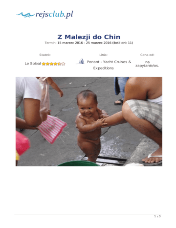 Z Malezji do Chin Termin: 15 marzec 2016 - 25 marzec 2016 (ilość dni: 11) Statek: Le Soleal Linia: Ponant - Yacht Cruises & Expeditions Cena od: na zapytanie/os. 1 z3 TRASA REJSU Data Port Wpłynięcie Wypłynięcie Legenda dzień 1 wtorek 15.03.2016 Kota Kinabalu, Borneo Malezja --:-- 18:00 dzień 2 środa 16.03.2016 Sandakan Malezja 12:00 19:00 dzień 3 czwartek 17.03.2016 Puerto Princesa Filipiny 18:00 --:-- dzień 4 piątek 18.03.2016 Puerto Princesa Filipiny --:-- 18:00 dzień 5 sobota 19.03.2016 El Nido Filipiny 09:00 19:00 dzień 6 niedziela 20.03.2016 Coron Filipiny 07:00 13:00 dzień 7 poniedziałek 21.03.2016 Manila Filipiny 06:00 00:00 dzień 8 wtorek 22.03.2016 Dzień na morzu --:-- --:-- dzień 9 środa 23.03.2016 Dzień na morzu --:-- --:-- dzień 10 czwartek 24.03.2016 Hongkong Chiny 06:00 --:-- dzień 11 piątek 25.03.2016 Hongkong Chiny --:-- --:-- 2 z3 CENNIK Cena katalogowa Kabina zewnętrzna z oknem €3 680.00 Kabina zewnętrzna z balkonem od €4 000.00 Suite (apartament) od €5 450.00 Kabina jednoosobowa 3 osoba dorosła w kabinie dziecko od 8 do 11 lat jako 3 osoba w kabinie Opłaty portowe Cena promocyjna +30% od €1 840.00 gratis €500.00 Uwaga! Ceny za osobę w kabinie dwuosobowej. Cena zawiera: zakwaterowanie w kabinie wybranej kategorii; wyżywienie - 3 główne posiłki, przekąski między posiłkami; napoje - kawa, herbata, woda serwowana do posiłków, soki do śniadania i wino do lunchu i kolacji; serwis bagażowy podczas wejścia i zejścia ze statku; 24 - godzinny serwis kabinowy; korzystanie ze wszystkich urządzeń sportowo - rekreacyjnych znajdujących się na pokładzie statku (basen, jacuzzi, sala fitness, itp.); udział we wszystkich imprezach organizowanych na statku (przedstawienia w teatrze, koncerty, programy animacyjne itp.) oraz w koktajlu kapitańskim i kolacji galowej (stroje galowe nie są wymagane, ubiór typu sportowa elegancja). Cena nie zawiera: kosztów dojazdu do portu; opłat portowych; ewentualnych noclegów w hotelu przed / po rejsie i transferów; wycieczek fakultatywnych w trakcie rejsu; korzystania z barów oraz mini baru w kabinie; korzystania z punktów usługowych (fryzjer, pralnia, fotograf, salon piękności i odnowy biologicznej, internet) i wydatków osobistych; napiwków dla obsługi na statku; ubezpieczenia KL, NNW i bagaż; kosztu wymaganych wiz. 3 z3
