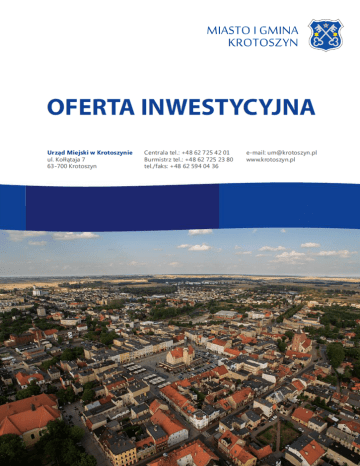 POLSKA 2 3 4 Krotoszyn położony jest w południowej części województwa wielkopolskiego, na granicy między Wielkopolską a Dolnym Śląskiem. Powierzchnia gminy wynosi 256 km², z tego na miasto przypadają 23 km². Mieszka tu 40.710 osób: w samym mieście 29.163, a w gminie 11.547. Początki miasta sięgają pierwszej połowy XV wieku. W roku 1415 Wierzbięta Krotoski, rycerz z wielkopolskiego rodu Łodziów, na mocy wcześniejszego przywileju Władysława Jagiełły dokonał lokacji Krotoszyna w miejscu, gdzie dziś znajduje się śródmieście miasta. Wytyczone wówczas rynek i główne ulice zachowały swój układ po dziś dzień. Po pożarze w 1453 r. prawa miejskie odnowił Kazimierz Jagiellończyk. W XVI wieku miasto przeszło w ręce rodu Rozdrażewskich. Zniszczone w czasie wojen szwedzkich odzyskało świetność w końcu XVII w. Świetność tę podkreślał ratusz, którego budowę ukończono około 1689 roku. Kolejni właściciele wzbogacili Krotoszyn o nowe obiekty architektoniczne. Ostatnimi byli członkowie niemieckiego rodu książęcego von Thurn und Taxis. Po wyzwoleniu 23 stycznia 1945 r. Krotoszyn pozostał siedzibą powiatu oraz władz miejsko-gminnych. W mieście wzniesiono szereg bloków mieszkalnych, a na obrzeżach powstały osiedla domków jednorodzinnych. Rozbudowano i zmodernizowano istniejące już wcześniej zakłady przemysłowe oraz pobudowano nowe przedsiębiorstwa. To właśnie tutaj swoją siedzibę ma kilka dużych i około 30 średnich firm reprezentujących przemysł metalowy, budowlany, spożywczy, odzieżowy, przemysł wyrobów parafinowych, farmaceutycznych, opakowań drewnianych i opakowań z tworzyw sztucznych. 1. 2. 3. 4. 5. 6. W gminie dominuje przemysł: maszynowy - produkcja części samochodowych (MAHLE Polska Sp. z o.o. - największy zakład w Krotoszynie zatrudniający ok. 3100 osób), produkcja urządzeń do transportu i przeróbki węgla (Fabryka Urządzeń Górniczych FUGOR Sp. z o.o.), lekki - produkcja konfekcji damskiej (Zakład Konfekcyjny TEOMINA S.A.), spożywczy - produkcja art. spożywczych (Zakład Mleczarski Nutricia Krotoszyn Sp. z o.o.), produkcja art. spożywczych i farmaceutycznych (P.P.H. EWA S.A.), sieć krotoszyńskich sklepów spożywczych DINO S.A., która swoje placówki posiada na terenie całej Polski drzewny - produkcja parkietów (Fabryka Parkietów Biadki Sp. z o.o.). chemia gospodarcza - produkcja świec (PRO-CANDLE, MAX-POL), inny - produkcja pudełek drewnianych, naczyń plastikowych (KREPEL CASSETTES Polska Sp. z o.o., GABI-PLAST), mebli warsztatowych, sprzętu transportowego (Przedsiębiorstwo JotKel Sp. z o.o. Sp.k.). Władze miasta wspierają działalność przedsiębiorstw, stosując od kilku lat ciągle dopracowywany system ulg w podatku od nieruchomości dla podmiotów rozpoczynających lub już prowadzących działalność gospodarczą oraz będąc udziałowcem SFPK w Gostyniu (poręczenia 5 kredytowe dla przedsiębiorców). Miasto i Gmina Krotoszyn oferuje nieruchomości pod inwestycje dot. przemysłu elektronicznego, lekkiego budowlanego, przetwórstwa rolno-spożywczego, hotelarstwa, gastronomii, transportu, handlu i usług. Bogato rozwinięta infrastruktura techniczna (łączność, drogi, kanalizacja, gazyfikacja, oczyszczalnia ścieków) stwarza warunki dla rozwoju gospodarczego. W gminie organizuje się dla dzieci w wieku od 3 do 6 lat, edukację przedszkolną w przedszkolach i oddziałach przedszkolnych w szkołach podstawowych. Ważnym elementem oświatowym są oddziały integracyjne, w których wychowaniem przedszkolnym objęte są dzieci ze specjalnymi potrzebami edukacyjnymi oraz zespoły wczesnego wspomagania rozwoju dzieci. Realizacja obowiązku szkolnego przebiega w 14 szkołach podstawowych i 8 gimnazjach. Do atrakcji Krotoszyna zaliczyć należy Krytą Pływalnię z Ośrodkiem Rehabilitacyjnym “WODNIK”, usytuowaną w trzy-kondygnacyjnym obiekcie o powierzchni 5505 m2 oraz oddaną do użytku w 2015 roku nowoczesną halę sportowo-widowiskową z pełnowymiarowym boiskiem do piłki ręcznej, koszykówki, siatkówki, piłki nożnej halowej. Sport odgrywa ogromną rolę w życiu każdego człowieka, jest również obecny w życiu krotoszyńskiej społeczności. Miasto organizuje zawody o zasięgu międzynarodowym, ogólnopolskim i regionalnym, w takich dyscyplinach jak: zapasy, sumo, karate, mityngi lekkoatletyczne, pływackie, zawody strzeleckie, wędkarskie, tenisa stołowego i ziemnego oraz rozgrywki w piłce nożnej, ręcznej, siatkówce i korfballu. Z myślą o miłośnikach aktywnego wypoczynku wytyczono i oznakowano kilka szlaków turystycznych, ścieżkę przyrodniczą i oddano do użytku 6 siłowni plenerowych. Gmina to także zabytki architektoniczne i rezerwaty przyrody. Kalendarz imprez kulturalnych obejmuje konkursy literackie, muzyczne, plastyczne, plenery malarskie, wystawy fotograficzne, koncerty, przeglądy teatralne i filmowe, festyny, turnieje tańca. Największą imprezą jest od 2013 roku KrotoFEST - Festiwal Aktywnych Sąsiadów, który odbywa się w sezonie letnim. KrotoFEST jest imprezą - wspólnym dziełem samorządu, jego jednostek organizacyjnych, rad osiedli i lokalnych stowarzyszeń, firm, okazją do zaprezentowania dorobku i zacieśnienia współpracy. Od ponad ćwierćwiecza miasto i gmina współpracuje z miastami partnerskimi w Niemczech, Holandii, Francji i na Litwie. Formalny kształt tej współpracy nadało podpisanie umów partnerskich z gminami: Brummen w Holandii (1989), Mejszagoła na Litwie (1992), Fontenay le Comte we Francji (1994), Dierdorf w Niemczech (1997) i Bucak w Turcji (2007). Dowodem ścisłej współpracy z tymi miastami jest wyróżnienie Krotoszyna w 2000 roku Dyplomem Rady Europy, w roku 2001 Honorową Flagą Rady Europy oraz Honorową Tablicą Rady Europy w roku 2005. Krotoszyn otrzymał pięciokrotnie tytuł i certyfikat „Gmina Fair Play” w roku 2004, 2005, 2006, 2007 i 2008, co pozwala gminie na bezterminowe korz