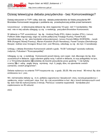 Region Gda ski NSZZ „Solidarno http://www.solidarnosc.gda.pl Dzisiaj telewizyjna debata prezydencka - bez Komorowskiego? Dzisiaj wieczorem w TVP1 odb dzie si debata pretendentów do fotela prezydenta RP. Bronisław Komorowski rezygnuje z poddania si przedwyborczej próbie przed kamerami. Uczestniczy w telewizyjnej debacie b dzie najpewniej 10 spo ród 11 kandydatów. Nie we mie w niej udziału ubiegaj cy si o reelekcj prezydent Bronisław Komorowski. W debacie w TVP uczestniczy b d : Andrzej Duda (PiS), Adam Jarubas (PSL), Janusz Palikom (lider dogorywaj cego na scenie politycznej Twojego Ruchu), Paweł Kukiz (przedstawiaj cy si jako kandydat antysystemowy), Janusz Korwin-Mikke (KORWiN), , Jacek Wilk (Kongres Nowej Prawicy), Marian Kowalski (Ruch Narodowy), Paweł Tanajno (Demokracja Bezpo rednia) oraz Grzegorz Braun (re yser filmowy, odwołuj cy si do my li narodowej). Unikaj c debaty Bronisław Komorowski udzieli o godz. 19.30 "solowego" wywiadu radiowej Jedynce, Polsatowi i "Rzeczpospolitej". Ubiegaj cy si o reelekcj Komorowski przed miesi cem wyja niał, dlaczego nie b dzie uczestniczył w debacie. Jego zdaniem gdyby wzi ł udział w debacie, to ona polegałoby na tym, e 10 kontrkandydatów „strzelałoby do bramki prezydenta przez godzin i nie byłoby szansy „na adn pogł bion wymian my li, pogl dów, na ujawnienie swoich zamiarów, swoich programów . Debata wyborcza na antenie TVP1rozpocznie si emitowana na ywo. o godz. 20.25. Ma ona trwa 90 minut. B dzie W ród tematów debaty s m.in. polityka zagraniczna i bezpiecze stwo, rozwój gospodarczy i społeczny, wizja i ustrój pa stwa. Ka dy z jej uczestników w ka dej z trzech tematycznych rund b dzie miał do wykorzystania 2 minuty. Pierwsza i ostatnia wypowied kandydata jest zaplanowana na 45 sekund. ASG 1/1 Powered by TCPDF (www.tcpdf.org)
