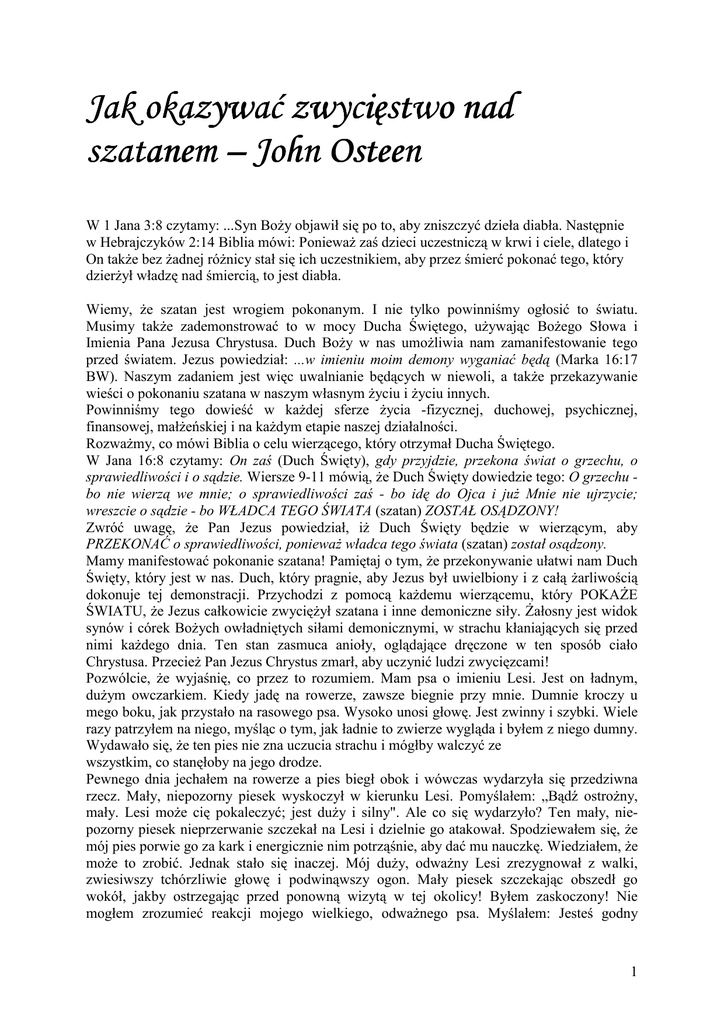 Jak okazywać zwycięstwo nad szatanem – John Osteen W 1 Jana 3:8 czytamy: ...Syn BoŜy objawił się po to, aby zniszczyć dzieła diabła. Następnie w Hebrajczyków 2:14 Biblia mówi: PoniewaŜ zaś dzieci uczestniczą w krwi i ciele, dlatego i On takŜe bez Ŝadnej róŜnicy stał się ich uczestnikiem, aby przez śmierć pokonać tego, który dzierŜył władzę nad śmiercią, to jest diabła. Wiemy, Ŝe szatan jest wrogiem pokonanym. I nie tylko powinniśmy ogłosić to światu. Musimy takŜe zademonstrować to w mocy Ducha Świętego, uŜywając BoŜego Słowa i Imienia Pana Jezusa Chrystusa. Duch BoŜy w nas umoŜliwia nam zamanifestowanie tego przed światem. Jezus powiedział: ...w imieniu moim demony wyganiać będą (Marka 16:17 BW). Naszym zadaniem jest więc uwalnianie będących w niewoli, a takŜe przekazywanie wieści o pokonaniu szatana w naszym własnym Ŝyciu i Ŝyciu innych. Powinniśmy tego dowieść w kaŜdej sferze Ŝycia -fizycznej, duchowej, psychicznej, finansowej, małŜeńskiej i na kaŜdym etapie naszej działalności. RozwaŜmy, co mówi Biblia o celu wierzącego, który otrzymał Ducha Świętego. W Jana 16:8 czytamy: On zaś (Duch Święty), gdy przyjdzie, przekona świat o grzechu, o sprawiedliwości i o sądzie. Wiersze 9-11 mówią, Ŝe Duch Święty dowiedzie tego: O grzechu bo nie wierzą we mnie; o sprawiedliwości zaś - bo idę do Ojca i juŜ Mnie nie ujrzycie; wreszcie o sądzie - bo WŁADCA TEGO ŚWIATA (szatan) ZOSTAŁ OSĄDZONY! Zwróć uwagę, Ŝe Pan Jezus powiedział, iŜ Duch Święty będzie w wierzącym, aby PRZEKONAĆ o sprawiedliwości, poniewaŜ władca tego świata (szatan) został osądzony. Mamy manifestować pokonanie szatana! Pamiętaj o tym, Ŝe przekonywanie ułatwi nam Duch Święty, który jest w nas. Duch, który pragnie, aby Jezus był uwielbiony i z całą Ŝarliwością dokonuje tej demonstracji. Przychodzi z pomocą kaŜdemu wierzącemu, który POKAśE ŚWIATU, Ŝe Jezus całkowicie zwycięŜył szatana i inne demoniczne siły. śałosny jest widok synów i córek BoŜych owładniętych siłami demonicznymi, w strachu kłaniających się przed nimi kaŜdego dnia. Ten stan zasmuca anioły, oglądające dręczone w ten sposób ciało Chrystusa. PrzecieŜ Pan Jezus Chrystus zmarł, aby uczynić ludzi zwycięzcami! Pozwólcie, Ŝe wyjaśnię, co przez to rozumiem. Mam psa o imieniu Lesi. Jest on ładnym, duŜym owczarkiem. Kiedy jadę na rowerze, zawsze biegnie przy mnie. Dumnie kroczy u mego boku, jak przystało na rasowego psa. Wysoko unosi głowę. Jest zwinny i szybki. Wiele razy patrzyłem na niego, myśląc o tym, jak ładnie to zwierze wygląda i byłem z niego dumny. Wydawało się, Ŝe ten pies nie zna uczucia strachu i mógłby walczyć ze wszystkim, co stanęłoby na jego drodze. Pewnego dnia jechałem na rowerze a pies biegł obok i wówczas wydarzyła się przedziwna rzecz. Mały, niepozorny piesek wyskoczył w kierunku Lesi. Pomyślałem: „Bądź ostroŜny, mały. Lesi moŜe cię pokaleczyć; jest duŜy i silny". Ale co się wydarzyło? Ten mały, niepozorny piesek nieprzerwanie szczekał na Lesi i dzielnie go atakował. Spodziewałem się, Ŝe mój pies porwie go za kark i energicznie nim potrząśnie, aby dać mu nauczkę. Wiedziałem, Ŝe moŜe to zrobić. Jednak stało się inaczej. Mój duŜy, odwaŜny Lesi zrezygnował z walki, zwiesiwszy tchórzliwie głowę i podwinąwszy ogon. Mały piesek szczekając obszedł go wokół, jakby ostrzegając przed ponowną wizytą w tej okolicy! Byłem zaskoczony! Nie mogłem zrozumieć reakcji mojego wielkiego, odwaŜnego psa. Myślałem: Jesteś godny 1 poŜałowania. Przy twojej zewnętrznej wielkości zaskakuje wewnętrzna małość". Wróciłem do domu ogromnie zawstydzony jego zaskakującym zachowaniem! Podobnie bywa z ludźmi. Czy nie jest smutne, Ŝe Bóg musi patrzeć, jak odrodzona z wielkiego ludu Pana Jezusa Chrystusa istota, będąca sprawiedliwością BoŜą, napełniona Duchem BoŜym, jak wielcy synowie i córki Boga, którzy zostali przeznaczeni do wiecznego panowania z Chrystusem, odwraca się i drŜy kaŜdego dnia przed nie liczącą się demoniczną siłą?! Biblia mówi, Ŝe w czasach ostatecznych powstaną szczególne doktryny demoniczne (l Tymoteusza 4:1). Szatan będzie śmiać się z tysięcy chrześcijan, potęŜni synowie i córki Boga zostaną zastraszeni przez siły szatańskie. Ludzie posiadający moc pokonywania demonów stale wycofują się i poddają w walce jak mój duŜy pies. Boją się napotykając osłabione siły demoniczne. Bóg w swoim Słowie powiedział, iŜ Duch Święty ułatwia nam MANIFESTOWANIE ŚWIATU, Ŝe władca tego świata (szatan) został osądzony (Jana 16:8-11). Z własnych Ŝyciowych doświadczeń wiem, co znaczy spieranie się i walka z szatanem. W kaŜdy moŜliwy sposób będzie próbował cię zwycięŜyć. Dopóki sam nie nauczysz się, jak go pokonywać, przejdziesz przez Ŝycie ogarnięty strachem. Kilka lat temu Bóg przyszedł do mnie w wizji. Przedstawił mi w trzech płaszczyznach obraz mojego konfliktu z szatanem. Pierwszą była mała bitwa, następną potęŜniejsza, a w trzeciej znajdowałem się w obecności samego szatana. Nazwałem go złym duchem i księciem tego świata, poniewaŜ w małym pokoju siedział na tronie, w atmosferze godności i mocy, jak ksiąŜę. Sam stałem w tej wizji przy drzwiach. Znajdował się tam równieŜ męŜczyzna próbujący dostać się do drzwi, by wyjść z pokoju, gdzie znajdował się diabeł. MęŜczyzna ów zagarniał powietrze i wykonywał ruchy pływaka, poruszał wolno rękami i nogami, próbując dostać się do drzwi. Człowiek ten walczył, próbując bezskutecznie opuścić pomieszczenie. Szatan patrzył na szamocącego się. Wszyscy znajdujący się w królestwie ciemności podlegają jego prawom. Obserwowanie opisanego wyŜej zdarzenia wywołało we mnie złość. Kiedy zrozumiałem, Ŝe ten człowiek nie wyjdzie stamtąd, powiedziałem: „Dobrze