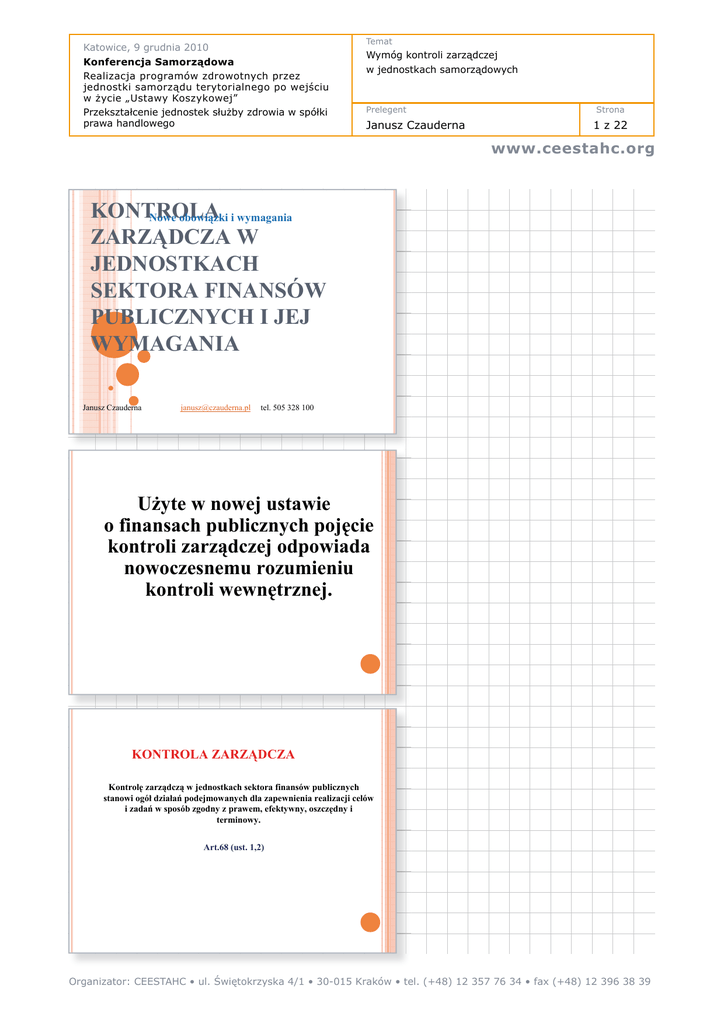 Katowice, 9 grudnia 2010 Konferencja Samorządowa Realizacja programów zdrowotnych przez jednostki samorządu terytorialnego po wejściu w życie „Ustawy Koszykowej” Przekształcenie jednostek służby zdrowia w spółki prawa handlowego Temat Wymóg kontroli zarządczej w jednostkach samorządowych Prelegent Janusz Czauderna Strona 1 z 22 www.ceestahc.org KONTROLA Nowe obowiązki i wymagania ZARZĄDCZA W JEDNOSTKACH SEKTORA FINANSÓW PUBLICZNYCH I JEJ WYMAGANIA Janusz Czauderna [email protected] tel. 505 328 100 UĪyte w nowej ustawie o finansach publicznych pojĊcie kontroli zarządczej odpowiada nowoczesnemu rozumieniu kontroli wewnĊtrznej. KONTROLA ZARZĄDCZA KontrolĊ zarządczą w jednostkach sektora finansów publicznych stanowi ogóá dziaáaĔ podejmowanych dla zapewnienia realizacji celów i zadaĔ w sposób zgodny z prawem, efektywny, oszczĊdny i terminowy. Art.68 (ust. 1,2) Organizator: CEESTAHC • ul. Świętokrzyska 4/1 • 30-015 Kraków • tel. (+48) 12 357 76 34 • fax (+48) 12 396 38 39 Katowice, 9 grudnia 2010 Konferencja Samorządowa Realizacja programów zdrowotnych przez jednostki samorządu terytorialnego po wejściu w życie „Ustawy Koszykowej” Przekształcenie jednostek służby zdrowia w spółki prawa handlowego Temat Wymóg kontroli zarządczej w jednostkach samorządowych Prelegent Janusz Czauderna Strona 2 z 22 www.ceestahc.org RÓĩNICE POMIĉDZY KONTROLA FINANSOWĄ A KONTROLĄ ZARZĄDCZĄ W USTAWACH Ustawa o finansach publicznych z dnia 30 czerwca 2005 r Art.47 ust.1 : Kontrola finansowa w jednostkach sektora finansów publicznych dotyczy procesów związanych z gromadzeniem i rozdysponowaniem Ğrodków publicznych oraz gospodarowaniem mieniem Ustawa o finansach publicznych z dnia 27 sierpnia 2009 r Art.68 ust.1 : KontrolĊ zarządczą w jednostkach sektora finansów publicznych stanowi ogóá dziaáaĔ podejmowanych dla zapewnienia realizacji celów i zadaĔ w sposób zgodny z prawem, efektywny, oszczĊdny i terminowy. RÓĩNICE POMIĉDZY KONTROLA FINANSOWĄ A KONTROLĄ ZARZĄDCZĄ W USTAWACH Ustawa o finansach publicznych z dnia 30 czerwca 2005 r Art.. 47 ust.2 : Kontrola finansowa obejmuje: 1) Przeprowadzenie wstĊpnej oceny celowoĞci zaciągania zobowiązaĔ finansowych i dokonywania wydatków; 2) Badanie i porównanie stanu faktycznego ze stanem wymaganym w zakresie dotyczącym procesów pobierania i gromadzenia Ğrodków publicznych, zaciągania zobowiązaĔ finansowych i dokonywania wydatków ze Ğrodków publicznych, udzielania zamówieĔ publicznych oraz zwrotu Ğrodków publicznych; 3) Prowadzenie gospodarki finansowej oraz stosowanie procedur dotyczących procesów, o których mowa w pkt.2. RÓĩNICE POMIĉDZY KONTROLA FINANSOWĄ A KONTROLĄ ZARZĄDCZĄ W USTAWACH Ustawa o finansach publicznych z dnia 27 sierpnia 2009 r Art.68 ust.2: 1) 2) 3) 4) 5) 6) 7) Celem kontroli zarządczej jest zapewnienie w szczególnoĞci: ZgodnoĞci dziaáalnoĞci z przepisami prawa oraz procedurami wewnĊtrznymi; SkutecznoĞci i efektywnoĞci dziaáania; WiarygodnoĞci sprawozdaĔ; Ochrony zasobów; Przestrzegania i promowania zasad etycznego postĊpowania; EfektywnoĞci i skutecznoĞci przepáywu informacji; Zarządzania ryzykiem. Organizator: CEESTAHC • ul. Świętokrzyska 4/1 • 30-015 Kraków • tel. (+48) 12 357 76 34 • fax (+48) 12 396 38 39 Katowice, 9 grudnia 2010 Konferencja Samorządowa Realizacja programów zdrowotnych przez jednostki samorządu terytorialnego po wejściu w życie „Ustawy Koszykowej” Przekształcenie jednostek służby zdrowia w spółki prawa handlowego Temat Wymóg kontroli zarządczej w jednostkach samorządowych Prelegent Janusz Czauderna Strona 3 z 22 www.ceestahc.org RÓĩNICE POMIĉDZY KONTROLA FINANSOWĄ A KONTROLĄ ZARZĄDCZĄ W USTAWACH Ustawa o finansach publicznych z dnia 30 czerwca 2005 r Art.47 ust.3: Kierownik jednostki ustala w formie pisemnej procedury kontroli finansowej biorąc pod uwagĊ standardy kontroli finansowej w jednostkach sektora finansów publicznych, oraz zapewnia ich przestrzeganie Ustawa o finansach publicznych z dnia 27 sierpnia 2009 r Art.69 ust.1: Zapewnienie funkcjonowania adekwatnej, skutecznej i efektywnej kontroli zarządczej naleĪy do obowiązków: 1) Ministra w kierowanych przez niego dziaáach administracji rządowej, 2) Wójta, burmistrza, prezydenta miasta, przewodniczącego zarządu jednostki samorządu terytorialnego, 3) Kierownika jednostki. Kontrola wewnĊ wewnĊtrzna (ang. internal control ) jest narzĊdziem zarządzania wykorzystywanym do uzyskania racjonalnej pewnoĞci , Īe cele zarządzania zostaáy siągniĊte. ( definicja INTOSAI - MiĊdzynarodowa Organizacja NajwyĪszych Organów Kontroli ) Kontrola finansowa jest elementem kontroli wewnĊtrznej. Organizacja kontroli zarządczej Organizator: CEESTAHC • ul. Świętokrzyska 4/1 • 30-015 Kraków • tel. (+48) 12 357 76 34 • fax (+48) 12 396 38 39 Katowice, 9 grudnia 2010 Konferencja Samorządowa Realizacja programów zdrowotnych przez jednostki samorządu terytorialnego po wejściu w życie „Ustawy Koszykowej” Przekształcenie jednostek służby zdrowia w spółki prawa handlowego Temat Wymóg kontroli zarządczej w jednostkach samorządowych Prelegent Janusz Czauderna Strona 4 z 22 www.ceestahc.org MODEL ZARZĄDZANIA BEZPIECZEēSTWEM SYSTEMEM INFORMACJI 10 OdpowiedzialnoĞü W ustawie z dnia 17 grudnia 2004 r o odpowiedzialnoĞci za naruszenie dyscypliny finansów publicznych (Dz.U. z 2005 r. Nr 14, poz.114 z póĨn. zm. ) w kilku miejscach stwierdza siĊ ,Īe naruszeniem dyscypliny finansów publicznych jest dopuszczenie przez kierownika jednostki do okreĞlonych naruszeĔ wskutek zaniedbania lub niewypeánienia obowiązków w zakresie kontroli zarządczej Art.68 Celem kontroli zarzą zarządczej jest zapewnienie w szczegó szczególnoĞ lnoĞci: 1) zgodnoĞci dziaáalnoĞci z przepisami prawa oraz procedurami wewnĊtrznymi; 2) skutecznoĞci i efektywnoĞci dziaáania; 3) wiarygodnoĞci sprawozdaĔ