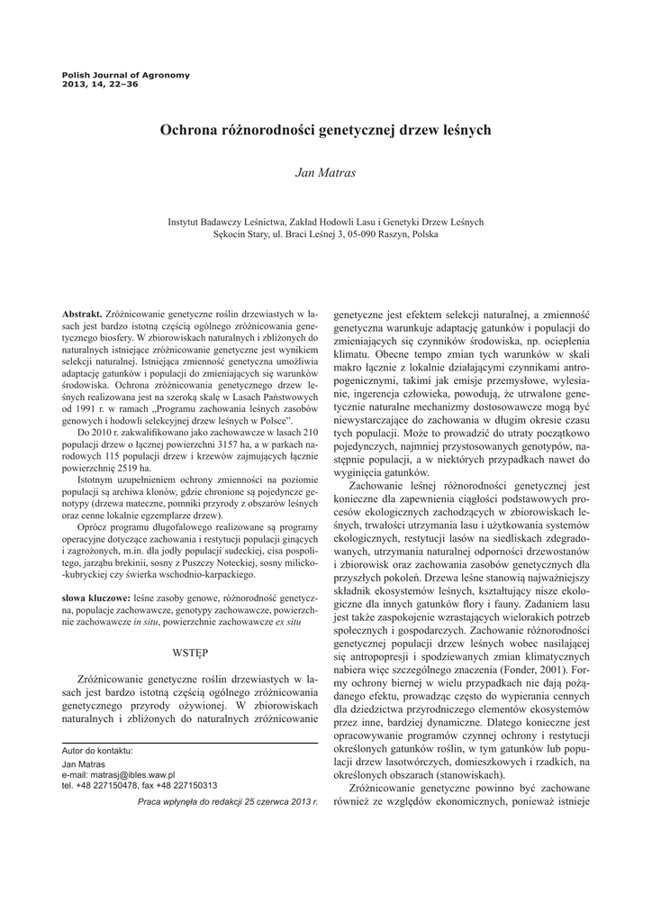 22 Polish Journal of Agronomy, No. 14, 2013 Polish Journal of Agronomy 2013, 14, 22–36 Ochrona różnorodności genetycznej drzew leśnych Jan Matras Instytut Badawczy Leśnictwa, Zakład Hodowli Lasu i Genetyki Drzew Leśnych Sękocin Stary, ul. Braci Leśnej 3, 05-090 Raszyn, Polska Abstrakt. Zróżnicowanie genetyczne roślin drzewiastych w lasach jest bardzo istotną częścią ogólnego zróżnicowania genetycznego biosfery. W zbiorowiskach naturalnych i zbliżonych do naturalnych istniejące zróżnicowanie genetyczne jest wynikiem selekcji naturalnej. Istniejąca zmienność genetyczna umożliwia adaptację gatunków i populacji do zmieniających się warunków środowiska. Ochrona zróżnicowania genetycznego drzew leśnych realizowana jest na szeroką skalę w Lasach Państwowych od 1991 r. w ramach „Programu zachowania leśnych zasobów genowych i hodowli selekcyjnej drzew leśnych w Polsce”. Do 2010 r. zakwalifikowano jako zachowawcze w lasach 210 populacji drzew o łącznej powierzchni 3157 ha, a w parkach narodowych 115 populacji drzew i krzewów zajmujących łącznie powierzchnię 2519 ha. Istotnym uzupełnieniem ochrony zmienności na poziomie populacji są archiwa klonów, gdzie chronione są pojedyncze genotypy (drzewa mateczne, pomniki przyrody z obszarów leśnych oraz cenne lokalnie egzemplarze drzew). Oprócz programu długofalowego realizowane są programy operacyjne dotyczące zachowania i restytucji populacji ginących i zagrożonych, m.in. dla jodły populacji sudeckiej, cisa pospolitego, jarząbu brekinii, sosny z Puszczy Noteckiej, sosny milicko-kubryckiej czy świerka wschodnio-karpackiego. słowa kluczowe: leśne zasoby genowe, różnorodność genetyczna, populacje zachowawcze, genotypy zachowawcze, powierzchnie zachowawcze in situ, powierzchnie zachowawcze ex situ WSTĘP Zróżnicowanie genetyczne roślin drzewiastych w lasach jest bardzo istotną częścią ogólnego zróżnicowania genetycznego przyrody ożywionej. W zbiorowiskach naturalnych i zbliżonych do naturalnych zróżnicowanie Autor do kontaktu: Jan Matras e-mail: [email protected] tel. +48 227150478, fax +48 227150313 Praca wpłynęła do redakcji 25 czerwca 2013 r. genetyczne jest efektem selekcji naturalnej, a zmienność genetyczna warunkuje adaptację gatunków i populacji do zmieniających się czynników środowiska, np. ocieplenia klimatu. Obecne tempo zmian tych warunków w skali makro łącznie z lokalnie działającymi czynnikami antropogenicznymi, takimi jak emisje przemysłowe, wylesianie, ingerencja człowieka, powodują, że utrwalone genetycznie naturalne mechanizmy dostosowawcze mogą być niewystarczające do zachowania w długim okresie czasu tych populacji. Może to prowadzić do utraty początkowo pojedynczych, najmniej przystosowanych genotypów, następnie populacji, a w niektórych przypadkach nawet do wyginięcia gatunków. Zachowanie leśnej różnorodności genetycznej jest konieczne dla zapewnienia ciągłości podstawowych procesów ekologicznych zachodzących w zbiorowiskach leśnych, trwałości utrzymania lasu i użytkowania systemów ekologicznych, restytucji lasów na siedliskach zdegradowanych, utrzymania naturalnej odporności drzewostanów i zbiorowisk oraz zachowania zasobów genetycznych dla przyszłych pokoleń. Drzewa leśne stanowią najważniejszy składnik ekosystemów leśnych, kształtujący nisze ekologiczne dla innych gatunków flory i fauny. Zadaniem lasu jest także zaspokojenie wzrastających wielorakich potrzeb społecznych i gospodarczych. Zachowanie różnorodności genetycznej populacji drzew leśnych wobec nasilającej się antropopresji i spodziewanych zmian klimatycznych nabiera więc szczególnego znaczenia (Fonder, 2001). Formy ochrony biernej w wielu przypadkach nie dają pożądanego efektu, prowadząc często do wypierania cennych dla dziedzictwa przyrodniczego elementów ekosystemów przez inne, bardziej dynamiczne. Dlatego konieczne jest opracowywanie programów czynnej ochrony i restytucji określonych gatunków roślin, w tym gatunków lub populacji drzew lasotwórczych, domieszkowych i rzadkich, na określonych obszarach (stanowiskach). Zróżnicowanie genetyczne powinno być zachowane również ze względów ekonomicznych, ponieważ istnieje J. Matras – Ochrona różnorodności genetycznej drzew leśnych wiele nierozpoznanych dotychczas właściwości genetycznych drzew, które w przyszłości będzie można z pożytkiem wykorzystać. Zasadniczymi przesłankami, które wpłynęły na poszerzenie działań w zakresie ochrony leśnej różnorodności genetycznej, były m.in. nasilające się w latach osiemdziesiątych ubiegłego wieku zagrożenia środowiska przyrodniczego, szczególnie zanieczyszczenia przemysłowe, powodujące na znacznych obszarach leśnych pogarszanie się stanu zdrowotnego lasu, lokalnie zamieranie drzewostanów m.in. w Sudetach Zachodnich, oraz uchwalenie na konferencji ministrów środowiska w Strasburgu rezolucji dotyczącej ochrony leśnych zasobów genowych w Europie (Rezolucja nr 2, 1990) i dokumentów uzupełniających (Follow-up Report I, 1998; Follow-up Report II, 1998) oraz „Konwencji o różnorodności biologicznej” (Konwencja, 1992), które zostały ratyfikowane przez Polskę. Działania te miały i mają w długim okresie czasu przywrócić stan równowagi środowiska przyrodniczego. Założenia koncepcji ochrony zasobów genowych opracowano w Polsce na początku lat dziewięćdziesiątych i wdrożono do realizacji, ale tylko w lasach państwowych w ramach „Programu ochrony leśnych zasobów genowych i hodowli selekcyjnej drzew leśnych w Polsce na lata 1991 -2010” (Matras i in., 1993, 2000). Pomimo ogólnej akceptacji i zrozumienia znaczenia działań w tym zakresie w kontekście przyjęcia programów zrównoważonej gospodarki w lasach oraz ratyfikacji przez Polskę m.in. „Konwencji o różnorodności biologicznej” jak do tej pory nie rozszerzono zakresu działań na pozos