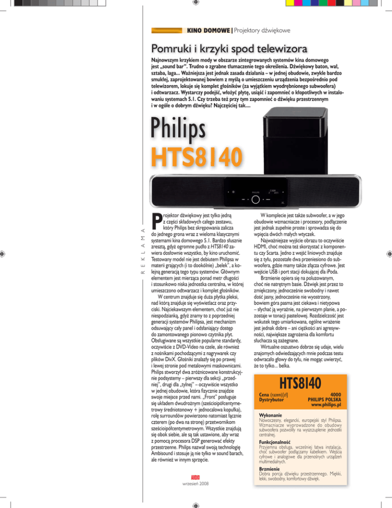 KINO DOMOWE Projektory dźwiękowe JESZCZE CIEPŁE Pomruki i krzyki spod telewizora Najnowszym krzykiem mody w obszarze zintegrowanych systemów kina domowego jest „sound bar”. Trudno o zgrabne tłumaczenie tego określenia. Dźwiękowy baton, wał, sztaba, laga... Ważniejsza jest jednak zasada działania – w jednej obudowie, zwykle bardzo smukłej, zaprojektowanej bowiem z myślą o umieszczeniu urządzenia bezpośrednio pod telewizorem, lokuje się komplet głośników (za wyjątkiem wyodrębnionego subwoofera) i odtwarzacz. Wystarczy podejść, włożyć płytę, usiąść i zapomnieć o kłopotliwych w instalowaniu systemach 5.1. Czy trzeba też przy tym zapomnieć o dźwięku przestrzennym i w ogóle o dobrym dźwięku? Najczęściej tak.... Philips R E K L A M A HTS8140 P rojektor dźwiękowy jest tylko jedną z części składowych całego zestawu, który Philips bez skrępowania zalicza do jednego grona wraz z wieloma klasycznymi systemami kina domowego 5.1. Bardzo słusznie zresztą, gdyż ogromne pudło z HTS8140 zawiera dosłownie wszystko, by kino uruchomić. Testowany model nie jest debiutem Philipsa w materii grających (i to dookólnie) „belek”, a kolejną generacją tego typu systemów. Głównym elementem jest mierząca ponad metr długości i stosunkowo niska jednostka centralna, w której umieszczono odtwarzacz i komplet głośników. W centrum znajduje się duża płytka pleksi, nad którą znajduje się wyświetlacz oraz przyciski. Najciekawszym elementem, choć już nie niespodzianką, gdyż znamy to z poprzedniej generacji systemów Philipsa, jest mechanizm odsuwający cały panel i odsłaniający dostęp do zamontowanego pionowo czytnika płyt. Obsługiwane są wszystkie popularne standardy, oczywiście z DVD-Video na czele, ale również z nośnikami pochodzącymi z nagrywarek czy plików DivX. Głośniki znalazły się po prawej i lewej stronie pod metalowymi maskownicami. Philips stworzył dwa zróżnicowane konstrukcyjnie podsystemy – pierwszy dla sekcji „przedniej”, drugi dla „tylnej” – oczywiście wszystko w jednej obudowie, która fizycznie znajdzie swoje miejsce przed nami. „Front” posługuje się układem dwudrożnym (sześcioipółcentymetrowy średniotonowy + jednocalowa kopułka), rolę surroundów powierzono natomiast łącznie czterem (po dwa na stronę) przetwornikom sześcioipółcentymetrowym. Wszystkie znajdują się obok siebie, ale są tak ustawione, aby wraz z pomocą procesora DSP generować efekty przestrzenne. Philips nazwał swoją technologię Ambisound i stosuje ją nie tylko w sound barach, ale również w innym sprzęcie. W komplecie jest także subwoofer, a w jego obudowie wzmacniacze i procesory, podłączenie jest jednak zupełnie proste i sprowadza się do wpięcia dwóch małych wtyczek. Najważniejsze wyjście obrazu to oczywiście HDMI, choć można też skorzystać z komponentu czy Scarta. Jedno z wejść liniowych znajduje się z tyłu, pozostałe dwa przeniesiono do subwoofera, gdzie mamy także złącza cyfrowe. Jest wejście USB i port stacji dokującej dla iPoda. Brzmienie opiera się na poluzowanym, choć nie natrętnym basie. Dźwięk jest przez to zmiękczony, jednocześnie swobodny i nawet dość jasny, jednocześnie nie wyostrzony, bowiem góra pasma jest ciekawa i nietypowa – słychać ją wyraźnie, na pierwszym planie, a pozostaje w tonacji pastelowej. Rozdzielczość jest wskutek tego umiarkowana, ogólne wrażenie jest jednak dobre – ani ciężkości ani agresywności, największe zagrożenia dla komfortu słuchacza są zażegnane. Wirtualne oszustwo dobrze się udaje, wielu znajomych odwiedzających mnie podczas testu odwracało głowy do tyłu, nie mogąc uwierzyć, że to tylko... belka. HTS8140 Cena (razem)[zł] Dystrybutor 4000 PHILIPS POLSKA www.philips.pl Wykonanie Nowoczesny, elegancki, europejski styl Philipsa. Wzmacniacze wyprowadzone do obudowy subwoofera pozwoliły na wyszczuplenie jednostki centralnej. Funkcjonalność Przyjemna obsługa, wcześniej łatwa instalacja, choć subwoofer podłączamy kabelkiem. Wejścia cyfrowe i analogowe dla przenośnych urządzeń multimedialnych. Brzmienie Dobra porcja dźwięku przestrzennego. Miękki, lekki, swobodny, komfortowy dźwięk. 48 wrzesień 2008 Na tylnej płycie najważniejsze jest wyjście HDMI, na którym może pojawić się sygnał 1080p. Są również gniazda komponent i kompozyt oraz dwa wejścia audio: jedno cyfrowe (światłowodowe), drugie analogowe RCA. Podręczne wejścia mamy jeszcze na jednym z boków urządzenia: port USB oraz mały jack dla przenośnego urządzenia audio, które dostarczy sygnał analogowy. HT-X810R może również współpracować ze źródłami Bluetooth, można więc cieszyć się muzyką z telefonu czy odtwarzacza MP3. Wśród odczytywanych formatów jest DVD-Audio, a także pliki DivX. Sound-bar z założenia ma być urządzeniem maksymalnie prostym w użyciu i instalacji, dlatego oprogramowanie graficzne menu użytkownika jest nieskomplikowane, daje dostęp wyłącznie do fundamentalnych kwestii. Prawdopodobnie i tak większość ograniczy się do podłączenia systemu i włożenia płyty, o menu oraz instrukcji w ogóle zapominając. Pilot jest zupełnie zwyczajny. Wydaje się, że przy tak innowacyjnym urządzeniu należałoby pomyśleć o bardziej wyrafinowanym sterowniku. Trzeba jednak powiedzieć, że da sobie radę z wieloma telewizorami popularnych marek. Subwoofer ma głośnik z boku, a wylot bas-refleksu z tyłu, sygnał z jednostki centralnej płynie do niego drogą radiową (!). Deklarowana odległość, na jaką można go odsunąć od jednostki centralnej to 10 m, ale producent zastrzega, że w przypadku wielu pracujących urządzeń w sieci bezprzewodowej dystans ten może być mniejszy. Samsung R E K L A M A U rządzenie ma umiarkowaną wysokość, jest też niezbyt głębokie, za to piekielnie szerokie, mniej więcej metrowe. Prawie całe czarne i błyszczące, bezwzględ