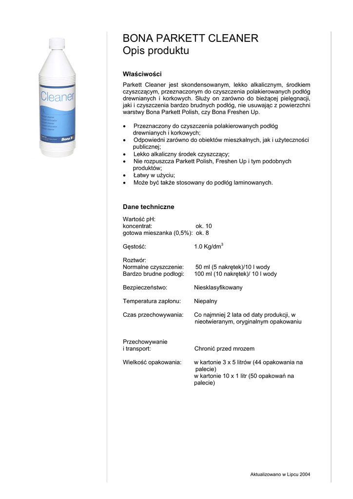 BONA PARKETT CLEANER Opis produktu Właściwości Parkett Cleaner jest skondensowanym, lekko alkalicznym, środkiem czyszczącym, przeznaczonym do czyszczenia polakierowanych podłóg drewnianych i korkowych. Służy on zarówno do bieżącej pielęgnacji, jaki i czyszczenia bardzo brudnych podłóg, nie usuwając z powierzchni warstwy Bona Parkett Polish, czy Bona Freshen Up. • • • • • • Przeznaczony do czyszczenia polakierowanych podłóg drewnianych i korkowych; Odpowiedni zarówno do obiektów mieszkalnych, jak i użyteczności publicznej; Lekko alkaliczny środek czyszczący; Nie rozpuszcza Parkett Polish, Freshen Up i tym podobnych produktów; Łatwy w użyciu; Może być także stosowany do podłóg laminowanych. Dane techniczne Wartość pH: koncentrat: ok. 10 gotowa mieszanka (0,5%): ok. 8 Gęstość: 1.0 Kg/dm3 Roztwór: Normalne czyszczenie: Bardzo brudne podłogi: 50 ml (5 nakrętek)/10 l wody 100 ml (10 nakrętek)/ 10 l wody Bezpieczeństwo: Niesklasyfikowany Temperatura zapłonu: Niepalny Czas przechowywania: Co najmniej 2 lata od daty produkcji, w nieotwieranym, oryginalnym opakowaniu Przechowywanie i transport: Wielkość opakowania: Chronić przed mrozem w kartonie 3 x 5 litrów (44 opakowania na palecie) w kartonie 10 x 1 litr (50 opakowań na palecie) Aktualizowano w Lipcu 2004