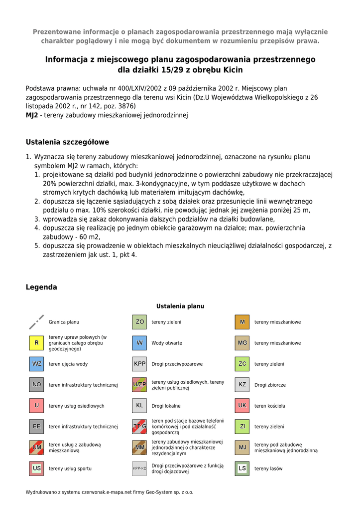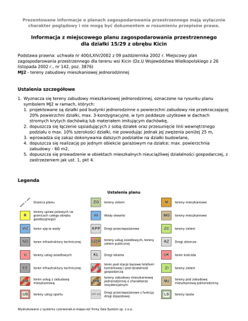 Prezentowane informacje o planach zagospodarowania przestrzennego mają wyłącznie charakter poglądowy i nie mogą być dokumentem w rozumieniu przepisów prawa. Informacja z miejscowego planu zagospodarowania przestrzennego dla działki 15/29 z obrębu Kicin Podstawa prawna: uchwała nr 400/LXIV/2002 z 09 października 2002 r. Miejscowy plan zagospodarowania przestrzennego dla terenu wsi Kicin (Dz.U Województwa Wielkopolskiego z 26 listopada 2002 r., nr 142, poz. 3876) MJ2 - tereny zabudowy mieszkaniowej jednorodzinnej Ustalenia szczegółowe 1. Wyznacza się tereny zabudowy mieszkaniowej jednorodzinnej, oznaczone na rysunku planu symbolem MJ2 w ramach, których: 1. projektowane są działki pod budynki jednorodzinne o powierzchni zabudowy nie przekraczającej 20% powierzchni działki, max. 3-kondygnacyjne, w tym poddasze użytkowe w dachach stromych krytych dachówką lub materiałem imitującym dachówkę, 2. dopuszcza się łączenie sąsiadujących z sobą działek oraz przesunięcie linii wewnętrznego podziału o max. 10% szerokości działki, nie powodując jednak jej zwężenia poniżej 25 m, 3. wprowadza się zakaz dokonywania dalszych podziałów na działki budowlane, 4. dopuszcza się realizację po jednym obiekcie garażowym na działce; max. powierzchnia zabudowy - 60 m2, 5. dopuszcza się prowadzenie w obiektach mieszkalnych nieuciążliwej działalności gospodarczej, z zastrzeżeniem jak ust. 1, pkt 4. Legenda Ustalenia planu Granica planu tereny zieleni tereny mieszkaniowe tereny upraw polowych (w granicach całego obrębu geodezyjnego) Wody otwarte tereny mieszkaniowe teren ujęcia wody Drogi przeciwpożarowe tereny zieleni teren infrastruktury technicznej tereny usług osiedlowych, tereny zieleni publicznej Drogi zbiorcze tereny usług osiedlowych Drogi lokalne teren kościoła teren infrastruktury technicznej teren pod stacje bazowe telefonii komórkowej i pod działalność gospodarczą tereny zieleni teren usług z zabudową mieszkaniową tereny zabudowy mieszkaniowej jednorodzinnej o charakterze rezydencjalnym tereny pod zabudowę mieszkaniową jednorodzinną tereny usług sportu Drogi przeciwpożarowe z funkcją drogi dojazdowej tereny lasów Wydrukowano z systemu czerwonak.e-mapa.net firmy Geo-System sp. z o.o. Drogi dojazdowe Ciągi pieszo-jezdne tereny wód teren działalności gospodarczej z zabudową mieszkaniową tereny zieleni Parkingi tereny zabudowy mieszkaniowej jednorodzinnej tereny usług innych tereny centralnego ośrodka usługowego teren usług oświaty tereny łąk i pastwisk tereny ogrodnictw z prawem zabudowy teren zabudowy mieszkaniowej jednorodzinnej teren obiektów towarzyszących zabytkowego kościoła tereny działalności gospodarczej Linia zabudowy nieprzekraczalna Nieprzekraczalna linia zabudowy Linia zabudow nieprzekraczalna Oznaczenia informacyjne Linie rozgraniczające postulowane Tereny infrastruktury technicznej urządzeń oczyszczania wód opadowych Projektowana zabudowa Istniejąca zabudowa Linia podziału wewnętrznego postulowana Granica parku krajobrazowego Ciągi piesze Linie energetyczne 15 KV Projektowany kanał sanitarny (wg dokumentacji) Linie energetyczne 110 kV / 220 kV Gazociąg w/c Granica strefy od gazociągu lub linii energetycznych Jednostki strukturalne dla których dopuszcza się zmiany układu przestrzennego Miejsce gromadzenia odpadów komunalnych Wydrukowano z systemu czerwonak.e-mapa.net firmy Geo-System sp. z o.o.