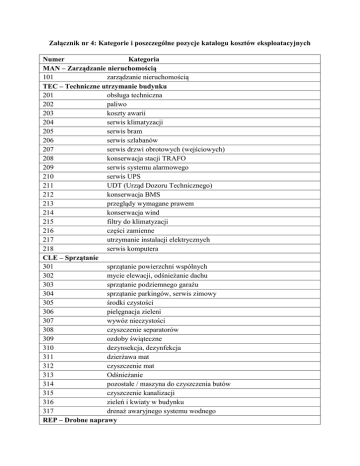Załącznik nr 4: Kategorie i poszczególne pozycje katalogu kosztów eksploatacyjnych Numer Kategoria MAN – Zarządzanie nieruchomością 101 zarządzanie nieruchomością TEC – Techniczne utrzymanie budynku 201 obsługa techniczna 202 paliwo 203 koszty awarii 204 serwis klimatyzacji 205 serwis bram 206 serwis szlabanów 207 serwis drzwi obrotowych (wejściowych) 208 konserwacja stacji TRAFO 209 serwis systemu alarmowego 210 serwis UPS 211 UDT (Urząd Dozoru Technicznego) 212 konserwacja BMS 213 przeglądy wymagane prawem 214 konserwacja wind 215 filtry do klimatyzacji 216 części zamienne 217 utrzymanie instalacji elektrycznych 218 serwis komputera CLE – Sprzątanie 301 sprzątanie powierzchni wspólnych 302 mycie elewacji, odśnieżanie dachu 303 sprzątanie podziemnego garażu 304 sprzątanie parkingów, serwis zimowy 305 środki czystości 306 pielęgnacja zieleni 307 wywóz nieczystości 308 czyszczenie separatorów 309 ozdoby świąteczne 310 dezynsekcja, dezynfekcja 311 dzierżawa mat 312 czyszczenie mat 313 Odśnieżanie 314 pozostałe / maszyna do czyszczenia butów 315 czyszczenie kanalizacji 316 zieleń i kwiaty w budynku 317 drenaż awaryjnego systemu wodnego REP – Drobne naprawy 400 drobne naprawy SEC – Ochrona i monitoring 501 połączenia telefoniczne 502 obsługa centrali telefonicznej 503 serwis CCTV 504 kontrola dostępu 505 ochrona fizyczna 506 ochrona ppoż 507 aktualizacja instrukcji ppoż 508 serwis systemu antywłamaniowego 509 przegląd sprzętu ppoż 510 ćwiczenia ewakuacyjne 511 czyszczenie kominów INS – Ubezpieczenie 601 ubezpieczenie budynku REC – Podatki i opłaty związane z nieruchomością 701 podatek od nieruchomości 702 użytkowanie wieczyste 703 dzierżawa przyłączy wodno-kanalizacyjnych 704 opłata za zajęcie pasa drogowego