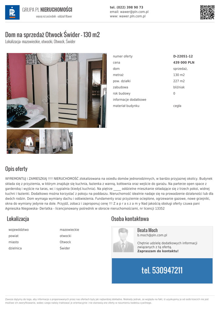 tel. (022) 398 90 73 email: [email protected] www: wawer.pln.com.pl Dom na sprzedaż Otwock Świder - 130 m2 Lokalizacja: mazowieckie, otwocki, Otwock, Świder numer oferty D-22051-12 cena 439 000 PLN dom sprzedaż, metraż 130 m2 pow. działki 227 m2 zabudowa bliźniak rok budowy 0 informacje dodatkowe materiał budynku cegła Opis oferty WYREMONTUJ i ZAMIESZKAJ !!!! NIERUCHOMOŚĆ zlokalizowana na osiedlu domów jednorodzinnych, w bardzo przyjaznej okolicy. Budynek składa się z przyziemia, w którym znajduje się kuchnia, łazienka z wanną, kotłownia oraz wejście do garażu. Na parterze open space z garderobą i wyjście na taras, wc i sypialnia (kiedyś kuchnia). Na piętrze _____ oddzielne mieszkanie składające się z trzech pokoi, widnej kuchni i łazienki. Dodatkowo można korzystać z pokoju na poddaszu. Nieruchomość idealnie nadaje się na prowadzenie działaności lub dla dwóch rodzin. Dom wymaga wymiany dachu i odświeżenia. Fundamenty oraz przyziemie ocieplone, ogrzewanie gazowe, nowe grzejniki, okna do wymiany jedynie na dole. Przyjdź, zobacz i zaproponuj cenę !!! Z a p r a s z a m y Nad jakością obsługi oferty czuwa pani Agnieszka Niegowska- Derlatka - licencjonowany pośrednik w obrocie nieruchomościami, nr licencji 13352 Lokalizacja Osoba kontaktowa Beata Moch województwo mazowieckie powiat otwocki [email protected] miasto Otwock dzielnica Świder Chętnie udzielę dodatkowych informacji związanych z tą ofertą. Zapraszam do kontaktu! tel. 530947211 Zawsze dążymy do tego, aby informacje o proponowanych przez nas ofertach były jak najbardziej dokładne. Niekiedy jednak, ze względu na fakt, iż uzyskujemy je od osób trzecich nie jest możliwe ich zweryfikowanie, wobec czego należy traktować je orientacyjnie i nie stanowią one oferty w rozumieniu kodeksu cywilnego.