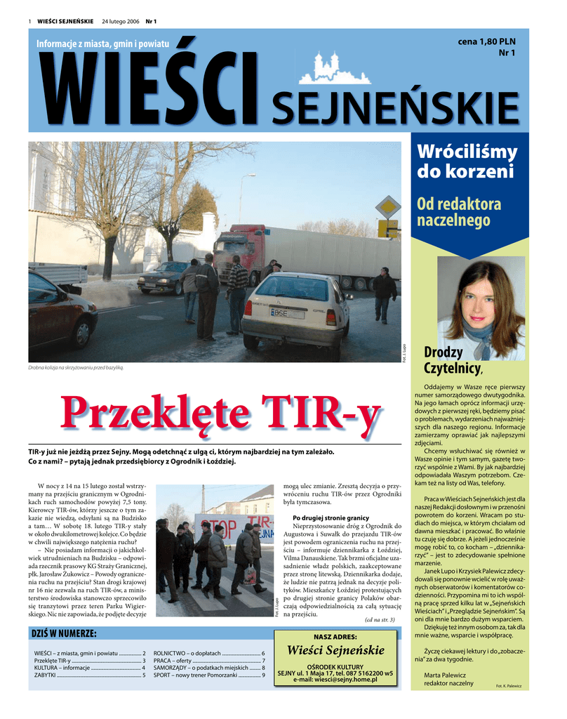 WIEŚCI SEJNEŃSKIE 24 lutego 2006 Nr 1 WIEŚCI SEJNEŃSKIE cena 1,80 PLN Nr 1 Informacje z miasta, gmin i powiatu Wróciliśmy do korzeni Fot. J. Lupo Od redaktora naczelnego Drobna kolizja na skrzyżowaniu przed bazyliką. Przeklęte TIR-y TIR-y już nie jeżdżą przez Sejny. Mogą odetchnąć z ulgą ci, którym najbardziej na tym zależało. Co z nami? – pytają jednak przedsiębiorcy z Ogrodnik i Łoździej. mogą ulec zmianie. Zresztą decyzja o przywróceniu ruchu TIR-ów przez Ogrodniki była tymczasowa. Fot. J. Lupo W nocy z 14 na 15 lutego został wstrzymany na przejściu granicznym w Ogrodnikach ruch samochodów powyżej 7,5 tony. Kierowcy TIR-ów, którzy jeszcze o tym zakazie nie wiedzą, odsyłani są na Budzisko a tam… W sobotę 18. lutego TIR-y stały w około dwukilometrowej kolejce. Co będzie w chwili największego natężenia ruchu? – Nie posiadam informacji o jakichkolwiek utrudnieniach na Budzisku – odpowiada rzecznik prasowy KG Straży Granicznej, płk. Jarosław Żukowicz – Powody ograniczenia ruchu na przejściu? Stan drogi krajowej nr 16 nie zezwala na ruch TIR-ów, a ministerstwo środowiska stanowczo sprzecowiło się tranzytowi przez teren Parku Wigierskiego. Nic nie zapowiada, że podjęte decyzje DZIŚ W NUMERZE: WIEŚCI – z miasta, gmin i powiatu .................. 2 Przeklęte TIR-y ........................................................ 3 KULTURA – informacje ........................................ 4 ZABYTKI .................................................................... 5 Po drugiej stronie granicy Nieprzystosowanie dróg z Ogrodnik do Augustowa i Suwałk do przejazdu TIR-ów jest powodem ograniczenia ruchu na przejściu – informuje dziennikarka z Łoździej, Vilma Danauskiene. Tak brzmi oficjalne uzasadnienie władz polskich, zaakceptowane przez stronę litewską. Dziennikarka dodaje, że ludzie nie patrzą jednak na decyzje polityków. Mieszkańcy Łoździej protestujących po drugiej stronie granicy Polaków obarczają odpowiedzialnością za całą sytuację na przejściu. (cd na str. 3) NASZ ADRES: ROLNICTWO – o dopłatach ............................... 6 PRACA – oferty ....................................................... 7 SAMORZĄDY – o podatkach miejskich ......... 8 SPORT – nowy trener Pomorzanki .................. 9 Wieści Sejneńskie OŚRODEK KULTURY SEJNY ul. 1 Maja 17, tel. 087 5162200 w5 e-mail: [email protected] Drodzy Czytelnicy, Oddajemy w Wasze ręce pierwszy numer samorządowego dwutygodnika. Na jego łamach oprócz informacji urzędowych z pierwszej ręki, będziemy pisać o problemach, wydarzeniach najważniejszych dla naszego regionu. Informacje zamierzamy oprawiać jak najlepszymi zdjęciami. Chcemy wsłuchiwać się również w Wasze opinie i tym samym, gazetę tworzyć wspólnie z Wami. By jak najbardziej odpowiadała Waszym potrzebom. Czekam też na listy od Was, telefony. Praca w Wieściach Sejneńskich jest dla naszej Redakcji dosłownym i w przenośni powrotem do korzeni. Wracam po studiach do miejsca, w którym chciałam od dawna mieszkać i pracować. Bo właśnie tu czuję się dobrze. A jeżeli jednocześnie mogę robić to, co kocham – „dziennikarzyć” – jest to zdecydowanie spełnione marzenie. Janek Lupo i Krzysiek Palewicz zdecydowali się ponownie wcielić w rolę uważnych obserwatorów i komentatorów codzienności. Przypomina mi to ich wspólną pracę sprzed kilku lat w „Sejneńskich Wieściach” i „Przeglądzie Sejneńskim”. Są oni dla mnie bardzo dużym wsparciem. Dziękuję też innym osobom za, tak dla mnie ważne, wsparcie i współpracę. Życzę ciekawej lektury i do „zobaczenia” za dwa tygodnie. Marta Palewicz redaktor naczelny Fot. K. Palewicz WIEŚCI SEJNEŃSKIE 24 lutego 2006 WIEŚCI Nr 1 z miasta, gmin i powiatu Burmistrz Miasta 09.02 – Spotkanie z Dyrektorami Sejneńskich szkół, omówienie wizyty Ministra Edukacji Narodowej p. Jarosława Zielińskiego – 20.02.2006 r. 13.02 – Wręczenie p. M. Tananisowi, kombatantowi z Sejn awansu na stopień oficerski. Dokonał tego Komendant Wojskowej Komendy Uzupełnień w Suwałkach p. K. Mogiła. 14.02 – Spotkanie z p. Emilem Bajerem – Radio 5 w sprawie organizacji Dni Sejn 2006 r. (21-22-23.08.2006). Omówiono szczegóły organizacyjne i artystyczne. 16.02 – Walne zebranie OSP Sejny, sprawozdawczo-wyborcze, połączone z wręczeniem odznaczeń. 16.02 – Spotkanie organizacyjne w celu omówienia imprezy „Urodziny Województwa 2006” w Sejnach (26-27 sierpnia) pierwszego dnia sesja historyczna oraz koncert w klasztorze, drugiego dnia część artystyczna: festyn. 17.02 - Posiedzenie Forum Pojezierza Suwalsko-Augustowskiego i Ziemi Sejneńskiej –Przewodnictwo Forum w 2006 roku obejmuje Miasto Sejny – Burmistrz Miasta. 19.02 - Święto Niepodległości Litwy, 16 lutego uroczysta akademia zakończona koncertem kapeli z Wilna. Przemyt w Ogrodnikach Zabytki w bagażniku Na przejściu granicznym w Ogrodnikach zatrzymano (dn. 06.02.06) kobietę z podwójnym obywatelstwem (włoskim i rosyjskim), mieszkającą na stale w Mediolanie. W bagażniku Mercedesa przewoziła obrazy olejne, szkło artystyczne i srebrną zastawę stołową. Część obrazów posiadała dziewiętnastowieczne sygnatury. Przedmioty te najprawdopodobniej stanowią zabytki (w myśl ustawy o ochronie zabytków), a przewożenie ich przez granice państwa podlega szczególnym regulacjom. Zgodnie z przywołaną ustawą, bez zezwolenia można wywozić zabytki nie wpisane do rejestru, mające nie więcej niż 55 lat. W tym przypadku istniało uzasadnione podejrzenie, że obrazy są dużo starsze. Wszczęto postępowanie w tej sprawie. Obrazy zostały zabezpieczone w Muzeum Okręgowym w Suwałkach. Zatrzymana tłumaczyła, że część przedmiotów kupiła w antykwariacie we Francji. Miała dokumenty potwierdzające nabycie. Pozostałe dostała od znajomego. Trzeba jednak ustalić, czy przedmioty nie pochodzą na pewno z kradzieży.