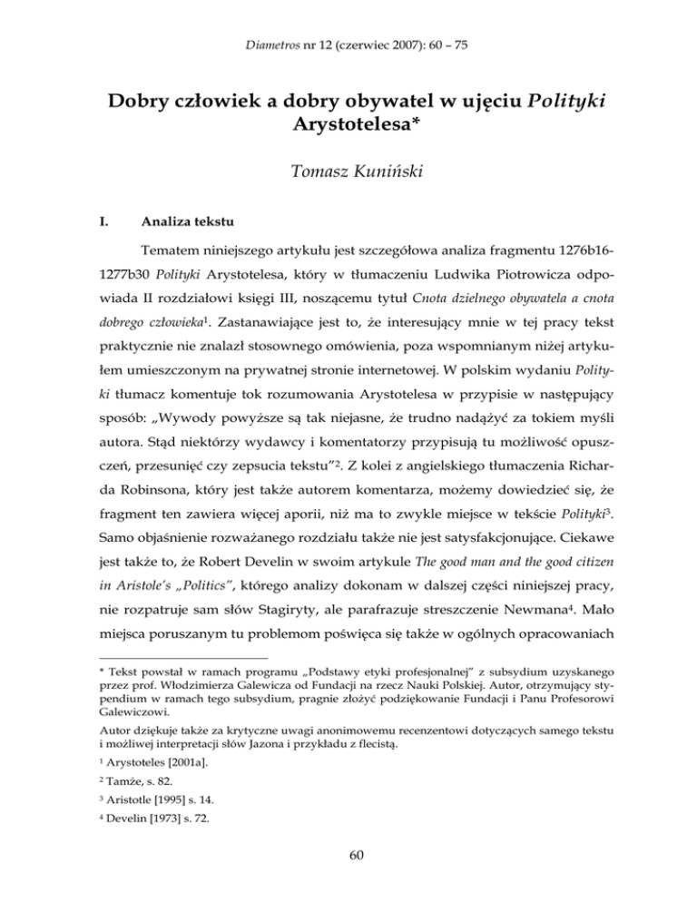 Diametros nr 12 (czerwiec 2007): 60 – 75 Dobry człowiek a dobry obywatel w ujęciu Polityki Arystotelesa* Tomasz Kuniński I. Analiza tekstu Tematem niniejszego artykułu jest szczegółowa analiza fragmentu 1276b16- 1277b30 Polityki Arystotelesa, który w tłumaczeniu Ludwika Piotrowicza odpowiada II rozdziałowi księgi III, noszącemu tytuł Cnota dzielnego obywatela a cnota dobrego człowieka1. Zastanawiające jest to, że interesujący mnie w tej pracy tekst praktycznie nie znalazł stosownego omówienia, poza wspomnianym niżej artykułem umieszczonym na prywatnej stronie internetowej. W polskim wydaniu Polityki tłumacz komentuje tok rozumowania Arystotelesa w przypisie w następujący sposób: „Wywody powyższe są tak niejasne, że trudno nadążyć za tokiem myśli autora. Stąd niektórzy wydawcy i komentatorzy przypisują tu możliwość opuszczeń, przesunięć czy zepsucia tekstu”2. Z kolei z angielskiego tłumaczenia Richarda Robinsona, który jest także autorem komentarza, możemy dowiedzieć się, że fragment ten zawiera więcej aporii, niż ma to zwykle miejsce w tekście Polityki3. Samo objaśnienie rozważanego rozdziału także nie jest satysfakcjonujące. Ciekawe jest także to, że Robert Develin w swoim artykule The good man and the good citizen in Aristole’s „Politics”, którego analizy dokonam w dalszej części niniejszej pracy, nie rozpatruje sam słów Stagiryty, ale parafrazuje streszczenie Newmana4. Mało miejsca poruszanym tu problemom poświęca się także w ogólnych opracowaniach * Tekst powstał w ramach programu „Podstawy etyki profesjonalnej” z subsydium uzyskanego przez prof. Włodzimierza Galewicza od Fundacji na rzecz Nauki Polskiej. Autor, otrzymujący stypendium w ramach tego subsydium, pragnie złożyć podziękowanie Fundacji i Panu Profesorowi Galewiczowi. Autor dziękuje także za krytyczne uwagi anonimowemu recenzentowi dotyczących samego tekstu i możliwej interpretacji słów Jazona i przykładu z flecistą. 1 Arystoteles [2001a]. 2 Tamże, s. 82. 3 Aristotle [1995] s. 14. 4 Develin [1973] s. 72. 60 Tomasz Kuniński Dobry człowiek a dobry obywatel w ujęciu Polityki Arystotelesa dotyczących filozofii Arystotelesa, takich jak The Cambridge Companion to Aristotle5 czy Aristotle Davida Rossa6. Uzasadnione wydaje się więc przeprowadzenie szczegółowej analizy tego fragmentu Polityki, ponieważ, jak wykażę to później, ma on istotne znaczenie dla politycznej myśli Arystotelesa. Artykuł dzielę na dwie części. W pierwszej z nich dokonam szczegółowej analizy tekstu powstrzymując się od jego komentowania, chyba że będzie to konieczne dla prowadzenia dalszego wywodu. W drugiej części natomiast przejdę do jego interpretacji oraz zasygnalizuję, jakie zagadnienia można postawić na gruncie wcześniej objaśnionych rozróżnień. Na początku II rozdziału III księgi Polityki Arystoteles stawia pytanie, „czy cnotę dobrego człowieka należy uważać za to samo, co cnotę dzielnego obywatela, czy też nie”7. Filozof proponuje w celu rozważenia tego zagadnienia odwołanie się do analogii pomiędzy obywatelem a żeglarzem. Żeglarze różnią się pomiędzy sobą zadaniami, jakie przychodzi im spełnić. Mają jednak, zdaniem Arystotelesa, „pewną wspólną cechę, do wszystkich zarówno się stosującą”8, a jest nią troska o bezpieczne żeglowanie. Podobnie jest z obywatelami. Oni także mają różne funkcje w państwie, ale im wszystkim przyświeca jeden wspólny cel: dobro wspólnoty. Arystoteles podkreśla jednak, że wspólnota opiera się na jakimś konkretnym ustroju państwowym. Z tego wyciąga wniosek, że cnota obywatela, która – w założeniu – oznacza dbanie o dobro państwa, będzie uzależniona od ustroju danego państwa. Skoro bowiem dobro państwa wiąże się z jego ustrojem, to – na tej podstawie – możemy uznać, że dobro demokracji różni się od dobra oligarchii, więc cnota obywatela w demokracji, czyli dbanie o dobro państwa (resp. demokracji), będzie inna od cnoty obywatela w oligarchii, ponieważ będą oni musieli realizować coś innego, a cnota, zdaniem Arystotelesa, jest ściśle związana z działaniem. Paragraf II kończy się stwierdzeniem, że skoro cnota dobrego człowieka jest jedna, a cnót dzielnego obywatela jest, jak można chyba przyjąć, tyle ile ustrojów, to zna- 5 Barnes [1995]. 6 Ross [1996]. 7 Arystoteles [2001a] 1276b. 8 Tamże. 61 Tomasz Kuniński Dobry człowiek a dobry obywatel w ujęciu Polityki Arystotelesa czy, że „można być dzielnym obywatelem, a nie posiadać cnoty, która stanowi o dzielności człowieka”9. W paragrafie III Arystoteles stwierdza, że do wniosku zamykającego paragraf II można dojść w inny sposób, a mianowicie poprzez rozważanie najlepszego ustroju. W paragrafie tym występuje sprzeczność w tłumaczonym tekście. Nie zawiera jej tekst oryginalny. Odnotujmy ją. Zdanie „jeśli bowiem jest rzeczą niemożliwą, aby państwo składało się z samych dzielnych obywateli”10 stoi w ewidentnej sprzeczności ze zdaniem „bo cnotę dzielnego obywatela muszą wszyscy posiadać”11. Należy mieć na uwadze, że powyższe rozważania dotyczą najlepszego ustroju12. Arystoteles wyraźnie bowiem mówi, na co wskazuje drugie zdanie z analizowanej pary, że w najlepszym ustroju wszyscy muszą być dzielnymi obywatelami. Zdając sobie sprawę z tego, że wszyscy obywatele nie mogą być sobie równi, co można uznać w ustach Arystotelesa nie za twierdzenie o charakterze normatywnym, ale będące opisem rzeczywistości, zakładając jednak – właśnie normatywnie – że w najlepszym ustroju wszyscy obywatele muszą być dzielni, Stagiryta musi przyjąć, że obywateli będzie różniła między sobą cnota dobrego człowieka, czyli że nie wszyscy obywatele w najlepszym ustroju będą dobrymi ludźmi. Paragraf czwarty zawiera w sobie rozumowanie, które można by nazwać „argumentem z rządzenia”. Arys