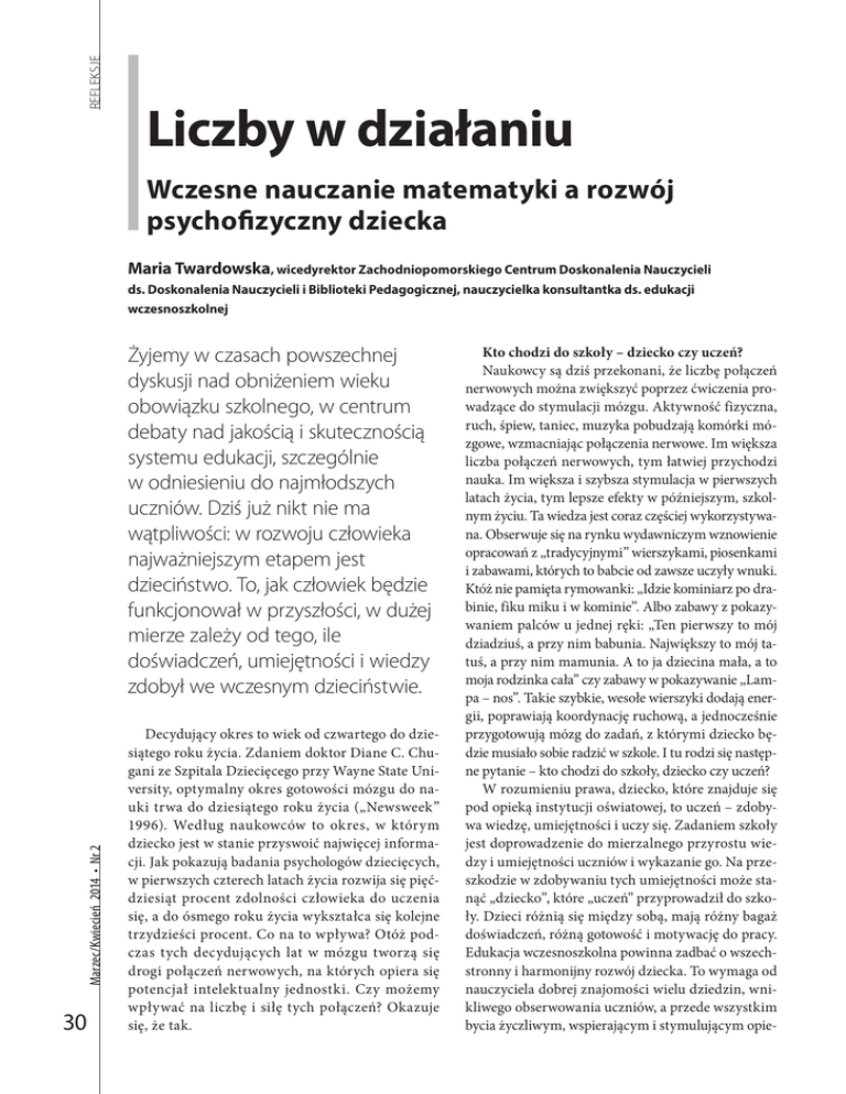 REFLEKSJE Liczby w działaniu Wczesne nauczanie matematyki a rozwój psychofizyczny dziecka Maria Twardowska, wicedyrektor Zachodniopomorskiego Centrum Doskonalenia Nauczycieli ds. Doskonalenia Nauczycieli i Biblioteki Pedagogicznej, nauczycielka konsultantka ds. edukacji wczesnoszkolnej Marzec/Kwiecień 2014 • Nr 2 Żyjemy w czasach powszechnej dyskusji nad obniżeniem wieku obowiązku szkolnego, w centrum debaty nad jakością i skutecznością systemu edukacji, szczególnie w odniesieniu do najmłodszych uczniów. Dziś już nikt nie ma wątpliwości: w rozwoju człowieka najważniejszym etapem jest dzieciństwo. To, jak człowiek będzie funkcjonował w przyszłości, w dużej mierze zależy od tego, ile doświadczeń, umiejętności i wiedzy zdobył we wczesnym dzieciństwie. 30 Decydujący okres to wiek od czwartego do dziesiątego roku życia. Zdaniem doktor Diane C. Chugani ze Szpitala Dziecięcego przy Wayne State University, optymalny okres gotowości mózgu do nauki trwa do dziesiątego roku życia („Newsweek” 1996). Według naukowców to okres, w którym dziecko jest w stanie przyswoić najwięcej informacji. Jak pokazują badania psychologów dziecięcych, w pierwszych czterech latach życia rozwija się pięćdziesiąt procent zdolności człowieka do uczenia się, a do ósmego roku życia wykształca się kolejne trzydzieści procent. Co na to wpływa? Otóż podczas tych decydujących lat w mózgu tworzą się drogi połączeń nerwowych, na których opiera się potencjał intelektualny jednostki. Czy możemy wpływać na liczbę i siłę tych połączeń? Okazuje się, że tak. Kto chodzi do szkoły – dziecko czy uczeń? Naukowcy są dziś przekonani, że liczbę połączeń nerwowych można zwiększyć poprzez ćwiczenia prowadzące do stymulacji mózgu. Aktywność fizyczna, ruch, śpiew, taniec, muzyka pobudzają komórki mózgowe, wzmacniając połączenia nerwowe. Im większa liczba połączeń nerwowych, tym łatwiej przychodzi nauka. Im większa i szybsza stymulacja w pierwszych latach życia, tym lepsze efekty w późniejszym, szkolnym życiu. Ta wiedza jest coraz częściej wykorzystywana. Obserwuje się na rynku wydawniczym wznowienie opracowań z „tradycyjnymi” wierszykami, piosenkami i zabawami, których to babcie od zawsze uczyły wnuki. Któż nie pamięta rymowanki: „Idzie kominiarz po drabinie, fiku miku i w kominie”. Albo zabawy z pokazywaniem palców u jednej ręki: „Ten pierwszy to mój dziadziuś, a przy nim babunia. Największy to mój tatuś, a przy nim mamunia. A to ja dziecina mała, a to moja rodzinka cała” czy zabawy w pokazywanie „Lampa – nos”. Takie szybkie, wesołe wierszyki dodają energii, poprawiają koordynację ruchową, a jednocześnie przygotowują mózg do zadań, z którymi dziecko będzie musiało sobie radzić w szkole. I tu rodzi się następne pytanie – kto chodzi do szkoły, dziecko czy uczeń? W rozumieniu prawa, dziecko, które znajduje się pod opieką instytucji oświatowej, to uczeń – zdobywa wiedzę, umiejętności i uczy się. Zadaniem szkoły jest doprowadzenie do mierzalnego przyrostu wiedzy i umiejętności uczniów i wykazanie go. Na przeszkodzie w zdobywaniu tych umiejętności może stanąć „dziecko”, które „uczeń” przyprowadził do szkoły. Dzieci różnią się między sobą, mają różny bagaż doświadczeń, różną gotowość i motywację do pracy. Edukacja wczesnoszkolna powinna zadbać o wszechstronny i harmonijny rozwój dziecka. To wymaga od nauczyciela dobrej znajomości wielu dziedzin, wnikliwego obserwowania uczniów, a przede wszystkim bycia życzliwym, wspierającym i stymulującym opie- Naukowcy są dziś przekonani, że liczbę połączeń nerwowych można zwiększyć poprzez ćwiczenia prowadzące do stymulacji mózgu. Aktywność fizyczna, ruch, śpiew, taniec, muzyka pobudzają komórki mózgowe, wzmacniając połączenia nerwowe. Im większa liczba połączeń nerwowych, tym łatwiej przychodzi nauka. Im większa i szybsza stymulacja w pierwszych latach życia, tym lepsze efekty w późniejszym, szkolnym życiu. Jarome Bruner natomiast wyróżnił trzy rodzaje reprezentacji: enaktywną, która bazuje na działaniu manualnym; ikoniczną, opartą na wyobrażeniach rysunkowych; symboliczną, której podstawę stanowi symbol – cyfra. Aby nauka matematyki przebiegała w sposób prawidłowy i niezakłócony, zasadne jest wprowadzanie nowych pojęć na podstawie schematu: odwołanie się do wcześniejszych doświadczeń (zdobytych podczas zabaw) – dwie lalki i trzy lalki; doświadczenia na poziomie reprezentacji enaktywnej, układanie – dwa klocki w kolorze czerwonym i trzy w kolorze zielonym; doświadczenia na poziomie reprezentacji ikonicznej – rysowanie (przez dziecko) dwóch kółek w kolorze czerwonym i trzech w kolorze zielonym; doświadczenia na poziomie reprezentacji symbolicznej (zapis za pomocą cyfr: 2+3). Jeżeli proces nauczania nowych rzeczy będzie przebiegał zgodnie ze schematem, zagwarantujemy uczniowi działanie na konkretach, które jest niezbędnym warunkiem rozwoju na każdym etapie edukacyjnym. Im więcej działań, tym więcej szans na odkrywanie i świadome uczenie się, jako że działanie na przedmiotach prowadzi do odkrywania prawidłowości, rozumienia pojęć matematycznych i doskonalenia operacji logicznych. Nauczyciele edukacji wczesnoszkolnej na spotkaniach metodycznych wskazują, że uczniowie niechętnie manipulują przedmiotami, nie chcą wykonywać rysunków pomocniczych. W takiej sytuacji należy przekonać ucznia (czasami i rodzica, a może i nauczyciela), że manipulowanie konkretami jest niezbędne dla prawidłowego kształtowania umiejętności i wiedzy z matematyki. Marzec/Kwiecień 2014 • Nr 2 Czynnościowe nauczanie, czyli matematyka w działaniu Idea matematyki w działaniu oparta jest na teoriach takich uczonych, jak: Jean Piaget, Jarome Bruner, Abraham Maslow i Lew Wygotski. Współcześnie, w poszukiw