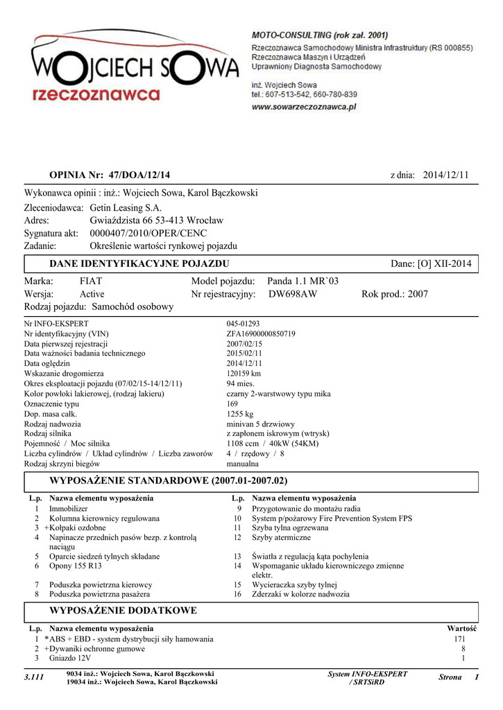 OPINIA Nr: 47/DOA/12/14 z dnia: 2014/12/11 Wykonawca opinii : inż.: Wojciech Sowa, Karol Bączkowski Zleceniodawca: Getin Leasing S.A. Adres: Gwiaździsta 66 53-413 Wrocław Sygnatura akt: 0000407/2010/OPER/CENC Zadanie: Określenie wartości rynkowej pojazdu DANE IDENTYFIKACYJNE POJAZDU Marka: FIAT Wersja: Active Rodzaj pojazdu: Samochód osobowy Dane: [O] XII-2014 Model pojazdu: Nr rejestracyjny: Nr INFO-EKSPERT Nr identyfikacyjny (VIN) Data pierwszej rejestracji Data ważności badania technicznego Data oględzin Wskazanie drogomierza Okres eksploatacji pojazdu (07/02/15-14/12/11) Kolor powłoki lakierowej, (rodzaj lakieru) Oznaczenie typu Dop. masa całk. Rodzaj nadwozia Rodzaj silnika Pojemność / Moc silnika Liczba cylindrów / Układ cylindrów / Liczba zaworów Rodzaj skrzyni biegów Panda 1.1 MR`03 DW698AW Rok prod.: 2007 045-01293 ZFA16900000850719 2007/02/15 2015/02/11 2014/12/11 120159 km 94 mies. czarny 2-warstwowy typu mika 169 1255 kg minivan 5 drzwiowy z zapłonem iskrowym (wtrysk) 1108 ccm / 40kW (54KM) 4 / rzędowy / 8 manualna WYPOSAŻENIE STANDARDOWE (2007.01-2007.02) L.p. Nazwa elementu wyposażenia 1 Immobilizer 2 Kolumna kierownicy regulowana 3 + Kołpaki ozdobne 4 Napinacze przednich pasów bezp. z kontrolą naciągu 5 Oparcie siedzeń tylnych składane 6 Opony 155 R13 7 8 Poduszka powietrzna kierowcy Poduszka powietrzna pasażera L.p. 9 10 11 12 Nazwa elementu wyposażenia Przygotowanie do montażu radia System p/pożarowy Fire Prevention System FPS Szyba tylna ogrzewana Szyby atermiczne 13 14 Światła z regulacją kąta pochylenia Wspomaganie układu kierowniczego zmienne elektr. Wycieraczka szyby tylnej Zderzaki w kolorze nadwozia 15 16 WYPOSAŻENIE DODATKOWE L.p. Nazwa elementu wyposażenia 1 *ABS + EBD - system dystrybucji siły hamowania 2 +Dywaniki ochronne gumowe 3 Gniazdo 12V 3.111 9034 inż.: Wojciech Sowa, Karol Bączkowski 19034 inż.: Wojciech Sowa, Karol Bączkowski Wartość 171 8 1 System INFO-EKSPERT / SRTSiRD Strona 1 47/DOA/12/14 4 +Lakier pastelowy 5 +Radioodtwarzacz CD/MP3 LG 6 Szyby przednie regulowane elektr. + zamek centralny 72 22 97 OPIS ZAMONTOWANEGO W POJEŹDZIE OGUMIENIA Koło Przednie lewe: Przednie prawe: Tylne lewe: Tylne prawe: Zapasowe: Marka, typ STOMIL OLSZTYN 155/80 R13 79Q SNOWPRO TL STOMIL OLSZTYN 155/80 R13 79Q SNOWPRO TL STOMIL OLSZTYN 155/80 R13 79Q SNOWPRO TL STOMIL OLSZTYN 155/80 R13 79Q SNOWPRO TL BARUM 135/80 R13 70Q OR 60 POLARIS Bieżnik [mm] Zużycie [%] 4,5 62 3,5 75 3,0 82 4,0 69 8,0 17 KOREKTY WARTOŚĆ BAZOWA NETTO (91 mies.) .................................... KOREKTA ZA WYPOSAŻENIE DODATKOWE .............................. KOREKTA ZA PIERWSZĄ REJESTRACJĘ ................................... KOREKTA ZA PRZEBIEG ................................................ KOREKTA ZA OGUMIENIE .............................................. KOREKTY RÓŻNE ...................................................... W tym: [%] Stan utrzymania i dbałość o pojazd Zadana szacunkowa korekta z tytułu wcześniejszych napraw Aktualność badań technicznych Korekta ze względu na serwisowanie pojazdu Regionalna sytuacja rynkowa Konieczne naprawy pojazdu -3,0 -2,0 -1,5 -3,0 -5,0 -19,8 7 846 PLN 371 PLN - 137 PLN - 495 PLN - 108 PLN - 2 597 PLN Wartość - 227 - 151 - 113 - 227 - 379 -1 500 KOMENTARZ Oględzin pojazdu dokonano w obecności zlecającego, który przedłożył do wglądu : -dowód rejestracyjny seria: DR/BAD 0553586 -1 klucz rozruchowy -książkę serwisową -instrukcję obsługi Numer identyfikacyjny pojazdu odczytano z natury i potwierdzono jego zgodność z zapisem w dowodzie rejestracyjnym. Ostatni zapis z OT w książce serwisowej z dn. 19-08-2009 r przy wskazaniach drogomierza 71903 km. Brak danych o przebiegu całkowitym i sposobie serwisowania pojazdu po 19-08-2009 r i przebiegu 71903 km. Pierwsze dwie OT dokonane poza autoryzowaną stacją obsługi. I. Silnik oraz układ napędowy (weryfikacja w warunkach parkingowych). Silnik o zapłonie iskrowym - uruchomiono. Jednostka napędowa pracuje bez nadmiernej głośności i bez nadmiernego dymienia, praca na biegu jałowym jest równomierna. Słyszalna praca układu zaworowego na biegu jałowym. Nie stwierdzono śladów istotnych wycieków oleju na silniku i obudowie skrzynie biegów. Stwierdzono ślady drobnych „przepoceń” i przedmuchów oleju na elementach silnika i jego osprzęcie. Skrzynia biegów - nie stwierdzono istotnych nieprawidłowości, zakłóceń w pracy mechanizmu. II. Układ zawieszenia, układ kierowniczy i elementy podwozia (weryfikacja w warunkach parkingowych). W wyniku badania organoleptycznego i po bardzo krótkiej jeździe próbnej nie stwierdzono widocznych uszkodzeń ani poszczególnych elementów zwieszenia kół ani układu kierowniczego. Nie stwierdzono nadmiernie podwyższonych luzów w połączeniach ruchowych elementów zawieszenia kół i układu kierowniczego. Układ 3.111 9034 inż.: Wojciech Sowa, Karol Bączkowski 19034 inż.: Wojciech Sowa, Karol Bączkowski System INFO-EKSPERT / SRTSiRD Strona 2 47/DOA/12/14 wydechowy, podwozie i poszczególne jego elementy z eksploatacyjnymi ogniskami korozji. III. Karoseria / nadwozie. Stwierdzono ślady napraw lakierniczych błotnika t.l. o wartości do 160 µm, grubość powłoki lakierowej rzędu 70 - 120 µm na pozostałych elementach karoserii (poszyć z materiałów metalowych) podlegających lakierowaniu. IV. Stwierdzone w trakcie oględzin uszkodzenia, usterki i wady wpływające na rynkową wartość przedmiotowego pojazdu. Większość elementów poszycia karoserii, jak i pozostałe elementy nadwozia noszą ślady różnych uszkodzeń, głównie wgnieceń, zarysowań i ubytków powłok lakierowych o różnej intensyfikacji i miejscu występowania (część zarysowań powłok lakierowych do usunięcia w procesie polerowania), ponadto: -nieznacznie powiększone zużycie elementów ciernych układu hamulcowego -osłona termiczna kolektora wydechowego - większe pęknięcia, zagi
