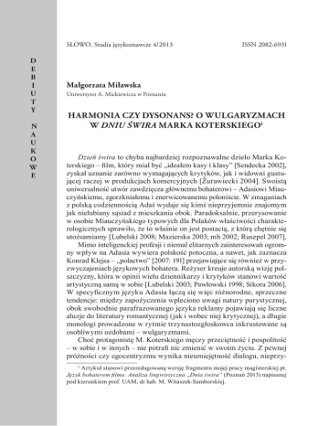 SŁOWO. Studia językoznawcze 4/ 2013 d e b i u t y n a u k o w e ISSN 2082-6931 Małgorzata Miławska Uniwersytet A. Mickiewicza w Poznaniu Harmonia czy dysonans? O wulgaryzmach w Dniu świra Marka Koterskiego1 Dzień świra to chyba najbardziej rozpoznawalne dzieło Marka Koterskiego – film, który miał być „ideałem kasy i klasy” [Sendecka 2002], zyskał uznanie zarówno wymagających krytyków, jak i widowni gustującej raczej w produkcjach komercyjnych [Żurawiecki 2004]. Swoistą uniwersalność utwór zawdzięcza głównemu bohaterowi – Adasiowi Miauczyńskiemu, zgorzkniałemu i znerwicowanemu poloniście. W zmaganiach z polską codziennością Adaś wydaje się kimś nieprzyjemnie znajomym jak nielubiany sąsiad z mieszkania obok. Paradoksalnie, przerysowanie w osobie Miauczyńskiego typowych dla Polaków właściwości charakterologicznych sprawiło, że to właśnie on jest postacią, z którą chętnie się utożsamiamy [Lubelski 2008; Mazierska 2003; mh 2002; Ruszpel 2007]. Mimo inteligenckiej profesji i niemal elitarnych zainteresowań ogromny wpływ na Adasia wywiera polskość potoczna, a nawet, jak zaznacza Konrad Klejsa – „polactwo” [2007: 191] przejawiające się również w przyzwyczajeniach językowych bohatera. Reżyser kreuje autorską wizję polszczyzny, która w opinii wielu dziennikarzy i krytyków stanowi wartość artystyczną samą w sobie [Lubelski 2003; Pawłowski 1998; Sikora 2006]. W specyficznym języku Adasia łączą się więc różnorodne, sprzeczne tendencje: między zapożyczenia wpleciono uwagi natury purystycznej, obok swobodnie parafrazowanego języka reklamy pojawiają się liczne aluzje do literatury romantycznej (jak i wobec niej krytycznej), a długie monologi prowadzone w rytmie trzynastozgłoskowca inkrustowane są osobliwymi ozdobami – wulgaryzmami. Choć protagonistę M. Koterskiego męczy przeciętność i pospolitość – w sobie i w innych – nie potrafi nic zmienić w swoim życiu. Z pewnej próżności czy egocentryzmu wynika nieumiejętność dialogu, nieprzy1 Artykuł stanowi przeredagowaną wersję fragmentu mojej pracy magisterskiej pt. Język bohaterem filmu. Analiza lingwistyczna „Dnia świra” (Poznań 2013) napisanej pod kierunkiem prof. UAM, dr hab. M. Witaszek-Samborskiej. Harmonia czy dysonans? O wulgaryzmach w „Dniu świra” Marka Koterskiego 189 zwyczajenie do przebywania z Innym – od którego Adaś niczego nie chce się nauczyć [Kapuściński 2007]. Wręcz przeciwnie – tu spotkanie z Innym stanowi pretekst do konfliktu. Z racji tej „antydialogowej” postawy bohatera Dnia świra warto przyjrzeć się temu, jak Koterski posługuje się wulgaryzmami, które – jak podkreśla Sławomir Bobowski – nie pełnią tu funkcji usensacyjniających tekst przerywników, ale są wyrazem bólu egzystencji: koncerty bluzgowe [Adasia – przyp. M.M.] stanowią dramatyczny wyraz buntu i desperacji spauperyzowanego, skundlonego, upodlonego w nowej Polsce inteligenta [Bobowski 2007]. *** Według Macieja Grochowskiego wulgaryzm to „[…] jednostka leksykalna, za pomocą której mówiący ujawnia swoje emocje względem czegoś lub kogoś, łamiąc przy tym tabu językowe” [Grochowski 1995: 15]. Stanisław Gajda włącza te jednostki w obręb zjawiska agresji językowej. Za Erichem Frommem przyjmuje, że istnieją dwa rodzaje agresji: agresja obronna (niezłośliwa), której przyczyn należy doszukiwać się w podstawowych ludzkich instynktach wynikających z uwarunkowań biologicznych, a także agresja destrukcyjna (złośliwa) o podłożu społecznym, psychicznym i kulturowym [Gajda 2002]. Według S. Gajdy dyskurs agresywny stanowi tę część obcowania językowego, która zasadza się na konflikcie zorientowanym na negatywny efekt, tj. głównie na wyrządzenie komuś szkody. U podstaw wielu zachowań komunikacyjnych leży konflikt, czyli niezgoda z kimś lub z czymś, w tym między partnerami komunikacyjnymi [Gajda 2002: 62]. Wulgaryzmy stosowane przez Adasia Miauczyńskiego będą zatem formą agresji destrukcyjnej, kierowanej nie tylko do rozmówców, ale jednocześnie – jak okaże się podczas omawiania poszczególnych przykładów – do niego samego. Chęć obrażenia czy sprawienia przykrości to jeden z wielu celów tzw. brzydkich wyrazów. Zanim jednak nastąpi opis ich pozostałych funkcji pełnionych w utworze M. Koterskiego, wypada przytoczyć chociaż kilka opinii na temat posługiwania się przez Polaków wyrazami uznanymi za wulgarne. Jak wskazują językoznawcy, częstość użycia wulgaryzmów w codziennej polszczyźnie niebezpiecznie wzrasta; wielu badaczy zaobserwowało również, że jest to pośredni skutek niemal całkowitego zaniku warstwy „starej inteligencji” hołdującej przedwojennym tradycjom, której językiem – także w gronie rodzinnym – była nie potoczna, ale literacka odmiana języka polskiego, a wulgaryzmy rzeczywiście należały do sfery tabu [Grybosiowa 2006; Kowalikowa 2000; Warchala 2003]. Antonina Grybosiowa w swoim szkicu przedstawia dwie odmienne oceny zjawiska szerzenia się wulgaryzmów: 190 Małgorzata Miławska Słabnie protest przedstawicieli dawnej elity intelektualnej, staje się niesłyszalny, zagłusza go rosnąca aprobata i postawa usprawiedliwiającego obserwatora, który w dodatku wykorzystuje świadectwa historyczne, powołuje się na procesy historycznojęzykowe [Grybosiowa 2006: 57]2. Po jednej stronie sporu można zatem znaleźć swoistych purystów językowych, po drugiej – obrońców wulgaryzmów jako wyrazów niezbędnych chociażby ze względów artystycznych (co interesujące: żadna ze stron nie usprawiedliwia obecności wulgaryzmów w mowie jako przerywników potocznie nazywanych „przecinkami”). Za inną przyczynę tego liberalnego podejścia uważa się także demokratyzację polskiego życia politycznego i społecznego – przyzwolenie na obecność „brzydkich wyrazów” stanowi zatem formę rewolucji obyczajowej 