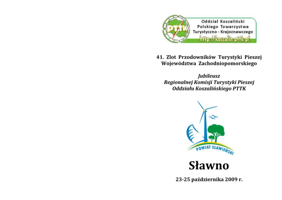 41. Zlot Przodowników Turystyki Pieszej Województwa Zachodniopomorskiego Jubileusz Regionalnej Komisji Turystyki Pieszej Oddziału Koszalińskiego PTTK Sławno 23-25 października 2009 r. Regulamin 41. Zlotu Przodowników Turystyki Pieszej Województwa Zachodniopomorskiego Sławno 23-25 października 2009 r. ORGANIZATORZY: Regionalna Komisja Turystyki Pieszej przy Zarządzie Oddziału Koszalińskiego PTTK Starostwo Powiatowe w Sławnie CELE ZLOTU: Propagowanie turystyki pieszej. Integracja środowisk przodowniczych – wymiana doświadczeń. Prezentacja walorów krajoznawczo – turystycznych Ziemi Sławieńskiej. Zdobycie oraz rozszerzenie uprawnień P.T.P. WARUNKI UCZESTNICTWA: warunkiem uczestnictwa w Zlocie jest dostarczenie karty zgłoszenia oraz dokonanie wpłaty wpisowego w terminie do 15 października 2009 r. osobiście lub listownie na adres: Oddział Koszaliński PTTK 75-201 Koszalin, ul. Dworcowa 4/4 tel. 94 342-46-41, [email protected] 23-1240-3653-1111-0000-4188-3309 PEKAO II O/Koszalin Biuro czynne od wtorku do czwartku w godzinach 11.00 – 16.00 wpisowe: o 90 zł o 60 zł (bez noclegów) Istnieje możliwość wpłaty wpisowego na Zlocie po uprzednim uzgodnieniu telefonicznym - 609873793 (Józef Tokarz), ZAKWATEROWANIE: Zakwaterowanie w pokojach 4-osobowych w Internacie SOSW w Sławnie, ul. Kopernika 9 RAMOWY PROGRAM ZLOTU piątek – 23 października 2009 r. od godz. 15.00 – przyjmowanie uczestników Zlotu godz. 18.30 – spotkanie informacyjne godz. 19.00 – egzaminy na P.T.P. i rozszerzanie uprawnień spacer po mieście, czas wolny sobota – 24 października 2009 r. godz. 9.00 – wyjazd na wycieczkę krajoznawczą – okolice Sławna, Ustka godz. 16.00 – powrót godz. 17.00 – uroczysta część Zlotu, poczęstunek Zlotowy, wieczór integracyjny w terenie i nie tylko niedziela – 25 października 2009 r. od godz. 10.00 – zwiedzanie Sławna z przewodnikiem godz. 14.00 – zakończenie Zlotu UWAGA: Posiłki we własnym zakresie. Możliwość korzystania ze stołówki. Członkowie PTTK z opłaconą składką są ubezpieczeni przez ZG PTTK polisa zbiorowa. Organizatorzy nie odpowiadają za straty poniesione i spowodowane przez uczestników. Za szkody wyrządzone wobec uczestników Zlotu przez osoby trzecie jak i odwrotnie Organizator nie odpowiada. UWAGA: Osoby zdające egzamin oraz rozszerzające uprawnienia proszone są o jak najszybsze zgłoszenie tego faktu telefonicznie do Józefa Tadeusza Tokarza – tel. 0-609 873-793. DO ZOBACZENIA NA TURYSTYCZNYM SZLAKU KARTA ZGŁOSZENIA na 41. Zlot Przodowników Turystyki Pieszej Województwa Zachodniopomorskiego 23-25 października 2009 r. Sławno imię i nazwisko: …………………………………………………………………………….. adres: …………………………………………………………………………………………….. telefon: ………………………………………………………………………............................ e-mail: ……………………………………………………………………….............................. nr leg. PTTK: ………………………………………………………………………................ PRZODOWNIK TP Egzamin na uprawnienia P.T.P. Nr Stopień tak nie ……..……………………………………… data i podpis