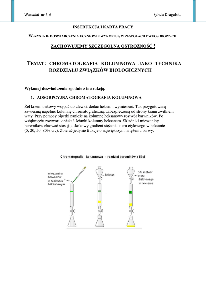 Warsztat nr 5, 6 Sylwia Dragulska INSTRUKCJA I KARTA PRACY WSZYSTKIE DOŚWIADCZENIA UCZNIOWIE WYKONUJĄ W ZESPOŁACH DWUOSOBOWYCH. ZACHOWUJEMY SZCZEGÓLNĄ OSTROŻNOŚĆ ! TEMAT: CHROMATOGRAFIA KOLUMNOWA JAKO TECHNIKA ROZDZIAŁU ZWIĄZKÓW BIOLOGICZNYCH Wykonaj doświadczenia zgodnie z instrukcją. 1. ADSORPCYJNA CHROMATOGRAFIA KOLUMNOWA Żel krzemionkowy wsypać do zlewki, dodać heksan i wymieszać. Tak przygotowaną zawiesiną napełnić kolumnę chromatograficzną, zabezpieczoną od strony kranu zwitkiem waty. Przy pomocy pipetki nanieść na kolumnę heksanowy roztwór barwników. Po wsiąknięciu roztworu opłukać ścianki kolumny heksanem. Składniki mieszaniny barwników eluować stosując skokowy gradient stężenia eteru etylowego w heksanie (5, 20, 50, 80% v/v). Zbierać jedynie frakcje o największym natężeniu barwy. Warsztat nr 5, 6 Sylwia Dragulska TEMAT: REJESTRACJA I ANALIZA WIDM UV-VIS Frakcje poszczególnych barwników rozcieńczyć odpowiednim dla danej frakcji eluentem (mieszaniny eter etylowy - heksan 5, 20, 50, 80% v/v). Zapisać widma każdej frakcji w zakresie 200 nm-700 nm. Otrzymane widma porównać z danymi literaturowymi. Warsztat nr 5, 6 Sylwia Dragulska