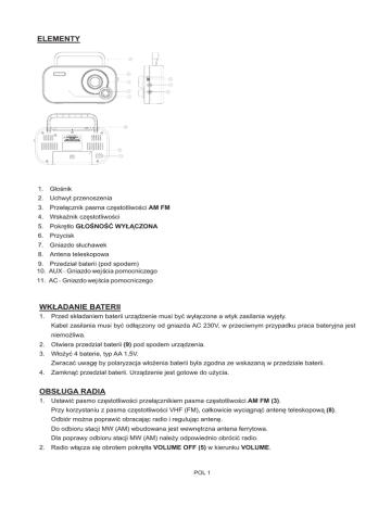 ELEMENTY 1. Głośnik 2. Uchwyt przenoszenia 3. Przełącznik pasma częstotliwości AM FM 4. Wskaźnik częstotliwości 5. Pokrętło GŁOŚNOŚĆ WYŁĄCZONA 6. Przycisk 7. Gniazdo słuchawek 8. Antena teleskopowa 9. Przedział baterii (pod spodem) 10. AUX - Gniazdo wejścia pomocniczego 11. AC - Gniazdo wejścia pomocniczego WKŁADANIE BATERII 1. Przed składaniem baterii urządzenie musi być wyłączone a wtyk zasilania wyjęty. Kabel zasilania musi być odłączony od gniazda AC 230V, w przeciwnym przypadku praca bateryjna jest niemożliwa. 2. Otwiera przedział baterii (9) pod spodem urządzenia. 3. Włożyć 4 baterie, typ AA 1,5V. Zwracać uwagę by polaryzacja włożenia baterii była zgodna ze wskazaną w przedziale baterii. 4. Zamknąć przedział baterii. Urządzenie jest gotowe do użycia. OBSŁUGA RADIA 1. Ustawić pasmo częstotliwości przełącznikiem pasma częstotliwości AM FM (3). Przy korzystaniu z pasma częstotliwości VHF (FM), całkowicie wyciągnąć antenę teleskopową (8). Odbiór można poprawić obracając radio i regulując antenę. Do odbioru stacji MW (AM) wbudowana jest wewnętrzna antena ferrytowa. Dla poprawy odbioru stacji MW (AM) należy odpowiednio obrócić radio. 2. Radio włącza się obrotem pokrętła VOLUME OFF (5) w kierunku VOLUME. POL 1 3. Głośność zwiększa się obrotem pokrętła VOLUME OFF w kierunku VOLUME. 4. Ustalić pożądaną częstotliwość, widoczną na wskaźniku częstotliwości (4), obracając pokrętłoTUNING. 5. Urządzenie przenosić trzymając za uchwyt (2). Uchwyt transportowy radia jest chowany i może być wyciągnięty naciśnięciem uchwytu w pobliżu zaznaczenia PRESS TO OPEN. Aby go schować nacisnąć go aż do kliknięcia. 6. Radio wyłącza się obrotem pokrętła VOLUME OFF w kierunku OFF aż do oporu. Usłyszy się kliknięcie a niebieskie podświetlenie tarczy TUNING wyłączy się. AUX - Gniazdo wejścia pomocniczego Możliwe jest podłączenie zewnętrznego urządzenia odtwarzania (np. odtwarzacz MP3) poprzez złącze AUX i wówczas muzyka może być odtwarzana przez głośniki. Uwaga: Przed podłączeniem urządzeń odtwarzających, proszę się zapoznać ze wskazówkami zawartymi dotyczącymi bezpieczeństwa i użytkowania. Wyłączyć urządzenie oraz zewnętrzne urządzenie odtwarzania. GNIAZDO SŁUCHAWEK Do gniazda słuchawek można podłączyć słuchawki z wtykiem 3,5 mm (7). Głośnik (1) przy wetknięciu wtyku słuchawek wyłącza się automatycznie. Głośność słuchawek zwiększa się obrotem pokrętła VOLUME OFF. CZYSZCZENIE I KONSERWACJA Uwaga! Do czyszczenia części z tworzyw sztucznych urządzenia nie używać alkoholu, acetonu, benzenu, środków szorujących, itd.. Nie używać twardych szczotek lub metalowych przedmiotów. Wycierać urządzenie regularnie suchą ściereczką. Przed długim okresem nie używania, usunąć baterie z ich przedziału. Cieknące baterie mogą uszkodzić urządzenie. Urządzenie przechowywać w suchym, chłodnym miejscu chronionym przed wilgocią i bezpośrednim nasłonecznieniem. DANE TECHNICZNE Pasmo VHF (FM) 87,5 – 108 MHz częstotliwości: MW (AM) 540 – 1600 KHz Napięcie pracy: 230V~ 50Hz, praca bateryjna (4x 1,5V AA) POL 2 WSZYSTKIE PRAWA ZASTRZEŻONE, PRAWA AUTORSKIE DENVER ELECTRONICS A/S Sprzęt elektryczny i elektroniczny zawiera materiały, elementy oraz substancje, które mogą być niebezpieczne dla zdrowia i środowiska, jeśli materiał odpadowy (wyrzucony sprzęt elektryczny, elektroniczny) nie są właściwie potraktowane. Sprzęt elektryczny i elektroniczny i baterie oznaczone są przekreślonym symbolem śmietnika, patrz wyżej. Ten symbol oznacza, że sprzęt elektryczny i elektroniczny nie powinien być wyrzucany z innymi odpadami domowymi, ale powinien być usuwany oddzielnie. Wszystkie miasta mają ustalone miejsca zbiórki sprzętu elektrycznego i elektronicznego, gdzie można go bezpłatnie oddać w stacjach recyklingu i innych miejscach zbiórki lub zlecić jego odbiór z gospodarstw domowych. Dodatkowa informacja jest dostępna w wydziale technicznym miasta. Importeur: DENVER ELECTRONICS A/S Stavneagervej 22 DK-8250 Egaa Danimarca www.facebook.com/denverelectronics POL 3
