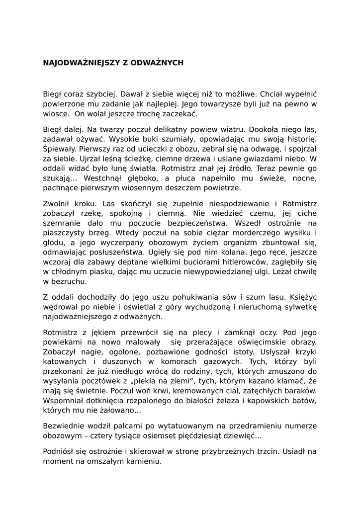 NAJODWAŻNIEJSZY Z ODWAŻNYCH Biegł coraz szybciej. Dawał z siebie więcej niż to możliwe. Chciał wypełnić powierzone mu zadanie jak najlepiej. Jego towarzysze byli już na pewno w wiosce. On wolał jeszcze trochę zaczekać. Biegł dalej. Na twarzy poczuł delikatny powiew wiatru. Dookoła niego las, zadawał ożywać. Wysokie buki szumiały, opowiadając mu swoją historię. Śpiewały. Pierwszy raz od ucieczki z obozu, zebrał się na odwagę, i spojrzał za siebie. Ujrzał leśną ścieżkę, ciemne drzewa i usiane gwiazdami niebo. W oddali widać było łunę światła. Rotmistrz znał jej źródło. Teraz pewnie go szukają… Westchnął głęboko, a płuca napełniło mu świeże, nocne, pachnące pierwszym wiosennym deszczem powietrze. Zwolnił kroku. Las skończył się zupełnie niespodziewanie i Rotmistrz zobaczył rzekę, spokojną i ciemną. Nie wiedzieć czemu, jej ciche szemranie dało mu poczucie bezpieczeństwa. Wszedł ostrożnie na piaszczysty brzeg. Wtedy poczuł na sobie ciężar morderczego wysiłku i głodu, a jego wyczerpany obozowym życiem organizm zbuntował się, odmawiając posłuszeństwa. Ugięły się pod nim kolana. Jego ręce, jeszcze wczoraj dla zabawy deptane wielkimi buciorami hitlerowców, zagłębiły się w chłodnym piasku, dając mu uczucie niewypowiedzianej ulgi. Leżał chwilę w bezruchu. Z oddali dochodziły do jego uszu pohukiwania sów i szum lasu. Księżyc wędrował po niebie i oświetlał z góry wychudzoną i nieruchomą sylwetkę najodważniejszego z odważnych. Rotmistrz z jękiem przewrócił się na plecy i zamknął oczy. Pod jego powiekami na nowo malowały się przerażające oświęcimskie obrazy. Zobaczył nagie, ogolone, pozbawione godności istoty. Usłyszał krzyki katowanych i duszonych w komorach gazowych. Tych, którzy byli przekonani że już niedługo wrócą do rodziny, tych, których zmuszono do wysyłania pocztówek z „piekła na ziemi”, tych, którym kazano kłamać, że mają się świetnie. Poczuł woń krwi, kremowanych ciał, zatęchłych baraków. Wspomniał dotknięcia rozpalonego do białości żelaza i kapowskich batów, których mu nie żałowano… Bezwiednie wodził palcami po wytatuowanym na przedramieniu numerze obozowym – cztery tysiące osiemset pięćdziesiąt dziewięć… Podniósł się ostrożnie i skierował w stronę przybrzeżnych trzcin. Usiadł na moment na omszałym kamieniu. -Trzeba iść dalej. Za Polskę… - szepnął. Zerwał się na równe nogi i znów, tym razem głośniej powtórzył te słowa. Spojrzał gdzieś przed siebie, a jego oczy rozbłysły. Nie podda się. Nie teraz, kiedy jest już niemal u celu swojej drogi. Zanurzył ręce w rzece i nabrał wody w stulone dłonie. Spoglądał w nią przez dłuższy czas, aż jej tafla się wygładziła. Nagle ogarnęła go niesamowita tęsknota za bliskimi, za rodzicami, żoną… Zastanawiał się co teraz robią… Czy myślą o nim? Czy tęsknią tak jak on? Z jego szeroko otwartych oczu, wypłynęły dwie łzy. Toczyły się przez zapadnięte policzki Rotmistrza, aż wpadły w jego dłonie i zmąciły zebraną w nich wodę. Obmył nią twarz. Nie podda się. Zadarł wysoko głowę i spojrzał w niebo. Noc powoli ustępowała miejsca dniu. Szarzało. We wsi czekają już na niego. Nie będzie zwlekał… Ostatni raz omiótł spojrzeniem plażę i rzekę. Poczuł, że jeszcze kiedyś musi tu wrócić. - Za Polskę… - powtórzył i ruszył przez wodę.