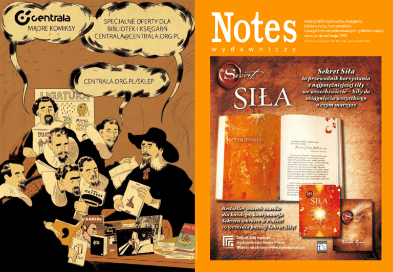 Notes Wydawniczy wrzesień 2012 Nr 9 (244) wrzesień 2012 • ISSN 2283-7739 • cena 19,90 zł (5% VAT) 870104 ./7/i#) Wydawnictwa Jirafa Roja /S MJQJFDTJFSQJFǩt*44/tDFOB[7"5 Piotr Stróżyński Kokon wytrzeźwień „Kokon wytrzeźwień” opowiada przede wszystkim o uzależnieniu od alkoholu, ale tutaj ważny jest także aspekt współuzależnienia, zwany również koalkoholizmem. Bohaterem książki jest mężczyzna w średnim wieku, dość majętny dziennikarz prasy wojewódzkiej. Wiedzie stabilne życie, ma pracę, dom, rodzinę… Do czasu. W jednej chwili traci wszystko i stacza się na dno ludzkiej egzystencji. Dzięki piekielnej intrydze małżonki zostaje osądzony i skazany, musi wynieść się z rodzinnego domu, a rozwód orzeczony zostaje z jego winy. Doprowadzony do krawędzi rozpaczy, myśli o popełnieniu samobójstwa… Mozolnie wstaje na nogi. Przechodzi leczenie odwykowe. Próbuje rozpocząć nowe życie. Tymczasem los daje mu możliwość dokonania perfidnej zemsty na byłej żonie… Czy wykorzysta tę szansę? Sara Antczak Klatka Notes Wydawniczy lipiec-sierpień 2012 Siedem osób. Wszyscy zamknięci w ciasnym budynku, dzień po dniu oddalają się od rzeczywistości. Łączą ich studia we Wrocławiu. Dzieli wszystko inne. Początkowo są pewni siebie i otwarci na nowe doznania, chętnie rzucają się w maraton niekończących się imprez. Jednak beztroska atmosfera szybko mija. Ciągłe towarzystwo tych samych ludzi. Zamroczenie używkami. Brak perspektyw. Kompleksy. Strach. Samotność. Tajemnice. To wszystko sprawia, że bohaterowie czują się uwięzieni w swoich własnych głowach. Tłumione emocje nie mogą znaleźć ujścia. Narastają konflikty i agresja. Świat za ścianami akademika przestaje istnieć, a życie w środku zamienia się w piekło, z którego nie ma ucieczki. 870104 www.jirafaroja.pl 870104 Fot. Tim Sowula Nr 9 (244) wrzesień 2012 ISSN 1230-0624 Nakład: 800 egzemplarzy Cena 19,90 zł (5% VAT) Wydawca: Biblioteka Analiz sp. z o. o. 00-048 Warszawa ul. Mazowiecka 6/8, lok. 416 tel./fax (22) 827 9350 miesięcznik wydawców księgarzy bibliotekarzy hurtowników i wszystkich zainteresowanych rynkiem książki ukazuje się od maja 1992 REDAGUJĄ Grzegorz Sowula – redaktor naczelny [email protected] Monika Małkowska [email protected] Maria Czarnocka [email protected] Kamila Bauman – sekretariat [email protected] tel./fax (22) 827 9350 AUTORZY NUMERU Maria Czarnocka [mc], Adam Gawęda [gaw] Agnieszka Gumbrycht [ag], Natalia Gutowska [ng] Joanna Habiera [jh], Szymon Holcman [hol] Monika Małkowska [mm], Magda Mikołajczuk [mam] Aleksandra Okuljar [alo], Sławomir Paszkiet [sp] Marcin Sendecki [sen], Michał Słomka [mis] Grzegorz Sowula [gs], Agata Szwedowicz [as] Rafał Świątek [raf], Paweł Timofiejuk [timof] Beata Walczak-Larsson [bwl], Marcin Witan [wit] Obrazki do czytania Czy kultura obrazkowa wypiera słowo pisane? Teza może ryzykowna, ale do obronienia – telewizory zaczynają zabierać więcej miejsca niż regały z książkami, czytelnictwo, jak nieustannie słyszymy, upada, rośnie za to wtórny analfabetyzm. A zatem komiksy górą! Żartuję – komiks to unikalne połączenie sztuk plastycznych i literatury, o czym przekonują autorzy niniejszego numeru «Notesu». Numeru specjalnego, towarzyszącego wystawie komiksu – zbyt rzadkie to wydarzenie – przygotowanej przez Monikę Małkowską, naszą autorkę i redaktorkę, wespół z literaturoznawcą Adamem Gawędą. Wybrani przez nich artyści są twórcami rysunkowych opowieści o życiu, historii, związkach między ludźmi, traumach i marzeniach. Ich prace wymagają skupienia, uwagi. Z telewizyjnymi serialami, mimo sekwencji obrazków, nie mają nic wspólnego. Komiks, który zdobywa coraz więcej fanów, powoli zwraca uwagę mediów. Jest gatunkiem wdzięcznym, niech jednak bóg broni, by mieli go promować „wszystkoznawcy”, od których roi się w gazetach i telewizji. Komiks to propozycja poważna i bynajmniej nie dla dzieci. A co najważniejsze, bez czytania ani rusz. GrzeGorz Sowula redaktor naczelny ILUSTRACJE Ada Buchholc, Daniel Chmielewski, Jacek Frąś Małgorzata Jabłońska, Jan Koza, Maciej Sieńczyk Patrycja Synowiecka, Wiola Wnorowska PROJEKT TYPOGRAFICZNY Artur Jóźwiak [email protected] KOREKTA zespół DRUK Drukarnia Klimiuk ul. Zwierzyniecka 8A 00-719 Warszawa www.klimiuk.com.pl Tekstów nie zamówionych redakcja nie zwraca. Za treść reklam redakcja nie odpowiada. Numer zamknięto 5 września 2012 Jesteśmy na Facebooku Wydawanie «Notesu Wydawniczego» wspiera Fundusz Promocji Twórczości Stowarzyszenia Autorów ZAiKS Nr 9 (244) wrzesień 2012 870104 3 wydarzenia Agata Szwedowicz 9 14 raptularz Maria Czarnocka 12 półka żenady S P I S Pejcz nad pomidorową Magda Mikołajczuk 13 felieton gościnny Normalnie na ten temat Michał Słomka 14 komiksowe momenty 14 Osiem ósmych momentów Monika Małkowska 20 Kredka + człowiek = komiks Adam Gawęda 22 Polska mysszem Polski! czyli kabaret na papierze 43 Monika Małkowska 25 Festiwale jako dopełnienie aktywności fandomu komiksowego Paweł Timofiejuk 30 Dlaczego wydawca komiksów w Polsce ma pod górkę? Szymon Holcman 34 Komiks w krajach byłego ZSRR na tle rynku światowego Paweł Timofiejuk 41 Słownik podstawowych pojęć Paweł Timofiejuk 42 Najzdolniejsi twórcy w komiksie (w porządku nieprzypadkowym) 43 15 komiksów, które warto znać Adam Gawęda 48 Adam Gawęda 33 na marginesie Wygwizdana obecność Grzegorz Sowula 44 fajny film wczoraj czytałem Traumy herosów Rafał Świątek 48 tłumacze polecają Susanna Alakoski Svinalängorna Beata Walczak-Larsson 51 książki jak wino Męstwo bycia czyli Dziennik Marcin Witan 52 kronika kryminalna 54 wrzesień 2012 Monika Małkowska 54 nowa książka Agata Tuszyńska Tyrmandowie 56 piórem i piórkiem Romans w czerni Monika Małkowska 62 T R E Ś C I 4 recenzje Nr 9 (244) wrzesień 2012 870104 Jacek Hugo-Bader z szansą na nagrodę Jacek Hugo-Bade