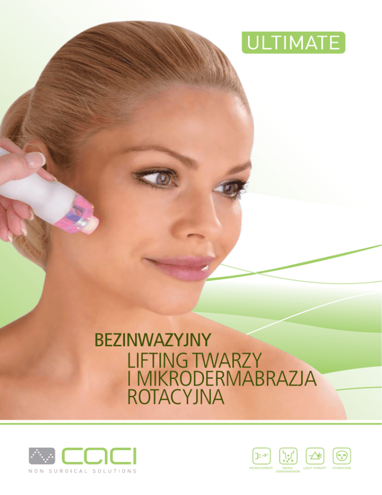 Bezinwazyjny lifting twarzy I mikrodermabrazja ROTACYJNA microcurrent microDERMABRAsion light therapy hydrAtone Bezinwazyjny Lifting Twarzy & Mikrodermabrazja Rotacyjna Po ponad 20 latach przeprowadzonych badań stworzono urządzenie CACI, które zostało wybrane i nagrodzone jako najbardziej skuteczna terapia anty-aging dostępna na rynku*. Urządzenie CACI Ultimate jest jedynym urządzeniem dającym możliwość przeprowadzania aż 3 zabiegów: bezinwazyjnego liftingu twarzy, bezkryształkowej mikrodermabrazji rotacyjnej oraz terapii światłem LED. Dzięki wielofunkcyjności urządzenia można proponować klientowi kompletną ofertę bezinwazyjnych zabiegów dermatologii estetycznej. MIKRODERMABRAZJA ROTACYJNA Mikrodermabrazja rotacyjna to nowa technologia złuszczania martwego naskórka, w której używa się jednorazowych nakładek złuszczających, obracających się ze zmienną prędkością wokół eliptycznej osi. Nakładki pokryte są węglikiem krzemu – pozyskiwanego laboratoryjnie minerału o twardości niewiele mniejszej od diamentu. W zależności od potrzeb, metoda ta pozwala na bardzo powierzchniowe lub głębokie złuszczanie naskórka. Ta unikalna, bezkryształkowa i bezpróżniowa metoda złuszczania pozwala uniknąć typowych problemów związanych z tradycyjną mikrodermabrazją – z dezynfekcją i konserwacją standardowych urządzeń do mikrodermabrazji. Wokół głowicy ze złuszczającą nakładką znajduje się lampa LED, która może być wykorzystywana w czasie zabiegu mikrodermabrazji lub w czasie masażu – jednocześnie ze specjalną głowicą do masażu. Światło LED głęboko stymuluje tkankę łączną, co poprawia krążenie krwi i limfy. KORZYŚCI Z MIKRODERMABRAZJI ROTACYJNEJ • • • Metoda bezkryształkowa – klient nie wdycha kryształków korundu, nie jest narażony na podrażnienia z nimi związane Metoda bezpróżniowa – skóra nie jest naciągana i zasysana Urządzenie nie zatyka się • • • • Wymienne końcówki dają klientowi poczucie higieny i komfortu Możliwość kontroli głębokości złuszczania 4 poziomy intensywności 3 rodzaje końcówek (fine – delikatna, medium – średnia, coarse – intensywna) MIKRODERMABRAZJA ROTACYJNA Innowacyjna bezkryształkowa mikrodermabrazja wzbogacona jednoczesną terapią światłem LED PRZED * Ankieta magazynu Professional Beauty PO Rotacyjny ruch głowicy ścierającej pozwala na stopniowe i kontrolowane złuszczanie naskórka oraz usuwanie zanieczyszczeń i niedoskonałości skórnych. Poprzez złuszczanie zewnętrznych warstw naskórka cera staje się czysta, promienna, gładka i wygląda młodziej. Rezultaty są widoczne już po 1 zabiegu. GRZEBIEŃ LED (TERAPIA ŚWIATŁEM LED) MIKROPRĄDY Grzebień LED to połączenie fotostymulacji światłem LED z mikroprądami o wysokiej częstotliwości. Synergia tych dwóch technologii wypełnia od wewnątrz zmarszczki i wygładza skórę, zmniejsza też rozstępy. Jest to bezinwazyjna i bezigłowa alternatywa dla zabiegów medycyny estetycznej polegających na iniekcji kolagenu i innych dermo-wypełniaczy. Mikroprądy pierwotnie stosowane były do leczenia porażenia nerwu twarzowego a obecnie terapia z wykorzystaniem mikroprądów jest szeroko stosowanym zabiegiem przeciwstarzeniowym. W praktyce wykorzystuje się mikroprądy o natężeniu mniejszym niż 1 mA (<1mA), ponieważ współgrają one harmonijnie z polem bioelektrycznym naszego ciała. Zastosowanie wyższego natężenia wywołuje skurcze mięśni twarzy, co może przyczynić się do pogłębienia się zmarszczek i linii mimicznych. Nasze mikroprądy nie wywołują skurczu mięśni, lecz działają reedukująco na mięśnie i w ten sposób uzyskuje się pożądany efekt. System CACI posiada opcję wyboru czerwonego lub niebieskiego światła LED oraz opcję wyboru strumienia światła LED, który jest wyjątkowo efektywny przy leczeniu trądziku oraz innych zmian skórnych. Ze względu na spektakularne efekty liftingujące i tonizujące, osiągane po zabiegu z wykorzystaniem mikroprądów urządzenia CACI, zabieg ten jest porównywany do liftingu chirurgicznego. GRZEBIEŃ LED PRZED PO Niektóre długości fal światła LED w połączeniu z mikroprądami o wysokiej częstotliwości aktywują pompę sodowo-potasową. Wspomaga to wymianę komórkową, uwalnianie jonów sodowych, protein kolagenu oraz glikozaminoglikanów kwasu hialuronowego. Efektem jest wypełnienie zmarszczek od wewnątrz oraz pobudzenie odnowy komórkowej i procesów naprawczych w skórze. ZWIĘKSZ SWOJE PRZYCHODY DZIĘKI URZĄDZENIU CACI ULTIMATE PRZYCHÓD ROCZNY Przychód zł 468 000 7 200 9 000 PRZYCHÓD TYGODNIOWY Kupując urządzenie CACI ULTIMATE, kupujesz Przychód zł więcej niż tylko urządzenie do wykonywania zabiegów kosmetycznych. Otrzymujesz też możliwość wykonywania zabiegów anty-aging na światowym poziomie, które pomogą rozwinąć Twój biznes. 5 400 374 400 3 600 187 200 1 800 Niech sukces CACI stanie się też Twoim udziałem! To marka, która zwiększy Twoje dochody. 280 800 93 600 * Przy założeniu, że zabiegi wykonywane są przez 6 dni w tygodniu, a 1 zabieg kosztuje 300 zł 1 2 3 4 5 Ilość zabiegów w ciągu dnia 1 2 3 4 Ilość zabiegów w ciągu dnia 5 HYDRATONE – NAWILŻANIE I ODMŁADZANIE W zabiegu Hydratone połączono działanie elektrod zakończonych kulkami z Hydro Maską - unikalną, przewodzącą prądy, silikonowożelową maską, która ma spektakularne działanie nawilżające. Kulkowe elektrody delikatnie masują twarz, a w tym czasie maska zostaje naładowana elektrycznie, dzięki czemu cała twarz „skąpana” jest w odmładzającej energii. Prąd dostarczany przez rolki do skóry uzupełnia potencjał bio-elektryczny w mięśniach twarzy, dzięki czemu stają się one bardziej elastyczne i jędrne. Wyzwolona energia transportuje składniki nawilżające zawarte w żelowej masce do głębszych warstw naskórka. Maska żelowa intensywnie nawilża skórę od 