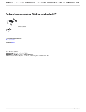 Baterie i zasilacze notebooków : ?adowarka samochodowa ASUS do noteboków 90W ?adowarka samochodowa ASUS do noteboków 90W AKASNAZ00090 Ocena: Nie ma jeszcze oceny Zapytaj o produkt ProducentASUS Opis Producent: ASUS Opis ogólny: N90W-02 CAR_CHARGER Wymiary [G x S x W]: 121.78 x 61.98x20.16mm mm Informacje dodatkowe: Wej?cie: 11-16V DC,12A MaxWyj?cie: 19V DC,4.73A Max 1 / 1 Powered by TCPDF (www.tcpdf.org)