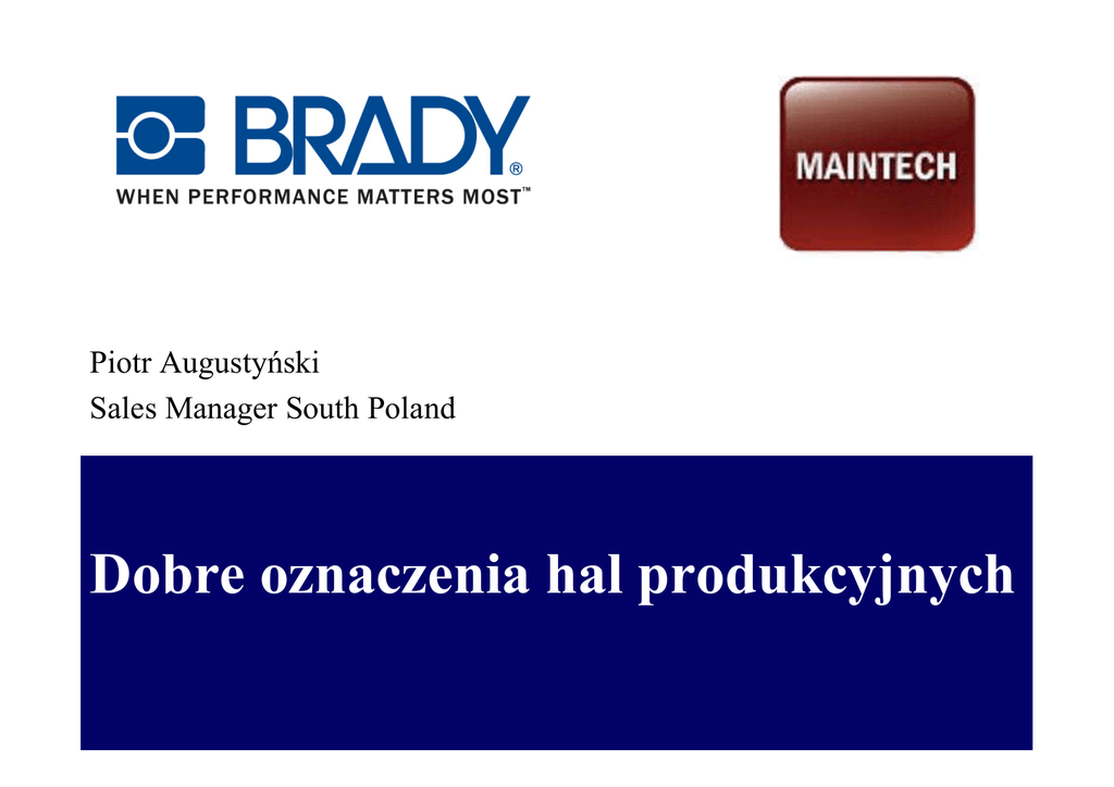 Piotr Augustyński Sales Manager South Poland Dobre oznaczenia hal produkcyjnych Plan prezentacji: • Kilka słów o firmie BRADY • Premiera podręcznej drukarki BMP21 • Jakie oznaczenia występują na halach produkcyjnych? • Opis poszczególnych rodzajów oznaczeń • Oznaczenia w nowoczesnych metodach zarządzania (LEAN, 5S, wizualizacja) • Przegląd przemysłowych systemów oznaczeń Profil firmy BRADY Korporacja Brady jest międzynarodowym producentem kompletnych systemów identyfikacji, zabezpieczeń hal produkcyjnych, wyrobów przemysłowych oraz pracowników. Produkty firmy Brady, do których zalicza się najwyŜszej jakości etykiety i oznaczenia, urządzenia zabezpieczające, drukarki wraz z oprogramowaniem, a takŜe elementy konstrukcyjne, wpływają na podwyŜszenie poziomu bezpieczeństwa oraz wydajności produkcji. Prezentacja firmy BRADY: MRO MRO - Rozwiązania dla Działu Utrzymania Ruchu i BHP: oznaczenia miejsc pracy, znaki bezpieczeństwa, systemy LOCKOUT, tagi, oznaczenia kabli, przewodów i rur, identyfikatory, drukarki. Prezentacja firmy BRADY: OEM OEM - Rozwiązania dla firm produkcyjnych: etykiety identyfikacyjne, oznaczenia elektroniki, elementy konstrukcyjne do telefonów komórkowych, komponenty do produkcji dysków twardych itp. Firma BRADY • • • • • • • ZałoŜona w 1914 r. w USA Obecnie zatrudnia prawie 10 000 ludzi na całym świecie Roczne obroty przekraczają 1500 milionów $ Notowana na Giełdzie Nowojorskiej od 1999 r. Obecna w ponad 70 krajach na 5 kontynentach W Europie obecna od lat 60 Kompletne rozwiązania w róŜnych segmentach rynku z produkcją etykiet, jako podstawową działalnością Podręczna drukarka etykiet BMP21 • Przenośna drukarka etykiet z klawiaturą i wyświetlaczem • Szybkie i łatwe tworzenie: • oznaczania kabli i przewodów, • wtyków, gniazd, tablic rozdzielczych • maszyn, urządzeń i środków trwałych • etykiet inspekcyjnych • innych oznaczeń przemysłowych • Etykiety Brady nie odklejają się i pozostają czytelne przez wiele lat. • Oznaczenia odporne na warunki przemysłowe. Przykłady zastosowań BMP21 Więcej informacji o BMP21 http://www.youtube.com/watch?v=hKqpFkpXsuU Jakie oznaczenia na halach? LOTO – Lockout / Tagout LOTO to system bezpieczeństwa dla Działu Utrzymania Ruchu. LOCKOUT – blokuje wszystkie typy niebezpiecznej energii na maszynach, podczas naprawy/ przeglądu TAGOUT – informuje o przeprowadzanych pracach na maszynie Oznaczenia: tagi, procedury, punkty LOTO Oznaczenia logistyczne i magazynowe Dobrze oznaczone magazyny to: • oszczędność czasu • brak pomyłek przy wydawaniu materiałów • systemy logistyczne oparte na kodach kreskowych • trwałe, czytelne oznaczenia oszczędzają czas i pieniądze Oznaczenia: regałów, miejsc paletowych, pojemników, maszyn i infrastruktury IT Oznaczenia bezpieczeństwa Oznaczenia bezpieczeństwa: • przeciwpoŜarowe / drogi ewakuacyjne • znaki bezpieczeństwa /równieŜ w 2 językach/ • oznaczenia stref niebezpiecznych • informacje o konieczności stosowania środków ochrony osobistej • oznaczenia rurociągów • oznaczenia zaworów / kabli / przewodów • odbojniki, słupki, łańcuchy • taśmy do zamykania stref • oznaczenia na podłodze /ciągi komunikacyjne/ Oznaczenia środków trwałych / maszyn • identyfikacja środków trwałych • skanery kodów kreskowych / terminale • tabliczki znamionowe • polskie opisy maszyn /dyrektywa maszynowa/ • etykiety plombowe • etykiety inspekcyjne • kalibracja maszyn / narzędzi • oznaczniki kabli i przewodów • oznaczenia kontroli jakości System zarządzania przeglądami • Safetrack – elektroniczne zarządzanie przegladami • Oprogramowanie komputerowe oparta o automatyczną identyfikację (tagi RFiD) oraz komputery przenośne • Pozwala zarządzać lepiej przeglądami – wiadomo kto, kiedy, co. Automatycznie generuje potwierdzenia i raporty •Oszczędza czas i pieniądze •Mniej przestojów i napraw, poprawne ustawienia LEAN Co to jest??? Koncepcja lean (ang. szczupły, chudy) w skrócie definiowana jest jako eliminacja czynności, które wykonywane są przy tworzeniu produktu lub usługi, a które nie dodają wartości temu produktowi lub usłudze. Chcąc osiągnąć odchudzoną z niepotrzebnych czynności produkcję naleŜy wykorzystać narzędzia, którymi lean dysponuje: • 5S - Selekcja, Systematyka, Sprzątanie, Standaryzacja i Samodyscyplina. • TPM - Total Productive Maintenance - Optymalne Utrzymanie Ruchu; celem jest zapewnienie maksymalnej dostępności krytycznych urządzeń. • SW – Standard Work - Standaryzacja wykonywanej pracy poprzez procedury • Visual Workplace – Wykorzystanie oznaczeń do stworzenia jak najbardziej ergonomicznego miejsca pracy Wizualizacja jest kluczem do LEAN Wizualizacja jest krytyczna do ustalenia standardów operacyjnych i ciągłego polepszania ergonomii miejsca pracy Przykład 5S Przykład SW Przykład TPM Wizualizacja – Smarowanie Wizualizacja - przeglądy Wizualizacja - Części Wizualizacja – Rozwiązywanie problemów Wizualizacja - Bezpieczeństwo Wizualizacja – przygotowanie do rozruchu Przemysłowe systemy oznaczeń • Pozwalają na wykonanie trwałych, przemysłowych oznaczeń • Wykorzystanie? – wszytko to, o czym była mowa wcześniej w prezentacji Zastosowania (1) Zastosowania (2) Drukarka przenośna HandiMark • • • • • • • • Przenośna drukarka termotransferowa z klawiaturą i wyświetlaczem Doskonałe urządzenie do tworzenia: – Oznaczeń - bezpośrednio na hali produkcyjnej, – Znaków bezpieczeństwa, – Oznaczenia rur, – Oznaczenia maszyn, kabli, przewodów, wyłączników, – Uzupełniania zniszczonych oznaczeń – Zalaminowanych przywieszek – najtrwalszy sposób oznaczeń Trwałe, przemysłowe oznaczenia samoprzylepne z bardzo mocnym klejem Druk termotransferowy gwarantuje trwałość i czytelność oznaczeń przez długie lata
