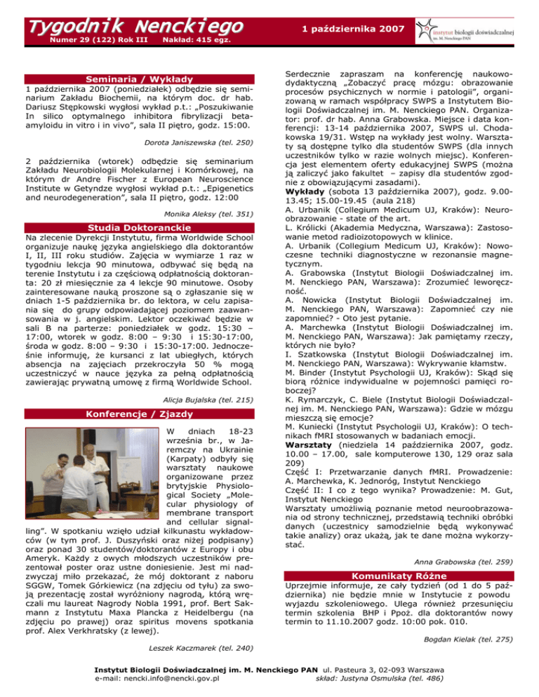 Tygodnik Nenckiego Numer 29 (122) Rok III 1 października 2007 Nakład: 415 egz. Seminaria / Wykłady 1 października 2007 (poniedziałek) odbędzie się seminarium Zakładu Biochemii, na którym doc. dr hab. Dariusz Stępkowski wygłosi wykład p.t.: „Poszukiwanie In silico optymalnego inhibitora fibrylizacji betaamyloidu in vitro i in vivo”, sala II piętro, godz. 15:00. Dorota Janiszewska (tel. 250) 2 października (wtorek) odbędzie się seminarium Zakładu Neurobiologii Molekularnej i Komórkowej, na którym dr Andre Fischer z European Neuroscience Institute w Getyndze wygłosi wykład p.t.: „Epigenetics and neurodegeneration”, sala II piętro, godz. 12:00 Monika Aleksy (tel. 351) Studia Doktoranckie Na zlecenie Dyrekcji Instytutu, firma Worldwide School organizuje naukę języka angielskiego dla doktorantów I, II, III roku studiów. Zajęcia w wymiarze 1 raz w tygodniu lekcja 90 minutowa, odbywać się będą na terenie Instytutu i za częściową odpłatnością doktoranta: 20 zł miesięcznie za 4 lekcje 90 minutowe. Osoby zainteresowane nauką proszone są o zgłaszanie się w dniach 1-5 października br. do lektora, w celu zapisania się do grupy odpowiadającej poziomem zaawansowania w j. angielskim. Lektor oczekiwać będzie w sali B na parterze: poniedziałek w godz. 15:30 – 17:00, wtorek w godz. 8:00 – 9:30 i 15:30-17:00, środa w godz. 8:00 – 9:30 i 15:30-17:00. Jednocześnie informuję, że kursanci z lat ubiegłych, których absencja na zajęciach przekroczyła 50 % mogą uczestniczyć w nauce języka za pełną odpłatnością zawierając prywatną umowę z firmą Worldwide School. Alicja Bujalska (tel. 215) Konferencje / Zjazdy W dniach 18-23 września br., w Jaremczy na Ukrainie (Karpaty) odbyły się warsztaty naukowe organizowane przez brytyjskie Physiological Society „Molecular physiology of membrane transport and cellular signalling”. W spotkaniu wzięło udział kilkunastu wykładowców (w tym prof. J. Duszyński oraz niżej podpisany) oraz ponad 30 studentów/doktorantów z Europy i obu Ameryk. Każdy z owych młodszych uczestników prezentował poster oraz ustne doniesienie. Jest mi nadzwyczaj miło przekazać, że mój doktorant z naboru SGGW, Tomek Górkiewicz (na zdjęciu od tyłu) za swoją prezentację został wyróżniony nagrodą, którą wręczali mu laureat Nagrody Nobla 1991, prof. Bert Sakmann z Instytutu Maxa Plancka z Heidelbergu (na zdjęciu po prawej) oraz spiritus movens spotkania prof. Alex Verkhratsky (z lewej). Serdecznie zapraszam na konferencję naukowodydaktyczną „Zobaczyć pracę mózgu: obrazowanie procesów psychicznych w normie i patologii”, organizowaną w ramach współpracy SWPS a Instytutem Biologii Doświadczalnej im. M. Nenckiego PAN. Organizator: prof. dr hab. Anna Grabowska. Miejsce i data konferencji: 13-14 października 2007, SWPS ul. Chodakowska 19/31. Wstęp na wykłady jest wolny. Warsztaty są dostępne tylko dla studentów SWPS (dla innych uczestników tylko w razie wolnych miejsc). Konferencja jest elementem oferty edukacyjnej SWPS (można ją zaliczyć jako fakultet – zapisy dla studentów zgodnie z obowiązującymi zasadami). Wykłady (sobota 13 października 2007), godz. 9.0013.45; 15.00-19.45 (aula 218) A. Urbanik (Collegium Medicum UJ, Kraków): Neuroobrazowanie - state of the art. L. Królicki (Akademia Medyczna, Warszawa): Zastosowanie metod radioizotopowych w klinice. A. Urbanik (Collegium Medicum UJ, Kraków): Nowoczesne techniki diagnostyczne w rezonansie magnetycznym. A. Grabowska (Instytut Biologii Doświadczalnej im. M. Nenckiego PAN, Warszawa): Zrozumieć leworęczność. A. Nowicka (Instytut Biologii Doświadczalnej im. M. Nenckiego PAN, Warszawa): Zapomnieć czy nie zapomnieć? - Oto jest pytanie. A. Marchewka (Instytut Biologii Doświadczalnej im. M. Nenckiego PAN, Warszawa): Jak pamiętamy rzeczy, których nie było? I. Szatkowska (Instytut Biologii Doświadczalnej im. M. Nenckiego PAN, Warszawa): Wykrywanie kłamstw. M. Binder (Instytut Psychologii UJ, Kraków): Skąd się biorą różnice indywidualne w pojemności pamięci roboczej? K. Rymarczyk, C. Biele (Instytut Biologii Doświadczalnej im. M. Nenckiego PAN, Warszawa): Gdzie w mózgu mieszczą się emocje? M. Kuniecki (Instytut Psychologii UJ, Kraków): O technikach fMRI stosowanych w badaniach emocji. Warsztaty (niedziela 14 października 2007, godz. 10.00 – 17.00, sale komputerowe 130, 129 oraz sala 209) Część I: Przetwarzanie danych fMRI. Prowadzenie: A. Marchewka, K. Jednoróg, Instytut Nenckiego Część II: I co z tego wynika? Prowadzenie: M. Gut, Instytut Nenckiego Warsztaty umożliwią poznanie metod neuroobrazowania od strony technicznej, przedstawią techniki obróbki danych (uczestnicy samodzielnie będą wykonywać takie analizy) oraz ukażą, jak te dane można wykorzystać. Anna Grabowska (tel. 259) Komunikaty Różne Uprzejmie informuje, ze cały tydzień (od 1 do 5 października) nie będzie mnie w Instytucie z powodu wyjazdu szkoleniowego. Ulega również przesunięciu termin szkolenia BHP i Ppoż. dla doktorantów nowy termin to 11.10.2007 godz. 10:00 pok. 010. Bogdan Kielak (tel. 275) Leszek Kaczmarek (tel. 240) Instytut Biologii Doświadczalnej im. M. Nenckiego PAN ul. Pasteura 3, 02-093 Warszawa e-mail: [email protected] skład: Justyna Osmulska (tel. 486)