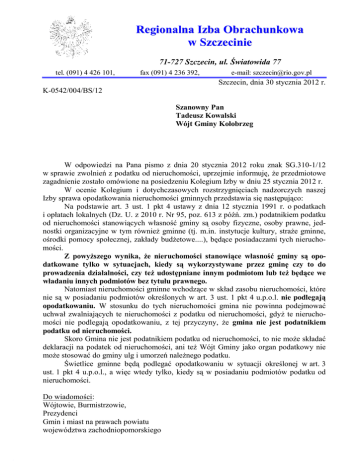 Regionalna Izba Obrachunkowa w Szczecinie 71-727 Szczecin, ul. Światowida 77 tel. (091) 4 426 101, fax (091) 4 236 392, e-mail: [email protected] Szczecin, dnia 30 stycznia 2012 r. K-0542/004/BS/12 Szanowny Pan Tadeusz Kowalski Wójt Gminy Kołobrzeg W odpowiedzi na Pana pismo z dnia 20 stycznia 2012 roku znak SG.310-1/12 w sprawie zwolnień z podatku od nieruchomości, uprzejmie informuję, że przedmiotowe zagadnienie zostało omówione na posiedzeniu Kolegium Izby w dniu 25 stycznia 2012 r. W ocenie Kolegium i dotychczasowych rozstrzygnięciach nadzorczych naszej Izby sprawa opodatkowania nieruchomości gminnych przedstawia się następująco: Na podstawie art. 3 ust. 1 pkt 4 ustawy z dnia 12 stycznia 1991 r. o podatkach i opłatach lokalnych (Dz. U. z 2010 r. Nr 95, poz. 613 z późń. zm.) podatnikiem podatku od nieruchomości stanowiących własność gminy są osoby fizyczne, osoby prawne, jednostki organizacyjne w tym również gminne (tj. m.in. instytucje kultury, straże gminne, ośrodki pomocy społecznej, zakłady budżetowe....), będące posiadaczami tych nieruchomości. Z powyższego wynika, że nieruchomości stanowiące własność gminy są opodatkowane tylko w sytuacjach, kiedy są wykorzystywane przez gminę czy to do prowadzenia działalności, czy też udostępniane innym podmiotom lub też będące we władaniu innych podmiotów bez tytułu prawnego. Natomiast nieruchomości gminne wchodzące w skład zasobu nieruchomości, które nie są w posiadaniu podmiotów określonych w art. 3 ust. 1 pkt 4 u.p.o.l. nie podlegają opodatkowaniu. W stosunku do tych nieruchomości gmina nie powinna podejmować uchwał zwalniających te nieruchomości z podatku od nieruchomości, gdyż te nieruchomości nie podlegają opodatkowaniu, z tej przyczyny, że gmina nie jest podatnikiem podatku od nieruchomości. Skoro Gmina nie jest podatnikiem podatku od nieruchomości, to nie może składać deklaracji na podatek od nieruchomości, ani też Wójt Gminy jako organ podatkowy nie może stosować do gminy ulg i umorzeń należnego podatku. Świetlice gminne będą podlegać opodatkowaniu w sytuacji określonej w art. 3 ust. 1 pkt 4 u.p.o.l., a więc wtedy tylko, kiedy są w posiadaniu podmiotów podatku od nieruchomości. Do wiadomości: Wójtowie, Burmistrzowie, Prezydenci Gmin i miast na prawach powiatu województwa zachodniopomorskiego 2 Szczecin, dnia 13 lutego 2012 r. K-0542/004.2/MK/12 Szanowny Pan Tadeusz Kowalski Wójt Gminy Kołobrzeg Nawiązując do przesłanego Panu Wójtowi stanowiska Kolegium Izby z dnia 25 stycznia 2012 r. (znak pisma: K-0542/004/BS/12 z dnia 30 stycznia 2012 r.) w sprawie zwolnień z podatku od nieruchomości uprzejmie informuję, iż w dniu 26 stycznia 2012 r. na posiedzeniu Sejmu Pan Maciej Grabowski – Podsekretarz Stanu w Ministerstwie Finansów przedstawił stanowisko Ministerstwa Finansów w sprawie opodatkowania podatkiem od nieruchomości mienia gminnego, którego kopię przesyłam w załączeniu. Kolegium Izby swoje stanowisko wypracowało po szczegółowej analizie przepisów ustawy – Ordynacja podatkowa oraz ustawy o podatkach i opłatach lokalnych, a także posiłkowało się orzeczeniem WSA w Gliwicach z dnia 1 marca 2011 r. sygn. akt I SA/Gl 56/11. Zwracam uwagę, iż stanowisko Ministerstwa Finansów w przedmiotowej sprawie jest późniejsze i odmienne od stanowiska Kolegium Izby. W powyższej sytuacji, przy opodatkowaniu podatkiem od nieruchomości mienia gminnego prosimy podejmować decyzje we własnym zakresie. Należy uwzględnić możliwość kwestionowania przez UKS pomijania opodatkowania mienia gminnego i wnioskowania o korektę sprawozdań dotyczących dochodów gmin, które to zmiany skutkują wzrostem wskaźnika G na jednego mieszkańca danej gminy, a co za tym idzie przeliczeniu przez Ministerstwo Finansów naliczonej wcześniej subwencji wyrównawczej. W załączeniu: - kopia pisma w sprawie stanowiska Ministerstwa Finansów dotyczącego opodatkowania podatkiem od nieruchomości mienia gminnego Do wiadomości: Szanowni Państwo Wójtowie, Burmistrzowie, Prezydenci miast na prawach powiatu Województwa Zachodniopomorskiego Odpowiedź na Interpelację nr 667 w sprawie opodatkowania podatkiem od nieruchomości mienia gminnego Odpowiadający Maciej Grabowski - podsekretarz stanu w Ministerstwie Finansów Data wpływu 16-01-2012 Data ogłoszenia 26-01-2012 - posiedzenie nr 6 Szanowna Pani Marszałek! Odpowiadając na interpelację pana Jerzego Materny, posła na Sejm RP, z dnia 21 grudnia 2011 r. w sprawie opodatkowania podatkiem od nieruchomości mienia gminnego, nadesłaną przy piśmie Marszałka Sejmu z dnia 30 grudnia 2011 r., znak: SPS-023667/11, uprzejmie informuję. Podatnikiem podatku od nieruchomości jest zasadniczo właściciel nieruchomości lub użytkownik wieczysty, a w niektórych przypadkach posiadacz. Gdy właścicielem nieruchomości jest gmina i nieruchomość ta nie korzysta ze zwolnienia, wyłączenia podatkowego (nie jest zajęta na potrzeby organów jednostek samorządu terytorialnego) ani nie znajduje się w posiadaniu innego podmiotu, gmina jest podatnikiem podatku od nieruchomości od tej nieruchomości (art. 3 ustawy z dnia 12 stycznia 1991 r. o podatkach i opłatach lokalnych – Dz. U. z 2010 r. Nr 95, poz. 613, ze zm.). W obecnym stanie prawnym na mocy art. 2 ust. 3 pkt 4 ww. ustawy z wyłączenia z opodatkowania podatkiem od nieruchomości korzystają drogi publiczne. Do dróg publicznych, zgodnie z art. 2 ust. 1 ustawy z dnia 21 marca 1985 r. o drogach publicznych (Dz. U. z 2007 r. Nr 19, poz. 115, ze zm.), zaliczane są m.in. drogi gminne. Drogi inne niż publiczne, w tym drogi wewnętrzne, których właścicielem jest gmina, podlegają opodatkowaniu podatkiem od nieruchomości. Przedmiotem wątpliwości jest relacja powyższego przepisu, z którego wynika obowiązek podatkowy gmin w zakresie podatku od nieruchomości od dróg, będących ich własnością, do art. 5 ustawy z dnia 29 sierpnia 19