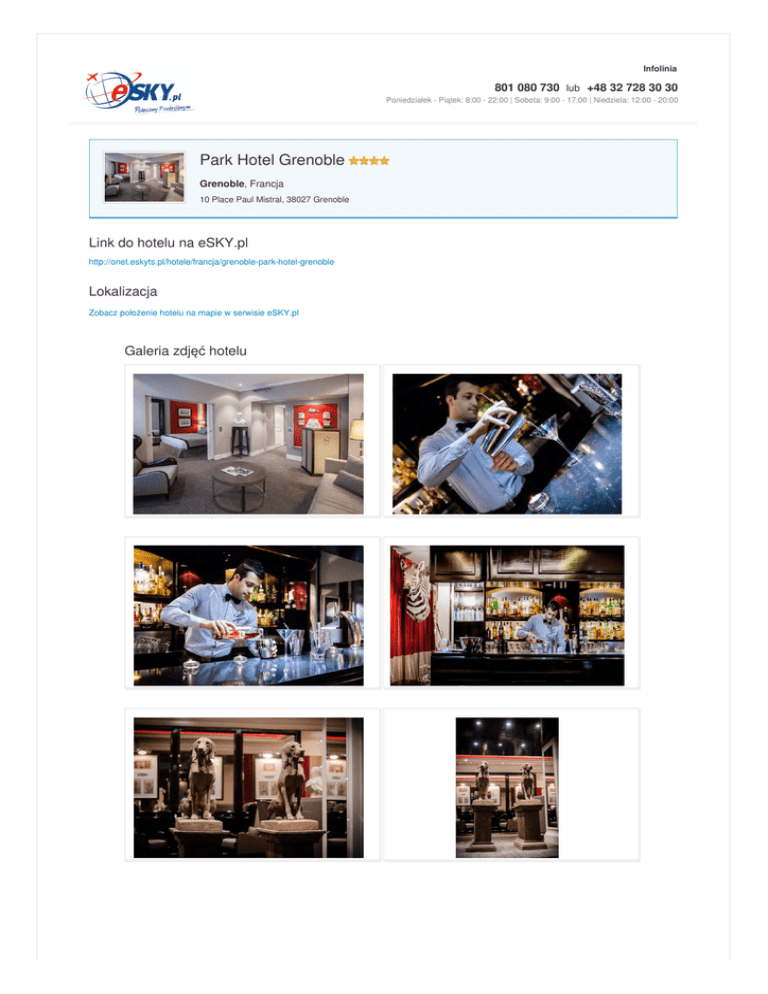 Infolinia 801 080 730 lub +48 32 728 30 30 Poniedziałek - Piątek: 8:00 - 22:00 | Sobota: 9:00 - 17:00 | Niedziela: 12:00 - 20:00 Park Hotel Grenoble Grenoble, Francja 10 Place Paul Mistral, 38027 Grenoble Link do hotelu na eSKY.pl http://onet.eskyts.pl/hotele/francja/grenoble-park-hotel-grenoble Lokalizacja Zobacz położenie hotelu na mapie w serwisie eSKY.pl Galeria zdjęć hotelu Hotele – Bilety lotnicze – Tanie linie lotnicze – Ubezpieczenia Podróżne