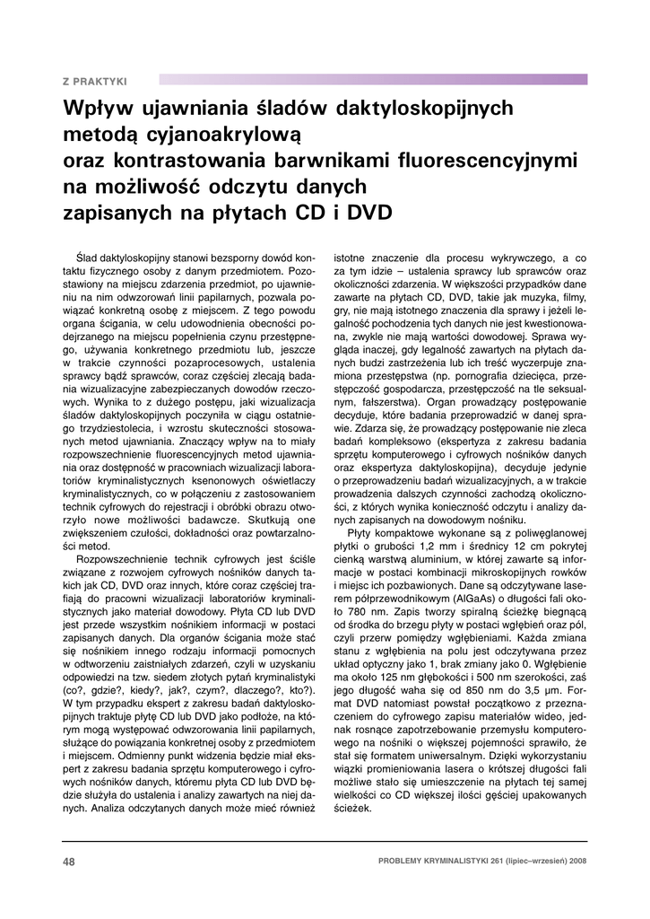 Z PRAKTYKI Wpływ ujawniania śladów daktyloskopijnych metodą cyjanoakrylową oraz kontrastowania barwnikami fluorescencyjnymi na możliwość odczytu danych zapisanych na płytach CD i DVD Œlad daktyloskopijny stanowi bezsporny dowód kontaktu fizycznego osoby z danym przedmiotem. Pozostawiony na miejscu zdarzenia przedmiot, po ujawnieniu na nim odwzorowañ linii papilarnych, pozwala powi¹zaæ konkretn¹ osobê z miejscem. Z tego powodu organa œcigania, w celu udowodnienia obecnoœci podejrzanego na miejscu pope³nienia czynu przestêpnego, u¿ywania konkretnego przedmiotu lub, jeszcze w trakcie czynnoœci pozaprocesowych, ustalenia sprawcy b¹dŸ sprawców, coraz czêœciej zlecaj¹ badania wizualizacyjne zabezpieczanych dowodów rzeczowych. Wynika to z du¿ego postêpu, jaki wizualizacja œladów daktyloskopijnych poczyni³a w ci¹gu ostatniego trzydziestolecia, i wzrostu skutecznoœci stosowanych metod ujawniania. Znacz¹cy wp³yw na to mia³y rozpowszechnienie fluorescencyjnych metod ujawniania oraz dostêpnoœæ w pracowniach wizualizacji laboratoriów kryminalistycznych ksenonowych oœwietlaczy kryminalistycznych, co w po³¹czeniu z zastosowaniem technik cyfrowych do rejestracji i obróbki obrazu otworzy³o nowe mo¿liwoœci badawcze. Skutkuj¹ one zwiêkszeniem czu³oœci, dok³adnoœci oraz powtarzalnoœci metod. Rozpowszechnienie technik cyfrowych jest œciœle zwi¹zane z rozwojem cyfrowych noœników danych takich jak CD, DVD oraz innych, które coraz czêœciej trafiaj¹ do pracowni wizualizacji laboratoriów kryminalistycznych jako materia³ dowodowy. P³yta CD lub DVD jest przede wszystkim noœnikiem informacji w postaci zapisanych danych. Dla organów œcigania mo¿e staæ siê noœnikiem innego rodzaju informacji pomocnych w odtworzeniu zaistnia³ych zdarzeñ, czyli w uzyskaniu odpowiedzi na tzw. siedem z³otych pytañ kryminalistyki (co?, gdzie?, kiedy?, jak?, czym?, dlaczego?, kto?). W tym przypadku ekspert z zakresu badañ daktyloskopijnych traktuje p³ytê CD lub DVD jako pod³o¿e, na którym mog¹ wystêpowaæ odwzorowania linii papilarnych, s³u¿¹ce do powi¹zania konkretnej osoby z przedmiotem i miejscem. Odmienny punkt widzenia bêdzie mia³ ekspert z zakresu badania sprzêtu komputerowego i cyfrowych noœników danych, któremu p³yta CD lub DVD bêdzie s³u¿y³a do ustalenia i analizy zawartych na niej danych. Analiza odczytanych danych mo¿e mieæ równie¿ 48 istotne znaczenie dla procesu wykrywczego, a co za tym idzie – ustalenia sprawcy lub sprawców oraz okolicznoœci zdarzenia. W wiêkszoœci przypadków dane zawarte na p³ytach CD, DVD, takie jak muzyka, filmy, gry, nie maj¹ istotnego znaczenia dla sprawy i je¿eli legalnoœæ pochodzenia tych danych nie jest kwestionowana, zwykle nie maj¹ wartoœci dowodowej. Sprawa wygl¹da inaczej, gdy legalnoœæ zawartych na p³ytach danych budzi zastrze¿enia lub ich treœæ wyczerpuje znamiona przestêpstwa (np. pornografia dzieciêca, przestêpczoœæ gospodarcza, przestêpczoœæ na tle seksualnym, fa³szerstwa). Organ prowadz¹cy postêpowanie decyduje, które badania przeprowadziæ w danej sprawie. Zdarza siê, ¿e prowadz¹cy postêpowanie nie zleca badañ kompleksowo (ekspertyza z zakresu badania sprzêtu komputerowego i cyfrowych noœników danych oraz ekspertyza daktyloskopijna), decyduje jedynie o przeprowadzeniu badañ wizualizacyjnych, a w trakcie prowadzenia dalszych czynnoœci zachodz¹ okolicznoœci, z których wynika koniecznoœæ odczytu i analizy danych zapisanych na dowodowym noœniku. P³yty kompaktowe wykonane s¹ z poliwêglanowej p³ytki o gruboœci 1,2 mm i œrednicy 12 cm pokrytej cienk¹ warstw¹ aluminium, w której zawarte s¹ informacje w postaci kombinacji mikroskopijnych rowków i miejsc ich pozbawionych. Dane s¹ odczytywane laserem pó³przewodnikowym (AlGaAs) o d³ugoœci fali oko³o 780 nm. Zapis tworzy spiraln¹ œcie¿kê biegn¹c¹ od œrodka do brzegu p³yty w postaci wg³êbieñ oraz pól, czyli przerw pomiêdzy wg³êbieniami. Ka¿da zmiana stanu z wg³êbienia na polu jest odczytywana przez uk³ad optyczny jako 1, brak zmiany jako 0. Wg³êbienie ma oko³o 125 nm g³êbokoœci i 500 nm szerokoœci, zaœ jego d³ugoœæ waha siê od 850 nm do 3,5 μm. Format DVD natomiast powsta³ pocz¹tkowo z przeznaczeniem do cyfrowego zapisu materia³ów wideo, jednak rosn¹ce zapotrzebowanie przemys³u komputerowego na noœniki o wiêkszej pojemnoœci sprawi³o, ¿e sta³ siê formatem uniwersalnym. Dziêki wykorzystaniu wi¹zki promieniowania lasera o krótszej d³ugoœci fali mo¿liwe sta³o siê umieszczenie na p³ytach tej samej wielkoœci co CD wiêkszej iloœci gêœciej upakowanych œcie¿ek. PROBLEMY KRYMINALISTYKI 261 (lipiec–wrzesieñ) 2008 Z PRAKTYKI Z punktu widzenia badañ wizualizacyjnych p³yty CD lub DVD stanowi¹ pod³o¿e niech³onne, na które standardowo stosuje siê sekwencjê metod ujawniania: polimeryzacja cyjanoakrylanów, Ardrox i safranina (ryc. 1). W celu sprawdzenia wp³ywu ww. metod na trwa³oœæ danych oraz mo¿liwoœæ ich odczytu przeprowadzono badania. Wytypowano szeœæ niezapisanych p³yt CD-R oraz cztery DVD+/–R (ryc. 2, 3). Litera R w symbolu p³yty oznacza, ¿e jest przeznaczona do jednokrotnego zapisu danych (ang. recordable). Nastêpnie p³yty CD i DVD zapisano danymi w postaci plików (dokumenty, zdjêcia, programy) z u¿yciem odpowiednich nagrywarek. Po zapisaniu danych na p³ytach sprawdzano mo¿liwoœæ ich odczytu przez napêd CD lub DVD. Brano pod uwagê dwa kryteria: po pierwsze, czy napêd mo¿e odczytaæ noœnik, po drugie, czy podczas kopiowania ca³oœci danych z noœnika na dysk twardy komputera wystêpowa³y b³êdy. W dalszej kolejnoœci na powierzchnie s³u¿¹ce do zapisu danych naniesiono odbitki linii papilarnych poprzez przy³o¿enie opuszek palców. Pozostawienie odwzorowañ linii papilarnych na powierzchni p³yt nie powodowa³o zmian w mo¿liwoœci odczytu danych. Tak przygotowany materia³ poddano procesowi