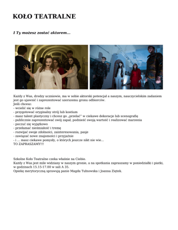 KOŁO TEATRALNE I Ty możesz zostać aktorem... Każdy z Was, drodzy uczniowie, ma w sobie aktorski potencjał a naszym, nauczycielskim zadaniem jest go ujawnić i zaprezentować szerszemu gronu odbiorców. Jeśli chcesz: - wcielić się w różne role - przygotować oryginalny strój lub kostium - masz talent plastyczny i chcesz go „przelać” w ciekawe dekoracje lub scenografię - publicznie zaprezentować swój zapał, podnieść swoją wartość i realizować marzenia - poczuć się wyjątkowo - przełamać nieśmiałość i tremę - rozwijać swoje zdolności, zainteresowania, pasje - zawiązać nowe znajomości i przyjaźnie - i ... masz ciekawe pomysły, o których jeszcze nikt nie wie... TO ZAPRASZAMY!!! Szkolne Koło Teatralne czeka właśnie na Ciebie. Każdy z Was jest mile widziany w naszym gronie, a na spotkania zapraszamy w poniedziałki i piatki, w godzinach 15.15-17.00 w sali A 35. Opiekę merytoryczną sprawują panie Magda Tułnowska i Joanna Ziętek.