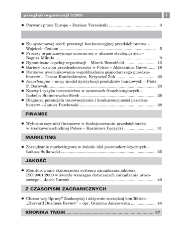 przegląd organizacji 5/2005 Porwani przez Europę – Dariusz Teresiński .......................................... 3 Ku systemowej teorii przewagi konkurencyjnej przedsiębiorstwa – Wojciech Czakon ...................................................................................... 5 Procesy organizacyjnego uczenia się w aliansie strategicznym – Bogusz Mikuła .......................................................................................... 9 Dynamiczne aspekty organizacji – Marek Brzeziński ........................... 13 Bariery rozwoju przedsiębiorczości w Polsce – Aleksandra Gaweł ...... 16 Rynkowe uwarunkowania współdziałania gospodarczego przedsiębiorstw – Teresa Kondrakiewicz, Krzysztof Żuk ................................... 20 Assurbanque – nowy model dystrybucji produktów bankowych – Piotr F. Borowski ............................................................................................... 23 Koszty i ryzyko uczestnictwa w systemach franchisingowych – Izabella Steinerowska-Streb ................................................................... 26 Diagnoza potencjału innowacyjności i konkurencyjności przedsiębiorstw – Janusz Pawłowski .................................................................... 28 FINANSE Wybrane czynniki finansowe w funkcjonowaniu przedsiębiorstw w środkowowschodniej Polsce – Kazimierz Łęczycki ............................ 31 MARKETING Zarządzanie marketingowe w świetle idei postmodernistycznych – Łukasz Sułkowski ..................................................................................... 35 JAKOŚĆ Monitorowanie skuteczności systemu zarządzania jakością ISO 9001:2000 w świetle wymagań dotyczących zarządzania procesowego – Jacek Łuczak ............................................................................ 40 Z CZASOPISM ZAGRANICZNYCH Chcesz współpracy? Zaakceptuj i aktywnie zarządzaj konfliktem – „Harvard Business Review” – opr. Grażyna Aniszewska ...................... 44 KRONIKA TNOiK ......................................................................... 47 1 2 przegląd PRENUMERATA MIESIĘCZNIK TNOiK ZAŁOŻYŁ KAROL ADAMIECKI w 1926 r. NR 5 (784) 2005 CZY PAMIĘTAJĄ PAŃSTWO O PRENUMERACIE „PRZEGLĄDU ORGANIZACJI” Rada Programowa: prof. Krzysztof Obłój – przewodniczący, prof. Henryk Bieniok, prof. Ryszard Borowiecki, dr Ewa Gołębiowska, prof. Andrzej K. Koźmiński, prof. Ryszard Rutka, prof. Edward Urbańczyk Barbara Olędzka – red. naczelny Dariusz Teresiński – z-ca red. naczelnego Kolegium Redakcyjne: dr Grażyna Aniszewska, dr Mieczysław Ciurla, prof. Zbigniew Dworzecki, prof. Bogdan Nogalski, prof. Janusz Pyka Prenumerata: Renata Jaworska Adres redakcji: ul. Boduena 4 m. 22 00-011 Warszawa tel./faks 827-15-10 e-mail: [email protected] [email protected] Korespondenci: Białystok – tel. 654-52-46 mgr Julita Nowakowska; Bydgoszcz – tel. 341-27-06 dr Andrzej Chajęcki; Częstochowa – tel. 324-34-76, tel./fax 324-55-36 dr Edward Jędrzejewski; Gdańsk – tel. 341-93-70, 341-45-11 mgr Wanda Stankiewicz; Gorzów Wlkp. – tel./fax 722-75-23 mgr inż. Aleksy Wołoszyn; Katowice – tel. 258-16-06 dr inż. Krzysztof Pałucha; Kraków – tel. 633-40-82, dr Andrzej Jaki; Lublin – tel. 532-99-18 prof. dr hab. Ewa Bojar; Opole – tel. 454-41-07 dr Stanisław Grycner; Radom – tel. 362-56-63 Bożena Makowska; Rzeszów – tel. 86-36-398 dr hab. Jan Łukasiewicz; Toruń – tel. 622-29-98 mgr Elżbieta Jakubowska; Zielona Góra – tel. 327-00-99, tel./fax 327-14-47 mgr inż. Artur Kot Wydawca: Towarzystwo Naukowe Organizacji i Kierownictwa Indeks: ISSN-0137-7221. Nakład nie przekracza 15 tys. Łamanie: STAND’s, tel. 757-38-02 Montaż i druk: EFEKT, Warszawa ul. Lubelska 30/32 Redakcja nie odpowiada za treść ogłoszeń, nie płaci za nie zamówione materiały i nie zwraca ich oraz zastrzega sobie prawo do zmiany tytułów i skracania tekstów. Prenumerata w redakcji Zamówienia przyjmujemy w dowolnym terminie na dowolny okres, przy czym prenumeratę automatycznie przedłużamy. Aby zamówić prenumeratę „Przeglądu”, wystarczy uiścić odpowiednią opłatę na konto: Redakcja „Przeglądu Organizacji”, Bank Millennium SA, IV O/Warszawa nr 85 1160 2202 0000 0000 5515 9488. Na odwrocie przekazu (na przelewie) prosimy podać dokładny adres zamawiającego, liczbę zamawianych egzemplarzy oraz okres, za jaki opłata jest wnoszona. Fakturę na przelaną kwotę redakcja wyśle razem z najbliższym numerem. Fakturę na prenumeratę automatycznie przedłużoną – osobnym listem poleconym. Cena prenumeraty na 2005 r.: – kwartalna – 57 zł, – półroczna – 114 zł, – całoroczna – 228 zł. Opłata za prenumeratę ze zleceniem wysyłki za granicę jest o 100% wyższa. Opłaty pocztowe wliczone są zarówno w cenę prenumeraty krajowej, jak i zagranicznej. Prenumerata w „RUCH” SA Prenumerata krajowa: Przez „RUCH” SA – wpłaty na prenumeratę przyjmują jednostki kolportażowe „RUCH” SA właściwe dla miejsca zamieszkania. Termin przyjmowania wpłat na prenumeratę krajową do 5 każdego miesiąca poprzedzającego okres rozpoczęcia prenumeraty. W internecie http://www.prenumerata.ruch.com.pl Prenumerata opłacana w złotówkach ze zleceniem wysyłki za granicę: Informacji o warunkach prenumeraty i sposobie zamawiania udziela „RUCH” SA Oddział Krajowej Dystrybucji Prasy, 01-248 Warszawa, ul. Jana Kazimierza 31/33, Warszawa; telefony (022) 5328-816, (022) 5328819, (022) 5328-731; infolinia 0-800-120029, wpłaty na konto w banku PEKAO SA IV O/Warszawa, Nr 68124010531111000004430494 lub kasa Oddziału. Dokonując wpłaty za prenumeratę w Banku czy też w Urzędzie Pocztowym należy podać: nazwę naszej firmy, nazwę banku, numer konta, czytelny pełny adres odbiorcy za granicą, okres prenumeraty, rodzaj wysyłki (pocztą priorytetową czy zwykłą) oraz zamawiany tytuł. Warunkiem rozpocz