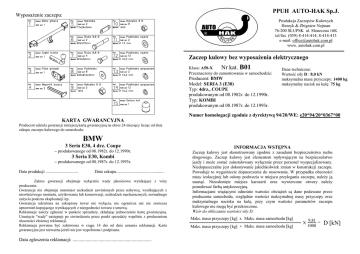 PPUH AUTO-HAK Sp.J. WyposaŜenie zaczepu: Produkcja Zaczepów Kulowych Henryk & Zbigniew Nejman 76-200 SŁUPSK ul. Słoneczna 16K tel/fax (059) 8-414-414; 8-414-413 e-mail: [email protected] www. autohak.com.pl Zaczep kulowy bez wyposaŜenia elektrycznego B01 Klasa: A50-X Nr kat. Przeznaczony do zamontowania w samochodzie: Producent: BMW Model: SERIA 3 (E30) Typ: 4drz., COUPE produkowanym od 08.1982r. do 12.1990r. Typ: KOMBI produkowanym od 08.1987r. do 12.1993r. Dane techniczne: Wartość siły D : 8,0 kN maksymalna masa przyczepy: 1400 kg maksymalny nacisk na kulę: 75 kg Numer homologacji zgodnie z dyrektywą 94/20/WE: e20*94/20*0367*00 KARTA GWARANCYJNA Producent udziela gwarancji niniejszą kartą gwarancyjną na okres 24 miesięcy licząc od dnia zakupu zaczepu kulowego do samochodu: BMW 3 Seria E30, 4 drz. Coupe – produkowanego od 08.1982r. do 12.1990r. 3 Seria E30, Kombi – produkowanego od 08.1987r. do 12.1993r. Data produkcji .............................. Data zakupu............................................. Zakres gwarancji obejmuje wyłącznie wady jakościowe wynikające z winy producenta. Gwarancja nie obejmuje natomiast uszkodzeń zawinionych przez nabywcę, wynikających z niewłaściwego montaŜu, uŜytkowania lub konserwacji, uszkodzeń mechanicznych, normalnego zuŜycia podczas eksploatacji itp. Gwarancja udzielona na zakupiony towar nie wyłącza, nie ogranicza ani nie zawiesza uprawnień kupującego wynikających z niezgodności towaru z umową. Reklamacje naleŜy zgłaszać w punkcie sprzedaŜy, składając jednocześnie kartę gwarancyjną. Usunięcie "wady" następuje po stwierdzeniu przez punkt sprzedaŜy wspólnie z producentem słuszności złoŜonej reklamacji. Reklamacja powinna być załatwiona w ciągu 14 dni od dnia uznania reklamacji. Karta gwarancyjna jest niewaŜna jeŜeli nie jest wypełniona i podpisana. Data zgłoszenia reklamacji: ................................................................... INFORMACJA WSTĘPNA Zaczep kulowy jest skonstruowany zgodnie z zasadami bezpieczeństwa ruchu drogowego. Zaczep kulowy jest elementem wpływającym na bezpieczeństwo jazdy i moŜe zostać zainstalowany wyłącznie przez personel wyspecjalizowany. Niedopuszczalne jest dokonywanie jakichkolwiek zmian w konstrukcji zaczepu. Powoduje to wygaśniecie dopuszczenia do stosowania. W przypadku obecności masy izolacyjnej lub osłony podwozia w miejscu przylegania zaczepu, naleŜy ją usunąć. Nieosłonięte miejsca karoserii oraz wywiercone otwory naleŜy pomalować farbą antykorozyjną. Informacjami wiąŜącymi odnośnie wartości obciąŜeń są dane podawane przez producenta samochodu, względnie wartości maksymalnej masy przyczepy oraz maksymalnego nacisku na kulę, przy czym wartości parametrów zaczepu kulowego nie mogą być przekroczone. Wzór do obliczania wartości siły D: Maks. masa przyczepy [kg] x Maks. masa samochodu [kg] Maks. masa przyczepy [kg] + Maks. masa samochodu [kg] X 9,81 = 1000 D [kN] INSTRUKCJA montaŜu i eksploatacji zaczepu kulowego Oznaczenie zacisku wg ISO PN 1 L 2 + 3 31 4 R 5 58R 6 54 7 58L Kolejność czynności przy montaŜu 1. Łączenie przewodów 4 Do świateł kierunku jazdy lewych Tylne światła przeciwmgłowe Do masy pojazdu Do świateł kierunku jazdy prawych Do świateł pozycyjnych prawych Do świateł hamowania Do świateł pozycyjnych lewych B 8 C 7 4 1 5 6 D B 15 C 7 A 2 D 3 Zaczep kulowy przeznaczony jest do zamontowania w samochodach: BMW 3 Seria E30, 4 drz. Coupe, produkowanym od 08.1982r. do 12.1990r., BMW 3 Seria E30, Kombi, produkowanym od 08.1987r. do 12.1993r., numer katalogowy B01 i słuŜy do ciągnięcia przyczep o masie całkowitej 1400 kg i nacisku na kulę max 75 kg. OD PRODUCENTA Dziękujemy za wybór produkowanego przez naszą firmę zaczepu kulowego. Jego niezawodność została potwierdzona licznymi testami oraz opiniami zadowolonych klientów. JednakŜe niezawodność zaczepów kulowych jest zaleŜna równieŜ od prawidłowego montaŜu oraz prawidłowej eksploatacji. Z tego powodu prosimy Państwa o staranne przeczytanie niniejszej instrukcji montaŜu oraz przestrzeganie zawartych wskazówek. Zaczep naleŜy zamontować w miejscach do tego celu przeznaczonych przez producenta samochodu. W celu zamontowania zaczepu naleŜy zdemontować zderzak - dla pojazdów produkowanych od 1983r. do 06.1988r. rozkręcić fabryczne uchwyty mocujące (Uwaga: wąski zderzak). - dla pojazdów produkowanych od 06.1988r. do 1990r. odkręcić fabryczne uchwyty mocujące oraz wewnętrzną czaszę zderzaka i zewnętrzną opaskę gumową (Uwaga: szeroki zderzak). 2. Do tylnego płata przyłoŜyć belkę główną zaczepu (poz. 1) i odtrasować otwory (poz. A i B), a następnie przewiercić wiertłem ø11mm. 3. Pomiędzy wykonanymi otworami po lewej i prawej stronie płata znajdują się perforowane otwory ø46mm, które naleŜy przebić. 4. Wsporniki boczne zaczepu (poz. 4) naleŜy wsunąć poprzez przebite otwory w podłuŜnice i poprzez istniejące otwory podłuŜnic i otwory (poz. C) skręcić luźno śrubami M10x30mm (poz. 7). 5. Przykręcić belkę główną zaczepu (poz. 1) do zderzaka przez otwory (poz. D) - dla pojazdów produkowanych od 1983r. do 06.1988r. bezpośrednio za pomocą uprzednio zdemontowanych nakrętek. - dla pojazdów produkowanych od 06.1988r. do 1990r. przyłoŜyć belkę główną zaczepu (poz. 1) w centralnej części zderzaka i odtrasować otwory (poz. D), a następnie przewiercić wiertłem ø9mm otwory w zderzaku i wtedy przykręcić belkę główną zaczepu (poz. 1) oraz załoŜyć uprzednio zdemontowaną osłonę gumową. 6. Tak przygotowany zaczep przyłoŜyć do tylnego płata i skręcić z włoŜonymi wspornikami bocznymi poprzez otwory (poz. A) wraz z nakładkami (poz. 5) przez otwory (poz. B) nakrętkami M10. 7. Do tak przygotowanego zaczepu przykręcić część kulistą (poz. 2) wraz z blachą pod gniazdo (poz. 3) śrubami M12x75mm (poz. 6) z wyposaŜenia. 8. Dokręcić wsz