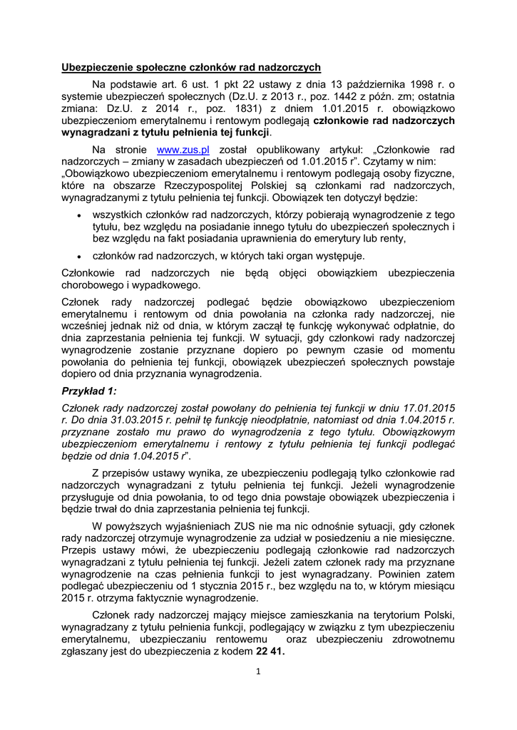 Ubezpieczenie społeczne członków rad nadzorczych Na podstawie art. 6 ust. 1 pkt 22 ustawy z dnia 13 października 1998 r. o systemie ubezpieczeń społecznych (Dz.U. z 2013 r., poz. 1442 z późn. zm; ostatnia zmiana: Dz.U. z 2014 r., poz. 1831) z dniem 1.01.2015 r. obowiązkowo ubezpieczeniom emerytalnemu i rentowym podlegają członkowie rad nadzorczych wynagradzani z tytułu pełnienia tej funkcji. Na stronie www.zus.pl został opublikowany artykuł: „Członkowie rad nadzorczych – zmiany w zasadach ubezpieczeń od 1.01.2015 r”. Czytamy w nim: „Obowiązkowo ubezpieczeniom emerytalnemu i rentowym podlegają osoby fizyczne, które na obszarze Rzeczypospolitej Polskiej są członkami rad nadzorczych, wynagradzanymi z tytułu pełnienia tej funkcji. Obowiązek ten dotyczył będzie: wszystkich członków rad nadzorczych, którzy pobierają wynagrodzenie z tego tytułu, bez względu na posiadanie innego tytułu do ubezpieczeń społecznych i bez względu na fakt posiadania uprawnienia do emerytury lub renty, członków rad nadzorczych, w których taki organ występuje. Członkowie rad nadzorczych chorobowego i wypadkowego. nie będą objęci obowiązkiem ubezpieczenia Członek rady nadzorczej podlegać będzie obowiązkowo ubezpieczeniom emerytalnemu i rentowym od dnia powołania na członka rady nadzorczej, nie wcześniej jednak niż od dnia, w którym zaczął tę funkcję wykonywać odpłatnie, do dnia zaprzestania pełnienia tej funkcji. W sytuacji, gdy członkowi rady nadzorczej wynagrodzenie zostanie przyznane dopiero po pewnym czasie od momentu powołania do pełnienia tej funkcji, obowiązek ubezpieczeń społecznych powstaje dopiero od dnia przyznania wynagrodzenia. Przykład 1: Członek rady nadzorczej został powołany do pełnienia tej funkcji w dniu 17.01.2015 r. Do dnia 31.03.2015 r. pełnił tę funkcję nieodpłatnie, natomiast od dnia 1.04.2015 r. przyznane zostało mu prawo do wynagrodzenia z tego tytułu. Obowiązkowym ubezpieczeniom emerytalnemu i rentowy z tytułu pełnienia tej funkcji podlegać będzie od dnia 1.04.2015 r”. Z przepisów ustawy wynika, ze ubezpieczeniu podlegają tylko członkowie rad nadzorczych wynagradzani z tytułu pełnienia tej funkcji. Jeżeli wynagrodzenie przysługuje od dnia powołania, to od tego dnia powstaje obowiązek ubezpieczenia i będzie trwał do dnia zaprzestania pełnienia tej funkcji. W powyższych wyjaśnieniach ZUS nie ma nic odnośnie sytuacji, gdy członek rady nadzorczej otrzymuje wynagrodzenie za udział w posiedzeniu a nie miesięczne. Przepis ustawy mówi, że ubezpieczeniu podlegają członkowie rad nadzorczych wynagradzani z tytułu pełnienia tej funkcji. Jeżeli zatem członek rady ma przyznane wynagrodzenie na czas pełnienia funkcji to jest wynagradzany. Powinien zatem podlegać ubezpieczeniu od 1 stycznia 2015 r., bez względu na to, w którym miesiącu 2015 r. otrzyma faktycznie wynagrodzenie. Członek rady nadzorczej mający miejsce zamieszkania na terytorium Polski, wynagradzany z tytułu pełnienia funkcji, podlegający w związku z tym ubezpieczeniu emerytalnemu, ubezpieczaniu rentowemu oraz ubezpieczeniu zdrowotnemu zgłaszany jest do ubezpieczenia z kodem 22 41. 1 Członkowie rad nadzorczych, którzy do 31.12.2014 r. zgłoszeni byli wyłącznie do ubezpieczenia zdrowotnego z kodem tytułu ubezpieczenia 2240 XX, a od 01.01.2015 r. powstaje dla nich obowiązek ubezpieczeń emerytalnego i rentowych, powinni zostać wyrejestrowani z ubezpieczenia zdrowotnego (z dotychczasowym kodem tytułu ubezpieczenia) i zgłoszeni do właściwych ubezpieczeń z odpowiednim nowym kodem tytułu ubezpieczenia. Członkowie rad nadzorczych podlegają ubezpieczeniom emerytalnemu i rentowym także, gdy mają inny tytuł do tych ubezpieczeń (np. z umowy o pracę, zlecenia, działalności gospodarczej czy są ubezpieczeni w KRUS) oraz ustalone prawo do emerytury i renty. Członkowie zarządu pełniący funkcję wyłącznie na podstawie powołania (tzw. dochodzący czy społeczni) w dalszym ciągu nie podlegają ubezpieczeniom społecznym i zdrowotnym. (B.T.) Rada nadzorcza – obliczanie składek i podatku Podstawę wymiaru składek na ubezpieczenie emerytalne i rentowe członków rad nadzorczych stanowi przychód (art. 18 ust. 4 pkt 10 ustawy o systemie ubezpieczeń społecznych). Przychodem podlegającym oskładkowaniu jest przychód w rozumieniu przepisów o podatku dochodowym od osób fizycznych uzyskiwany z działalności wykonywanej osobiście przez osoby należące do składu rad nadzorczych, niezależnie od sposobu ich powoływania (art. 4 pkt 9). Art. 11 ust. 1 ustawy o podatku dochodowym od osób fizycznych mówi, że przychodami są otrzymane lub postawione do dyspozycji podatnika w roku kalendarzowym pieniądze i wartości pieniężne oraz wartość otrzymanych świadczeń w naturze i innych nieodpłatnych świadczeń. Od niektórych przychodów nie nalicza się składki na ubezpieczenie. Na podstawie § 5 ust. 2 rozporządzenia Ministra Płacy i Polityki Społecznej z dnia 18 grudnia 1998 r. w sprawie szczegółowych zasad ustalania podstawy wymiaru składek na ubezpieczenia emerytalne i rentowe (Dz. U. Nr 161, poz. 1106, z późn. zm; ostatnia zmiana: Dz.U. z 2014 r., poz. 1967) przepisy § 2–4 stosuje się odpowiednio przy ustalaniu podstawy wymiaru składek członków rad nadzorczych wynagradzanych z tytułu pełnienia tej funkcji. Oznacza to, że w stosunku do członków rad nadzorczych będą miały zastosowanie m.in. wyłączenia z podstawy wymiaru składki wymienione w § 2 rozporządzenia (takie same jak w przypadku pracowników czy zleceniobiorców). Najczęściej będą to wynikające z § 2 pkt 15 rozporządzenia diety i inne należności z tytułu podróży służbowej na obszarze kraju oraz poza granicami kraju. Składki na ubezpieczenia emerytalne i rentowe finansowane są w następujący sposób: Finansujący Ubezpieczenie Spółdzielnia Członek rady nadzorczej Emerytalne 9,76 % 9,76% Rentow