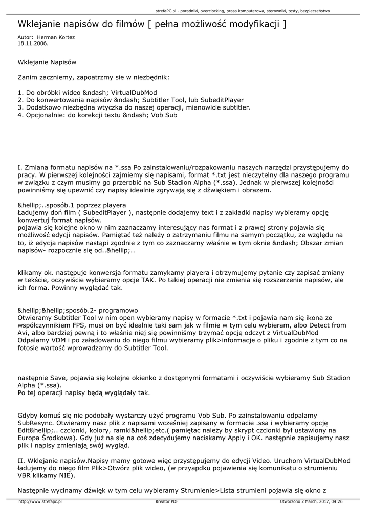 strefaPC.pl - poradniki, overclocking, prasa komputerowa, sterowniki, testy, bezpieczeństwo Wklejanie napisów do filmów [ pełna możliwość modyfikacji ] Autor: Herman Kortez 18.11.2006. Wklejanie Napisów Zanim zaczniemy, zapoatrzmy sie w niezbędnik: 1. 2. 3. 4. Do obróbki wideo – VirtualDubMod Do konwertowania napisów – Subtitler Tool, lub SubeditPlayer Dodatkowo niezbędna wtyczka do naszej operacji, mianowicie subtitler. Opcjonalnie: do korekcji textu – Vob Sub I. Zmiana formatu napisów na *.ssa Po zainstalowaniu/rozpakowaniu naszych narzędzi przystępujemy do pracy. W pierwszej kolejności zajmiemy się napisami, format *.txt jest nieczytelny dla naszego programu w związku z czym musimy go przerobić na Sub Stadion Alpha (*.ssa). Jednak w pierwszej kolejności powinniśmy się upewnić czy napisy idealnie zgrywają się z dźwiękiem i obrazem. …..sposób.1 poprzez playera Ładujemy doń film ( SubeditPlayer ), następnie dodajemy text i z zakładki napisy wybieramy opcję konwertuj format napisów. pojawia się kolejne okno w nim zaznaczamy interesujący nas format i z prawej strony pojawia się możliwość edycji napisów. Pamiętać też należy o zatrzymaniu filmu na samym początku, ze względu na to, iż edycja napisów nastąpi zgodnie z tym co zaznaczamy właśnie w tym oknie – Obszar zmian napisów- rozpocznie się od..….. klikamy ok. następuje konwersja formatu zamykamy playera i otrzymujemy pytanie czy zapisać zmiany w tekście, oczywiście wybieramy opcje TAK. Po takiej operacji nie zmienia się rozszerzenie napisów, ale ich forma. Powinny wyglądać tak. ……sposób.2- programowo Otwieramy Subtitler Tool w nim open wybieramy napisy w formacie *.txt i pojawia nam się ikona ze współczynnikiem FPS, musi on być idealnie taki sam jak w filmie w tym celu wybieram, albo Detect from Avi, albo bardziej pewną i to właśnie niej się powinniśmy trzymać opcję odczyt z VirtualDubMod Odpalamy VDM i po załadowaniu do niego filmu wybieramy plik>informacje o pliku i zgodnie z tym co na fotosie wartość wprowadzamy do Subtitler Tool. następnie Save, pojawia się kolejne okienko z dostępnymi formatami i oczywiście wybieramy Sub Stadion Alpha (*.ssa). Po tej operacji napisy będą wyglądały tak. Gdyby komuś się nie podobały wystarczy użyć programu Vob Sub. Po zainstalowaniu odpalamy SubResync. Otwieramy nasz plik z napisami wcześniej zapisany w formacie .ssa i wybieramy opcję Edit….. czcionki, kolory, ramki…etc.( pamiętac należy by skrypt czcionki był ustawiony na Europa Środkowa). Gdy już na się na coś zdecydujemy naciskamy Apply i OK. następnie zapisujemy nasz plik i napisy zmieniają swój wygląd. II. Wklejanie napisów.Napisy mamy gotowe więc przystępujemy do edycji Video. Uruchom VirtualDubMod ładujemy do niego film Plik>Otwórz plik wideo, (w przyapdku pojawienia się komunikatu o strumieniu VBR klikamy NIE). Następnie wycinamy dźwięk w tym celu wybieramy Strumienie>Lista strumieni pojawia się okno z http://www.strefapc.pl Kreator PDF Utworzono 2 March, 2017, 04:26 strefaPC.pl - poradniki, overclocking, prasa komputerowa, sterowniki, testy, bezpieczeństwo dostępną ścieżką dźwiękową teraz kolejno Zapisz, chwilkę to potrwa, następnie wyłącz ( w celu odcięcia dźwięku od filmu) i na końcu OK. Po co wycinać dźwięk? Jest to bezpieczniejsza opcja łączenie kolejnych partów filmu dzięki temu gdyby dźwięk się nam „rozjechał” można go dopasować. Zapisujemy film bez dźwięku - zakładka wideo, zaznaczmy w niej kopiowanie bezpośrednie następnie plik>>zapisz jako i wybieramy miejsce docelowe. Teraz mamy podzielony film i przygotowane napisy, nie pozostaje nic innego jak je wkleić w tym celu wczytujemy film bez dźwięku do VDM następnie w zakładce wideo zaznaczamy pełny procesdzięki czemu uaktywnia nam się opcja filtry, naciskamy Carl+F i w oknie filtrów wybieramy dodaj teraz bby wczytać napisy potrzebny nam jest subtitler którego na samym początku pobraliśmy. Naciskamy wczytaj i szukamy na dysku filtra/pliku Subtitler.vdf(w katalogu gdzie rozpakowaliśmy subtitlera). Dodaj go do listy następnie zaznacz goi nacisnąć ok. Pojawia się okno filtra w nim wybieramy nasze wcześniej przerobione napisy. Uwaga! Ze względu na to, że subeditplayer nie zmienia rozszerzenia należy podczas szukania wybrać opcję All files w przeciwnym wypadku program nie wykryje napisów. Po dodaniu napisów naciskamy Show Preview Suwakiem zmieniamy postęp filmu aż do pojawienia się napisów. Jeśli wszystko dobrze wygląda naciskamy OK. i jeszcze raz OK. Pora wybrać sposób kodowania w tym celu wideo>kompresja i z listy odpowiedni kodek. Następnie w tej samej zakładce (wideo) upewniamy się czy mamy zaznaczony Pełny proces i jeśli tak to rozpoczynamy mozolny proces wklejania napisów. Plik> zapisz jako ….i wiadomo. III. DźwiękPo wklejeniu napisów przychodzi czas na dźwięk, oczywiście można pominąć jego wycinanie ale nigdy nie wiadomo jaki będzie efekt końcowy a tak będziemy mieli pewność. Wczytujemy nasz film bez dźwiękuz napisami do VDM następnie z zakładki Strumienie>lista strumieni wybieramy dodaj zaznaczamy nasz plik .wav i klikamy ok. w podglądzie (głównym panelu sprawdzamy czy dźwięk pasuje do obrazu wystarczy nacisnąć w dolnym panelu uruchom podgląd pliku wyjściowego. Jak wszystko gra w zakładce wideo zaznaczamy kopiowanie bezpośrednie i z menu plik wybieramy zapisz jako po czym dokonujemy finalizacji naszego zadania. Jeśli coś jest nie tak - wracamy do listy strumieni „prawoklik” na pliku dostępnego dźwięku i wybieramy przeplot. W miejscu opóźnienie dźwięku podajemy wartości w ms (1 sekunda=1000 milisekund). Wpisując wartość ujemną dźwięk wyprzedzi obraz i odwrotnie wpisując wartość dodatnia dźwięk będzie za obrazem, teraz tylko pozostaje wprawne ucho no i odrobina straconego czasu. Jak wszystko gra w zakładce wideo zaznaczamy k