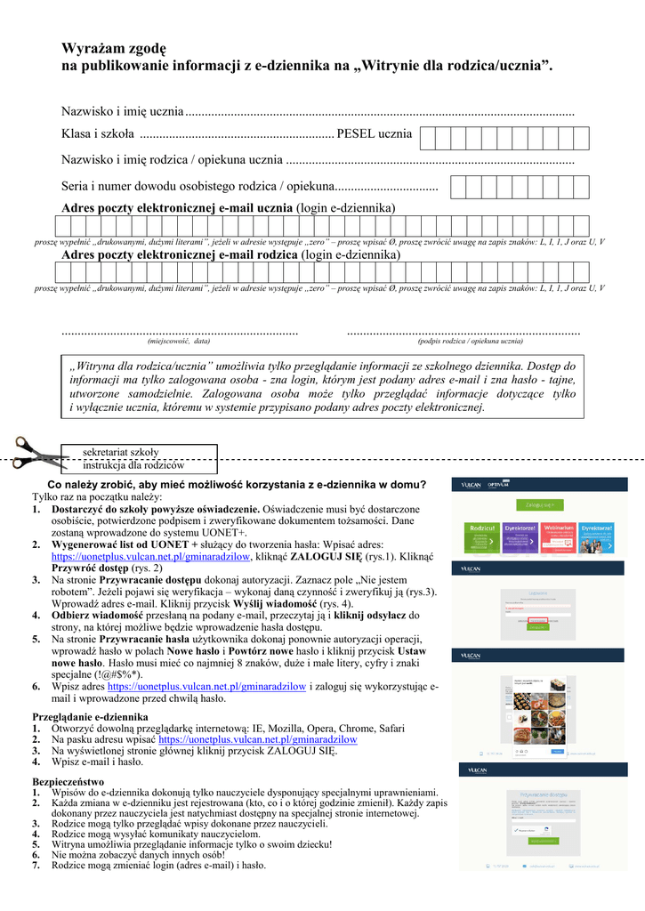 Wyrażam zgodę na publikowanie informacji z e-dziennika na „Witrynie dla rodzica/ucznia”. Nazwisko i imię ucznia ........................................................................................................................ Klasa i szkoła ............................................................ PESEL ucznia Nazwisko i imię rodzica / opiekuna ucznia ......................................................................................... Seria i numer dowodu osobistego rodzica / opiekuna................................ Adres poczty elektronicznej e-mail ucznia (login e-dziennika) proszę wypełnić „drukowanymi, dużymi literami”, jeżeli w adresie występuje „zero” – proszę wpisać Ø, proszę zwrócić uwagę na zapis znaków: L, I, 1, J oraz U, V Adres poczty elektronicznej e-mail rodzica (login e-dziennika) proszę wypełnić „drukowanymi, dużymi literami”, jeżeli w adresie występuje „zero” – proszę wpisać Ø, proszę zwrócić uwagę na zapis znaków: L, I, 1, J oraz U, V ......................................................................... (miejscowość, data) ........................................................................ (podpis rodzica / opiekuna ucznia) „Witryna dla rodzica/ucznia” umożliwia tylko przeglądanie informacji ze szkolnego dziennika. Dostęp do informacji ma tylko zalogowana osoba - zna login, którym jest podany adres e-mail i zna hasło - tajne, utworzone samodzielnie. Zalogowana osoba może tylko przeglądać informacje dotyczące tylko i wyłącznie ucznia, któremu w systemie przypisano podany adres poczty elektronicznej. sekretariat szkoły instrukcja dla rodziców Co należy zrobić, aby mieć możliwość korzystania z e-dziennika w domu? Tylko raz na początku należy: 1. Dostarczyć do szkoły powyższe oświadczenie. Oświadczenie musi być dostarczone osobiście, potwierdzone podpisem i zweryfikowane dokumentem tożsamości. Dane zostaną wprowadzone do systemu UONET+. 2. Wygenerować list od UONET + służący do tworzenia hasła: Wpisać adres: https://uonetplus.vulcan.net.pl/gminaradzilow, kliknąć ZALOGUJ SIĘ (rys.1). Kliknąć Przywróć dostęp (rys. 2) 3. Na stronie Przywracanie dostępu dokonaj autoryzacji. Zaznacz pole „Nie jestem robotem”. Jeżeli pojawi się weryfikacja – wykonaj daną czynność i zweryfikuj ją (rys.3). Wprowadź adres e-mail. Kliknij przycisk Wyślij wiadomość (rys. 4). 4. Odbierz wiadomość przesłaną na podany e-mail, przeczytaj ją i kliknij odsyłacz do strony, na której możliwe będzie wprowadzenie hasła dostępu. 5. Na stronie Przywracanie hasła użytkownika dokonaj ponownie autoryzacji operacji, wprowadź hasło w polach Nowe hasło i Powtórz nowe hasło i kliknij przycisk Ustaw nowe hasło. Hasło musi mieć co najmniej 8 znaków, duże i małe litery, cyfry i znaki specjalne (!@#$%*). 6. Wpisz adres https://uonetplus.vulcan.net.pl/gminaradzilow i zaloguj się wykorzystując email i wprowadzone przed chwilą hasło. Przeglądanie e-dziennika 1. Otworzyć dowolną przeglądarkę internetową: IE, Mozilla, Opera, Chrome, Safari 2. Na pasku adresu wpisać https://uonetplus.vulcan.net.pl/gminaradzilow 3. Na wyświetlonej stronie głównej kliknij przycisk ZALOGUJ SIĘ. 4. Wpisz e-mail i hasło. Bezpieczeństwo 1. Wpisów do e-dziennika dokonują tylko nauczyciele dysponujący specjalnymi uprawnieniami. 2. Każda zmiana w e-dzienniku jest rejestrowana (kto, co i o której godzinie zmienił). Każdy zapis dokonany przez nauczyciela jest natychmiast dostępny na specjalnej stronie internetowej. 3. Rodzice mogą tylko przeglądać wpisy dokonane przez nauczycieli. 4. Rodzice mogą wysyłać komunikaty nauczycielom. 5. Witryna umożliwia przeglądanie informacje tylko o swoim dziecku! 6. Nie można zobaczyć danych innych osób! 7. Rodzice mogą zmieniać login (adres e-mail) i hasło.