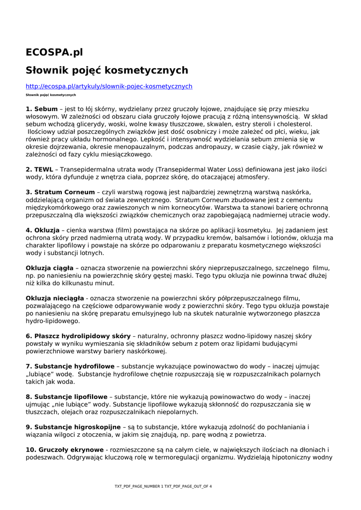 ECOSPA.pl Słownik pojęć kosmetycznych http://ecospa.pl/artykuly/slownik-pojec-kosmetycznych Słownik pojęć kosmetycznych 1. Sebum – jest to łój skórny, wydzielany przez gruczoły łojowe, znajdujące się przy mieszku włosowym. W zależności od obszaru ciała gruczoły łojowe pracują z różną intensywnością. W skład sebum wchodzą glicerydy, woski, wolne kwasy tłuszczowe, skwalen, estry steroli i cholesterol. Ilościowy udział poszczególnych związków jest dość osobniczy i może zależeć od płci, wieku, jak również pracy układu hormonalnego. Lepkość i intensywność wydzielania sebum zmienia się w okresie dojrzewania, okresie menopauzalnym, podczas andropauzy, w czasie ciąży, jak również w zależności od fazy cyklu miesiączkowego. 2. TEWL – Transepidermalna utrata wody (Transepidermal Water Loss) definiowana jest jako ilości wody, która dyfunduje z wnętrza ciała, poprzez skórę, do otaczającej atmosfery. 3. Stratum Corneum – czyli warstwą rogową jest najbardziej zewnętrzną warstwą naskórka, oddzielającą organizm od świata zewnętrznego. Stratum Corneum zbudowane jest z cementu międzykomórkowego oraz zawieszonych w nim korneocytów. Warstwa ta stanowi barierę ochronną przepuszczalną dla większości związków chemicznych oraz zapobiegającą nadmiernej utracie wody. 4. Okluzja – cienka warstwa (film) powstająca na skórze po aplikacji kosmetyku. Jej zadaniem jest ochrona skóry przed nadmierną utratą wody. W przypadku kremów, balsamów i lotionów, okluzja ma charakter lipofilowy i powstaje na skórze po odparowaniu z preparatu kosmetycznego większości wody i substancji lotnych. Okluzja ciągła – oznacza stworzenie na powierzchni skóry nieprzepuszczalnego, szczelnego filmu, np. po naniesieniu na powierzchnię skóry gęstej maski. Tego typu okluzja nie powinna trwać dłużej niż kilka do kilkunastu minut. Okluzja nieciągła - oznacza stworzenie na powierzchni skóry półprzepuszczalnego filmu, pozwalającego na częściowe odparowywanie wody z powierzchni skóry. Tego typu okluzja powstaje po naniesieniu na skórę preparatu emulsyjnego lub na skutek naturalnie wytworzonego płaszcza hydro-lipidowego. 6. Płaszcz hydrolipidowy skóry – naturalny, ochronny płaszcz wodno-lipidowy naszej skóry powstały w wyniku wymieszania się składników sebum z potem oraz lipidami budującymi powierzchniowe warstwy bariery naskórkowej. 7. Substancje hydrofilowe – substancje wykazujące powinowactwo do wody – inaczej ujmując „lubiące” wodę. Substancje hydrofilowe chętnie rozpuszczają się w rozpuszczalnikach polarnych takich jak woda. 8. Substancje lipofilowe – substancje, które nie wykazują powinowactwo do wody – inaczej ujmując „nie lubiące” wody. Substancje lipofilowe wykazują skłonność do rozpuszczania się w tłuszczach, olejach oraz rozpuszczalnikach niepolarnych. 9. Substancje higroskopijne – są to substancje, które wykazują zdolność do pochłaniania i wiązania wilgoci z otoczenia, w jakim się znajdują, np. parę wodną z powietrza. 10. Gruczoły ekrynowe - rozmieszczone są na całym ciele, w największych ilościach na dłoniach i podeszwach. Odgrywając kluczową rolę w termoregulacji organizmu. Wydzielają hipotoniczny wodny TXT_PDF_PAGE_NUMBER 1 TXT_PDF_PAGE_OUT_OF 4 roztwór soli mineralnych (związki sodu, potasu, wapnia, magnezu i in.) oraz mocznik, kwas mlekowy, węglowodany a nawet lipidy. Ten rodzaj potu wydziela się stale, współtworząc płaszcz wodno-lipidowy skóry. Czynnikami sterującymi wydzielanie potu są czynniki hormonalne, klimatyczne, pokarmowe oraz emocjonalne. 11. Gruczoły apokrynowe - występują w okolicy pach, pachwin, narządów płciowych, brodawek sutkowych. Oprócz wody wydzielają tłuszcze, sterole, cukry, białka i inne związki, które rozkładane są przez bakterie znajdujące się na powierzchni skóry, powodując tym samym powstawanie nieprzyjemnego zapachu. Praca gruczołów apokrynowych sterowana jest hormonalnie i emocjonalnie. Ich funkcja nie jest do końca poznana. 12. Liczba HLB - równowaga hydrofilowo-lipofilowa (hydrophilic lipophilic balance) – jest liczbą określającą stopień polarności środków powierzchniowo czynnych (surfaktantów), w tym również emulgatorów. Niskie HLB oznacza, że SPC chętniej rozpuszcza się w rozpuszczalnikach niepolarnych (np. oleju roślinnym), natomiast wysokie HLB oznacza, że SPC chętniej rozpuszcza się w rozpuszczalnikach polarnych (np. wodzie). W związku z powyższym emulgatory o niskim HLB będą promowały powstawanie emulsji typu woda w oleju – w/o (gdzie krople oleju są rozproszone w ciągłej fazie wodnej), natomiast emulgatory o wysokim HLB będą promowały powstawanie emulsji typu olej w wodzie – o/w (gdzie krople wody są rozproszone w ciągłej fazie olejowej). 13. pH - skala kwasowo - zasadowa wodnych roztworów związków chemicznych. Określana jest na podstawie aktywności jonów hydroniowych [H3O+] w roztworach wodnych. Odczyn skóry (pH powierzchni skóry) jest lekko kwaśny i mieści się w granicach pomiędzy 4,2-6. 14. keratyna – są to nierozpuszczalne w wodzie białka fibrylarne, wytwarzane przez keratynocyty. Aktualnie scharakteryzowano ponad 30 różnych keratyn, 20 dla skóry i 10 dla włosów. Podstawowymi aminokwasami wchodzącymi w skład keratyny są cysteina, kwas glutaminowy, seryna, kwas asparaginowy, glicyna, walina, leucyna, prolina, treonina oraz arginina. 15. testy obciążeniowe (mikrobiologiczne) - badanie obciążeniowe zwane inaczej Testem Konserwacji (Challenge Test) polega na wprowadzeniu w warunkach laboratoryjnych do próbki produktu drobnoustrojów z grupy bakterii, drożdży lub pleśni. Następnie zaszczepiony produkt pozostawia się w odpowiednich warunkach na określony czas. Po jego upływie dokonuje się posiewów zakażonego produktu w celu określenia stopnia redukcji drobnoustrojów pod wpływem działania środków k