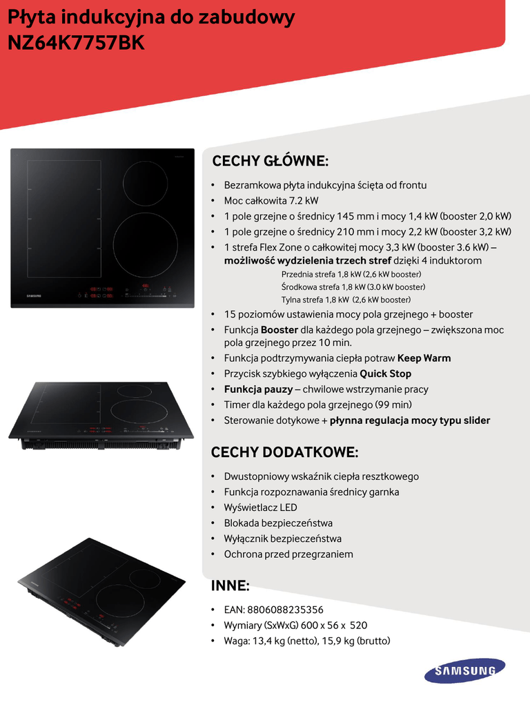Płyta indukcyjna do zabudowy NZ64K7757BK CECHY GŁÓWNE: • • • • • Bezramkowa płyta indukcyjna ścięta od frontu Moc całkowita 7.2 kW 1 pole grzejne o średnicy 145 mm i mocy 1,4 kW (booster 2,0 kW) 1 pole grzejne o średnicy 210 mm i mocy 2,2 kW (booster 3,2 kW) 1 strefa Flex Zone o całkowitej mocy 3,3 kW (booster 3.6 kW) – możliwość wydzielenia trzech stref dzięki 4 induktorom Przednia strefa 1,8 kW (2,6 kW booster) Środkowa strefa 1,8 kW (3.0 kW booster) Tylna strefa 1,8 kW (2,6 kW booster) • 15 poziomów ustawienia mocy pola grzejnego + booster • Funkcja Booster dla każdego pola grzejnego – zwiększona moc pola grzejnego przez 10 min. • Funkcja podtrzymywania ciepła potraw Keep Warm • Przycisk szybkiego wyłączenia Quick Stop • Funkcja pauzy – chwilowe wstrzymanie pracy • Timer dla każdego pola grzejnego (99 min) • Sterowanie dotykowe + płynna regulacja mocy typu slider CECHY DODATKOWE: • • • • • • Dwustopniowy wskaźnik ciepła resztkowego Funkcja rozpoznawania średnicy garnka Wyświetlacz LED Blokada bezpieczeństwa Wyłącznik bezpieczeństwa Ochrona przed przegrzaniem INNE: • EAN: 8806088235356 • Wymiary (SxWxG) 600 x 56 x 520 • Waga: 13,4 kg (netto), 15,9 kg (brutto) Płyta indukcyjna do zabudowy NZ64K7757BK DLACZEGO SAMSUNG JEST LEPSZY? Nowoczesna płyta indukcyjna Samsung zapewnia wyjątkową wygodę użytkowania: Strefa Flex Zone • oszczędność czasu – dzięki funkcji Booster, pozwalającej na natychmiastowe zwiększenie mocy pola grzejnego, czas przygotowania posiłków staje się krótszy • elastyczność użytkowania – dzięki łączonej strefie Flex Zone możesz gotować potrawy nawet w bardzo dużych naczyniach. Kiedy jednak nie potrzebujesz takiej funkcji korzystaj z obydwu części osobno. • wygoda i bezpieczeństwo obsługi - funkcja pauzy pozwala czasowo wstrzymać pracę pola – aby np. odebrać telefon – a następnie za pomocą jednego przycisku - łatwo i szybko przywrócić wcześniejsze ustawienia. • wygodne sterowanie - sterowanie dotykowe jest niezwykle proste - wystarczy delikatnie dotknąć ikonę na panelu. Dzięki diodom oraz czytelnemu wyświetlaczowi zawsze wiesz, które pole z jaką siłą grzeje a dzięki zastosowaniu slidera ( suwaka) możesz od razu ustawić siłę grzania wybranego pola (bez konieczności wielokrotnego naciskania przycisków +/-) • łatwość czyszczenia – dzięki gładkiej, ergonomicznej powierzchni czyszczenie płyty jest łatwe i szybkie Łatwe czyszczenie Bezpieczeństwo obsługi Przycisk Keep Warm OFF - Quick Stop Panel sterowania ze sterowaniem typu slider