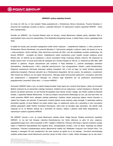 WPROST: polscy szpiedzy Kremla Za mniej niż 100 tys. zł miał zdradzić Polskę podpułkownik z Ministerstwa Obrony Narodowej. Prawnik Stanisław S. pracował dla rosyjskiego wywiadu za darmo, z pobudek ideowych. W najnowszym wydaniu tygodnika WPROST - kulisy afery szpiegowskiej. Ponadto we WPROST: Jan Krzysztof Bielecki idzie do biznesu, Leszek Balcerowicz zakłada partię, Sebastian Mila w amerykańskim stylu wraca do reprezentacji, Chris Niedenthal fotografuje muzea, a młodzi Polacy znowu wyjeżdżają znad Wisły. W piątek do aresztu pod zarzutami szpiegostwa trafiło dwóch mężczyzn – podpułkownik Zbigniew J., który pracował w Ministerstwie Obrony Narodowej, oraz prawnik Stanisław S. Zatrzymania nastąpiły w jednym czasie, ale sprawy te nie są z sobą powiązane. Oprócz jednego. Obaj zatrzymani pracowali dla GRU, czyli dla rosyjskiego wywiadu wojskowego. Na łamach WPROST - szczegóły tej historii. Podpułkownik został zwerbowany przez rosyjski wywiad wojskowy przed kilkoma laty. Co skłoniło go do współpracy z obcym wywiadem? Długi, frustracja, kłopoty rodzinne. Nie inkasował od Rosjan dużych kwot. W sumie przez kilka lat wzbogacił się o kwotę mniejszą niż 100 tys. zł. Dostawał po 500, 800, 1000 dolarów w gotówce. Drugim zatrzymanym jest urodzony w Rosji Stanisław S., prawnik posiadający podwójne obywatelstwo. Współpracował z GRU z pobudek patriotycznych i bez wynagrodzenia. Działał z pełną świadomością. Rosjanom przekazywał informacje dotyczące polskiej energetyki. Był o krok od tego, by zostać doradcą sejmowej podkomisji energetyki. Planował zatrudnić się w Ministerstwie Gospodarki. Był też uważny. Na spotkania z rezydentami GRU chodził bez telefonu, by nie zostać namierzonym. Dlaczego polski kontrwywiad postanowił z przytupem zatrzymać obu podejrzanych o szpiegostwo? Dlaczego nie zrobiono tego dyskretnie lub nie próbowano przewerbować podpułkownika i prawnika? Kulisy afery – w nowym WPROST. Na łamach WPROST także o tym, że ostatni kolega Donalda Tuska żegna się z premier Ewą Kopacz. Latem Jan Krzysztof Bielecki szykował się na stanowisko unijnego komisarza. Podobno był już spakowany i szukał mieszkania w Brukseli. Na planach się jednak skończyło, bo szef Komisji Europejskiej Jean-Claude Juncker nalegał, aby Polska wysłała do Brukseli kobietę. I pojechała Elżbieta Bieńkowska. To było już kolejne rozczarowanie Bieleckiego po tym, jak dwa lata temu nie został prezesem EBOiR mimo zabiegów polskiej dyplomacji. Podobno dostał propozycję objęcia resortu finansów w rządzie Ewy Kopacz, ale odmówił. W pierwszych chwilach jednak nowej szefowej rządu pomagał. Z rządowego zaplecza dochodziły sygnały, że teraz Bielecki ma zostać szefem tego, co ostatecznie wyłoni się z powołanej w celu rozruszania polskiej gospodarki spółki Polskie Inwestycje Rozwojowe, która była od początku jego pomysłem. Ale jednak wiele wskazuje na to, że Bielecki szykuje się z powrotem do biznesu. Więcej o planach szefa Rady Gospodarczej – w najnowszym wydaniu tygodnika WPROST. We WPROST również o tym, że Leszek Balcerowicz zakłada partię. Podjął decyzję. Według rozmówców tygodnika WPROST, to ma być taki Kongres Liberalno--Demokratyczny bis. Partia obliczona na góra 10 proc. poparcia, zagospodarowująca tych, którzy pozostali w OFE i zwątpili w Platformę. Pierwsze informacje o planach profesora zaczęły krążyć w Platformie Obywatelskiej dwa tygodnie temu. Zaniepokojenie wzrasta z dnia na dzień. Pojawiają się kolejne doniesienia. Twarzami przedsięwzięcia oprócz Balcerowicza mieliby być Władysław Frasyniuk oraz Ryszard Petru. Czy niepokój w szeregach PO jest uzasadniony? Na razie wszyscy są zgodni są co do jednego. Tworzenie ewentualnego projektu politycznego Leszek Balcerowicz powinien zacząć od kilku zmian w sobie. Polityk obrażający się na cały świat i Platforma Mediowa Point Group SA Batory Office Building II, 02-486 Warszawa, Al. Jerozolimskie 212 tel. (+48 22) 347 50 00, fax (+48 22) 347 50 01, www.point-group.pl NIP: 521-00-88-831, REGON: 010768408, KRS: 0000051017, Kapitał zakładowy: 103 897 325 zł wciąż ten świat pouczający, a Balcerowicz właśnie taki dziś jest, nie ma szans. Żeby być realnym zagrożeniem dla PO, Balcerowicz musi się zmienić – wyrokuje jeden z politologów. A poza tym nowe ugrupowanie musiałoby pojawić się natychmiast. Wybory w 2015 r. prawdopodobnie na długo zadecydują o kształcie sceny politycznej. Jeśli Balcerowicz chce coś zrobić, musi się spieszyć. Potem będzie już za późno. Więcej o nowym projekcie politycznym – w nowym WPROST. We WPROST także wielki powrót Sebastiana Mili. Opowieść o nowym bohaterze polskiej reprezentacji to trochę amerykańska historia. Wydaje się, że już znikasz ze sceny, powoli odchodzisz. Pewnie dziennikarze sportowi za chwilę na pożegnanie napiszą ten słynny banał polskiej piłki: „Zdolny chłopak, ale do końca nie wykorzystał szansy”. Ale ty robisz zwrot i się nie żegnasz, wracasz na środek sceny, dajesz przedstawienie roku. Strzelasz mistrzom świata bramkę w meczu sezonu. W następnym spotkaniu ośmieszasz Szkotów i podajesz tak, jak robili to Andrea Pirlo czy kiedyś Kazimierz Deyna. A przecież już w listopadzie 2003 r. Mila zrobił rzecz, którą przyćmiła dopiero bramka strzelona Niemcom. Do gry w kadrze wcześniej Mila nie miał szczęścia. Grywał w niej, ale nieregularnie i rzadko. Franciszek Smuda nie widział kapitana mistrzów Polski w ekipie na najważniejszy turniej ostatnich lat, czyli Euro 2012. Na jego boiskowej pozycji u Smudy, a potem u Waldemara Fornalika grał Ludovic Obraniak. Adam Nawałka zwrócił się do Mili w sytuacji podbramkowej. I trafił. Filmowa historia Sebastiana Mili – w nowym WPROST. We WPROST także Chris Niedenthal, światowej sławy fotograf, który od ponad 40 lat mieszka w Polsce. Jego fotografie to jeden z n