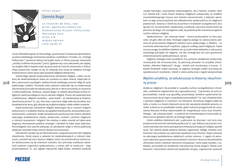 Gilles Kepel Zemsta Boga La revanche de Dieu, 1991 przeł. Agnieszka Adamczak Wydawnictwo Krytyki Politycznej Warszawa 2010 stron 318 miękka oprawa cena 34,90 zł 308 Cezary Michalski napisał, że Zemsta Boga „powinna być wciskana do ręki każdemu uczniowi katolickiego seminarium, każdemu czytelnikowi «Frondy» czy «Teologii Politycznej»”, ponieważ lektura tej książki może w Polsce posunąć oświecenie „choćby o milimetr do przodu” (2010). Zgadzam się z tym zaleceniem, ale wątpię, czy książka Gilles’a Kepela może się przyczynić do tryumfu oświecenia w Polsce. Wręcz przeciwnie, wydaje mi się, że wskazuje ona raczej na nadejście nowego średniowiecza i może służyć jako poradnik religijnej rekonkwisty. Zemsta Boga opisuje bezprecedensowe odrodzenie religijne, z jakim od połowy lat siedemdziesiątych mamy do czynienia na całym świecie. Kepel jako jeden z pierwszych socjologów zaobserwował zaskakujący powrót religii do życia publicznego i polityki. Wcześniej wielu autorom wydawało się, że modernizacja nieuchronnie prowadzi do sekularyzacji, jeśli nie w sferze prywatnej, to na pewno w sferze publicznej. Tytułowa „zemsta Boga” to właśnie aktywizacja ruchów religijnych i partii powołujących się na wartości religijne. Proces ten podważył tezę o sekularyzacji. „Błędnie uznaliśmy − pisze Kepel − że sekularyzacja to linearny, nieuchronny proces” (s. 55). Dziś teza o powrocie religii stała się trywialna, lecz dwadzieścia lat temu, gdy ukazała się ta głośna książka, robiła wielkie wrażenie. Kepel porównuje odrodzenie religijne dokonujące się w czterech kręgach kulturowych: w arabskim islamie, europejskim katolicyzmie, amerykańskim protestantyzmie i judaizmie. Dzięki perspektywie porównawczej można odnaleźć uderzające podobieństwa między działaczami, ruchami i partiami religijnymi w różnych wyznaniach i religiach. Nie wiedząc o sobie, stawiali oni takie same diagnozy, formułowali podobne strategie i natrafiali na takie same dylematy. Równoległość tych zjawisk pokazuje, że odrodzenie religii w sferze publicznej obejmuje wszystkie kraje, których dotyka nowoczesność. Odrodzenie zaczęło się od sformułowania i spopularyzowania idei religijnej rekonkwisty. Mniej więcej w połowie lat siedemdziesiątych w różnych miejscach „narodził się nowy dyskurs religijny, który nie postulował już konieczności dostosowania się do świeckich wartości, lecz potrzebę wydobycia sakralnych podstaw organizacji społeczeństwa, a nawet, jeśli to konieczne – jego przekształcenie” (s. 34). Egipski męczennik Sajjid Kutba, niemiecki kardynał Joseph Ratzinger, amerykański teleewangelista Jerry Fallwell, izraelski rabin Cwi Jehuda Kuk i wielu innych działaczy religijnych wskazywało, że źródłem wszechobejmującego kryzysu jest świecka nowoczesność, a jedynym sposobem na jego przezwyciężenie jest odbudowanie społeczeństwa na religijnych podstawach. Autorzy ci różnili się oczywiście w kwestiach szczegółowych, lecz łączyło ich rozczarowanie współczesną cywilizacją i poczucie konieczności jej powrotu do Boga. Ich wystąpienia stały się podstawą dla tworzenia programu ruchów odnowy religijnej. Społeczeństwo − jak wskazuje Kepel − można przekształcać na dwa sposoby: od góry albo od dołu. Strategia odgórna polega na wykorzystaniu państwa do przywrócenia religijnych podstaw życia społecznego, a oddolna − na tworzeniu alternatywnych wspólnot, żyjących według zasad religijnych. Kepel zwraca uwagę, że oddolne działania nie są wcale mniej radykalne w odrzucaniu świeckiego porządku niż odgórne. Cel obu strategii jest ten sam: gruntowne zrekonstruowanie społeczeństwa (s. 90-91). Odgórna strategia może przybierać trzy postacie: działalności politycznej, rewolucyjnej lub terrorystycznej. Tę pierwszą prowadzi na przykład amerykańska „Moralna Większość”, drugą − irański ruch rewolucyjny, a trzecią − libański Hezbollah. Kepel wskazuje, że odgórne strategie rzadko prowadzą do spodziewanych rezultatów. Udział w walce politycznej z reguły kompromituje Błędnie uznaliśmy, że sekularyzacja to linearny, nieuchronny proces działaczy religijnych. Na przykład w wypadku ruchów ewangelikalnych chrześcijan „nadmierne angażowanie się w grę polityczną […] sprawiało, że ruchy te powszedniały i traciły swą specyfikę, przechodząc haniebne upokorzenie dostosowywania się do reguł «rozpolitykowanej polityki»” (s. 192). Podobnie było z partiami religijnymi w Czechach i we Włoszech. Rewolucja religijna udała się tylko w Iranie, a w innych miejscach użycie siły najczęściej szkodziło sprawie, co widać zwłaszcza na przykładzie Izraela, gdzie wykrycie przygotowań do wysadzenia Meczetu Al-Aksa doprowadziło do marginalizacji ruchu Gusz Emunim. Dlatego − jak wskazuje Kepel − w połowie lat osiemdziesiątych można było zaobserwować globalny odwrót od strategii odgórnej. Celem oddolnej działalności jest „wpływanie na obyczaje i styl życia oraz przejmowanie kontroli nad tkanką społeczną” (s. 49). Odbywa się to przez tworzenie szerokiej sieci luźno powiązanych instytucji promujących religijny sposób życia. Tak właśnie działa potężna islamska organizacja Tabligh, katolicki ruch Komunia i Wyzwolenie czy żydowska wspólnota Gusz Emunim. Kepel wskazuje na uderzające podobieństwa oddolnych ruchów odnowy. Z reguły ich pierwszym celem jest opanowanie uniwersytetów i slumsów. Bractwo Muzułmańskie oferowało swoim członkom darmowe korepetycje i tanie kopie notatek z wykładów, prowadziło też działalność charytatywną wśród ubogich. Włoski ruch Komunia i Wyzwolenie dostarczał studentom skrypty, organizował wycieczki Kompressje 309 i pomagał bezrobotnym w znalezieniu pracy. W miarę rozwoju, ambicje ruchów stawały się coraz większe. Amerykańscy chrześcijanie zakł