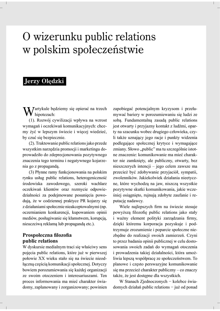 23 O wizerunku public relations w polskim spoïeczeñstwie Jerzy OlÚdzki W artykule bĊdziemy siĊ opieraü na trzech hipotezach: (1). Rozwój cywilizacji wpáywa na wzrost wymagaĔ i oczekiwaĔ komunikacyjnych: chcemy Īyü w lepszym Ğwiecie i wiĊcej wiedzieü, by czuü siĊ bezpiecznie. (2). Traktowanie public relations jako przede wszystkim narzĊdzia promocji i marketingu doprowadziáo do zdeprecjonowania pozytywnego znaczenia tego terminu i negatywnego kojarzenia go z propagandą. (3) Páynne ramy funkcjonowania na polskim rynku usáug public relations, heterogenicznoĞü Ğrodowiska zawodowego, szeroki wachlarz oczekiwaĔ klientów oraz rozmycie odpowiedzialnoĞci za podejmowane posuniĊcia powodują, Īe w codziennej praktyce PR kojarzy siĊ z dziaáaniami spoáecznie nieakceptowalnymi (np. oczernianiem konkurencji, kupowaniem opinii mediów, posáugiwanie siĊ káamstwem, korupcją, nieuczciwą reklamą lub propagandą etc.). Prospoáeczna ÞlozoÞa public relations W dyskursie medialnym traci siĊ wáaĞciwy sens pojĊcia public relations, które juĪ w pierwszej poáowie XX wieku staáo siĊ na Ğwiecie nieodáączną czĊĞcią komunikacji spoáecznej. Dotyczy bowiem porozumiewania siĊ kaĪdej organizacji ze swoim otoczeniem i interesariuszami. Ten proces informowania ma mieü charakter Ğwiadomy, zaplanowany i zorganizowany; powinien zapobiegaü potencjalnym kryzysom i przeáamywaü bariery w porozumiewaniu siĊ ludzi ze sobą. Fundamentalną zasadą public relations jest otwarty i przyjazny kontakt z ludĨmi, oparty na szacunku wobec drugiego czáowieka, czyli takĪe uznający jego racje i punkty widzenia podlegające spoáecznej krytyce i wymagające zmiany. Sáowo „public” ma tu szczególnie istotne znaczenie: komunikowanie ma mieü charakter nie zamkniĊty, ale publiczny, otwarty, bez nieszczerych intencji – jego celem zawsze ma przecieĪ byü zdobywanie przyjacióá, sympatii, zwolenników. Jakiekolwiek dziaáania nieetyczne, które wychodzą na jaw, niszczą wszystkie pozytywne skutki komunikowania, jakie wczeĞniej osiągniĊto, rujnują zdobyte zaufanie i reputacjĊ nadawcy. Wiele najlepszych Þrm na Ğwiecie stosuje powyĪszą ÞlozoÞĊ public relations jako staáy i waĪny element polityki zarządzania Þrmy, dziĊki któremu korporacja pozyskuje i podtrzymuje zrozumienie i poparcie spoáeczne niezbĊdne do realizacji swoich zamierzeĔ. Czyni to przez badania opinii publicznej w celu dostosowania swoich zadaĔ do wymagaĔ otoczenia i prowadzenia takiej dziaáalnoĞci, która umoĪliwia lepszą wspóápracĊ ze spoáeczeĔstwem. To planowe i czĊsto perswazyjne komunikowanie siĊ ma przecieĪ charakter publiczny – co znaczy takĪe, Īe jest dostĊpne dla wszystkich. W Stanach Zjednoczonych í kolebce Ğwiadomych dziaáaĔ public relations í juĪ od ponad 24 stu lat PR pomaga pluralistycznemu spoáeczeĔstwu podejmowaü decyzje i przyczyniaü siĊ do wzajemnego zrozumienia pomiĊdzy grupami a instytucjami. SáuĪy budowaniu zgody miĊdzy spoáeczeĔstwem a polityką we wszystkich sprawach publicznych. SáuĪy zatem wszystkim instytucjom: Þrmom, związkom zawodowym, agendom rządowym, fundacjom, szpitalom, instytucjom oĞwiatowym i religijnym, stowarzyszeniom spoáecznym. Te instytucje mają za zadanie zrozumieü postawy i wartoĞci swoich publicznoĞci (termin równoznaczny z „rynkami docelowymi” lub „grupami docelowymi”), by budowaü z nimi jak najbardziej efektywne relacje (a w konsekwencji – osiągnąü swoje cele). Wiadomo, Īe public relations wĞród specjalistów marketingu jest rozumiane jako perswazyjna komunikacja skierowana do okreĞlonych publicznoĞci. Komunikacja Þrmy z otoczeniem, wedáug tych specjalistów, skáada siĊ z 4 elementów: znaków toĪsamoĞci Þrmy jako symboli organizacyjnych, reklamy instytucjonalnej, programu kontaktów z klientami oraz z publicity, czyli bezpáatnej informacji w mediach na temat Þrmy, jej produktów i usáug. OdpowiedzialnoĞü za publicity ponosi zwykle dziaá public relations. Autorzy piszący o marketingu zwracają wiĊc uwagĊ na bliskie jego związki z PR, ale teĪ podkreĞlają, Īe utoĪsamianie obu dziedzin jest báĊdem z uwagi na odmiennoĞü zadaĔ1. Zadaniem marketingu jest zidentyÞkowanie klientów i okreĞlenie ich potrzeb, opracowanie produktów, które zaspokoją te potrzeby i dostarczenie ich do zainteresowanych odbiorców. Tymczasem nie dla wszystkich jest jasne, Īe PR to nie jest jedynie marketingowe narzĊdzie promocji, lecz wszechstronne dziaáanie na rzecz dostosowania polityki i decyzji zarządu przedsiĊbiorstwa do oczekiwaĔ i zainteresowaĔ 1 Jerzy OlĊdzki opinii publicznej; w razie potrzeby takĪe ksztaátowanie tej opinii, utrzymywanie przyjaznych relacji ze wszystkimi waĪnymi grupami spoáecznymi zainteresowanymi celami i treĞcią naszej polityki informacyjnej. W public relations mamy do czynienia przede wszystkim z troską o reputacjĊ Þrmy i bezpáatne (w odróĪnieniu od reklamy) przekazanie przez nadawcĊ informacji na jej temat do róĪnych grup otoczenia. Początki wspóáczeĞnie rozumianej ÞlozoÞi public relations odnajdujemy na kontynencie amerykaĔskim pod koniec XVIII wieku w atmosferze dyskusji wokóá projektów redagowanej wówczas konstytucji nowego paĔstwa. NaleĪy wspomnieü, Īe byá to okres doĞü duĪej popularnoĞci wyznawców teorii umowy spoáecznej, praw natury i liberalnego paĔstwa konstytucyjnego. Podobno do idei public relations nawiązywaá Thomas Jefferson w kontekĞcie swoich apeli o samorządnoĞü obywatelską i nawoáywania do obowiązku budowy spoáecznego zaufania i odpowiedzialnoĞci tworzących siĊ instytucji demokratycznego paĔstwa. W roku 1832 adwokat Dorman Eaton deÞniowaá public relations jako „nawiązywanie kontaktów miĊdzyludzkich dla powszechnego dobra”. Nie wiązano wówczas tej idei z biznesem czy wykorzystywaniem informacji dla osobistych korzyĞci lub zysku Þrmy. Pierwsza na Ğwiecie zawodowa a