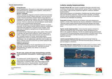 Zasady bezpieczeństwa Lokalne zasady bezpieczeństwa Fotografowanie Zakaz fotografowania i filmowania na całym terenie przemysłowym. Zezwolenie może być udzielone przez dyrektora, szefa ochrony i bezpieczeństwa i informatora. Alkohol i narkotyki Alkohol i narkotyki nie mogą być wnoszone oraz/lub konsumowane na terenie Domsjö Fabryki. Miejsce pracy jest i musi być wolne od używek. Wszyscy pracownicy Domsjö Fabryki muszą calkowicie zrezygnowac z przyjmowania środkow, które są zaklasyfikowane do narkotyków, jesli nie są to leki, podczas pracy jak i w czasie wolnym od pracy. Ten kto w czasie pracy jest pod wpływem używek będzie usunię ty przez zainteresowane kierownictwo. Ten kto jest podejrzany o bycie pod wpływem alkoholu ma prawo udowodnić, że jest trzeżwy poprzez badanie wydechu, podobnie jak osoba która jest podejrzana o używanie innych środków, może zrobić test na narkotyki w upoważnionym do tego laboratorium. Palenie tytoniu Na terenie Domsjö Fabryki jest ogólny zakaz palenia. Palić można na zewnątrz tam gdzie można wykluczyc ryzyko wypadku lub w środku w miejscach do tego przeznaczonych, pod warunkiem że nikt nie bedzie narażony na ryzyko pasywnego palenia. Wspołpracownicy którzy sa narażeni na pasywne palenie powinni zameldowac o tym do najbliższego szefa, ktory musi to zgłosic do raportu. Palenie na terenie oznaczonym EX bedzie zgłoszone jako wyjątkowe wykroczenie. Telefony komorkowe Jeżeli telefon komorkowy nie jest zaklasyfikowany EX nie można go używać na terenie oznaczonym EX. Jeśli ktoś nie wie jak zaklasyfikowany jest telefon musi założyć, że nie jest on klasyfikowany EX. Domsjö Fabryki AB mają wysokie wymagania dotyczące warunków pracy, środowiska zewnętrznego, bezpieczeństwa i jakości. Prawa i przepisy rynku pracy zostały z tego powodu uzupełnione ogólnymi i lokalnymi zasadami bezpieczeństwa. Nasza praca związana ze środowiskiem charakteryzuje się pełnym obrazem, który jest nieustannie ulepszany. Używamy metod, procesów i produktów, które jak najmniej obciążają środowisko i podczas zakłoceń lub wypadków środowisko jest ważniejsze niż produkcja. Pozwolenie na pracę otrzymuje ten kontrahent, ktory jest ubezpieczony zgodnie z umową i który dopilnuje aby wszyscy zatrudnieni w zakladzie znali i stosowali ogólne zasady bezpieczeństwa przemysłu leśnego oraz nasze lokalne zasady bezpieczeństwa i ważne informacje specyficzne dla miejsca pracy. Ogólne zasady bezpieczeństwa można otrzymać poprzez wewnętrzne szkolenie komputerowe SSG, Entre-passet. Należy skontaktować się z SSG w celu uzyskania informacji. Ten kto nie posiada ważnego Entre-passet musi otrzymać informacje dotyczące bezpieczeństwa w Domsjö.Osoba z ktorą kontrahent ma kontakt w Domsjö rezerwuję czas dla przekazania tych ogólnych informacji. Lokalne zasady bezpieczeństwa specyficzne dla Domsjö Fabryki są udokumentowane w tej broszurze. Broszurę otrzymuje się przy umowie lecz jest też dostępna w strożówce. Informacja dotycząca miejsca pracy otrzymywana jest po przybyciu osoby majacej stały kontakt w Domsjö Fabryki lub osoby przez niego wskazanej. W razie urazu, pożaru lub innego nieszczęśliwego wypadku trzeba powiadomić straż pożarna i karetkę pogotowia numer 112. Po zaalarmowaniu karetki pogotowia lub straży pożarnej należy powiadomić osobę mającą dyżur w strożówce 75691 oraz osobę mającą kontakt oraz/lub szefa ochrony i bezpieczeństwa. Domsjö Fabryka zawsze wysyła kopie raportu o mającym miejsce wypadku. Biorafineria w Domsjö Fabriker Ex-zaklasyfikowany teren Robimy więcej z dzrewa® 2011-10 4 1 Przybycie Należy zgłosić się do pełniącego służbę w strożówce. Osoba mająca kontakt z kontrahentem informuje o pracy i pilnuje by wszyscy otrzymali informacje niezbędną do otrzymania pozwolenia na pracę. Kierownictwo kontrahenta dopilnowuje aby praca byla wykonana zgodnie z obowiązującymi prawami, przepisami oraz lokalnymi zasadami. Informacja specyficzna dla miejsca pracy Osoba z Domsjö mająca kontakt z kontrahentem lub inna osoba wskazana przez niego powinna poinformowac o szczególnym ryzyku dotyczącym odcinka i miejsca pracy. Wszyscy powinni znać różnego typu alarmy w miejscu pracy, alarm ewakuacyjny, drogi ewakuacyjne, miejsca zbiórki, obowiązek meldunku, rozmieszczenie prowizorycznych pryszniców, materiałów gaśniczych, sprzętu ochronnego oraz instrukcje dotyczące sortowania śmieci itd. Praca wymagająca wysokich temperatur W związku z pracą wymagającą wysokich temperatur stosujemy się do wymagań zakładu ubezpieczeniowego: Dlatego wymagane jest pozwolenie na wykonywanie tego typu prac.Wszyscy powinni przejść wymagane szkolenie i w razie potrzeby móc pokazac certyfikat. Następnie pisemne pozwolenie może być wystawione przez kierownika prac, który jest odpowiedzialny na danym terenie pracy. Na terenie gdzie występuje ryzyko wybuchu zakazana jest praca wymagająca wyskokich temperatur. Na wyjątek od tego zakazu mogą zezwolic specjalnie uprawnione osoby lub personel z Domsjö/Örnsköldsvik służby ratowniczej. Pozwolenie na tak zwaną pracę pokrycie dachu lub podobną wydawane jest przez kierownika prac budowlanych. Pojemniki na gaz Wyłącznie używane pojemniki na gaz można przechowywać w pomieszczeniach. Pojemniki na gaz powinny zawsze być przechowywane w wózku aby szybko wywieźć je w bezpieczne miejsce. Przy większych pracach cięcia butle gazowe powinny być przechowywane na zewnątrz w skrzyniach a sprzęt do cięcia powinien posiadać długie węże. Ruchome butle gazowe powinny być zawsze zamocowane. Jeśli jest potrzeba na przechowywanie więcej butli gazowych na zewnątrz musi być na to zezwolenie słuzby ratowniczej. Po zakończonej pracy butle gazowe muszą być zawsze odstawione na wskazane miejsce. Warunki pracy i ochrona przeciwpożarowa Cały czas pracujemy nad systematycznym ulepszeniem warunków pracy