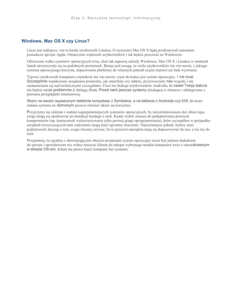 Et ap 2: Nar zędzi a t ec hnol ogi i i nf orm acyj nej Windows, Mac OS X czy Linux? Linux jest najlepszy, wie to każdy użytkownik Linuksa. O wyższości Mac OS X będą przekonywali natomiast posiadacze sprzętu Apple. Ostatecznie większość użytkowników i tak będzie pracować na Windowsie. Odwieczna walka systemów operacyjnych trwa, choć tak naprawę udziały Windowsa, Mac OS X i Linuksa w ostatnich latach utrzymywały się na podobnych poziomach. Biorąc pod uwagę, że wielu użytkowników nie wie nawet, z jakiego systemu operacyjnego korzysta, dopasowanie platformy do własnych potrzeb często stanowi nie lada wyzwanie. Typowy użytkownik komputera częstokroć nie wie nawet, czym do końca jest system operacyjny. I nie musi. Szczególnie współczesne urządzenia przenośne, jak smartfony czy tablety, przyzwyczaiły nas wygody i nie zastanawiania się nad technicznymi szczegółami. Choć nie brakuje użytkowników Androida, to nawet Twoja babcia nie będzie miała problemów z obsługą iPada. Przed nami jeszcze systemy działającą w chmurze i obsługiwane z poziomu przeglądarki internetowej. Skoro na swoim wypasionym telefonie korzystasz z Symbiana, a na tablecie z Androida czy iOS, to może zmiana systemu na domowym pececie również okaże się korzystna. Przyjrzymy się zaletom i wadom najpopularniejszych systemów operacyjnych, by niezorientowanym dać obraz tego, czego mogą się spodziewać po instalacji każdego z nich. Każdy wybór zmusza do podejmowania pewnych kompromisów (np. konieczność wykorzystywania tylko pewnej grupy oprogramowania), które szczególnie w przypadku urządzeń towarzyszących nam codziennie mogą mieć ogromne znaczenie. Najważniejsze jednak, byśmy sami podejmowali decyzję o tym, czego chcemy używać, bo to przecież narzędzia mają się dopasowywać do nas, a nie my do nich. Przypomnij, że zgodnie z obowiązującymi obecnie przepisami system operacyjny może być jedynie dodatkiem do sprzętu i sprzedawcom nie wolno zmuszać klienta do zakupu wybranego modelu komputera wraz z zainstalowanym w sklepie OS-em. Klient ma prawo kupić komputer bez systemu. Et ap 2: Nar zędzi a t ec hnol ogi i i nf orm acyj nej MS Windows Jeśli nie wiesz, jakiego systemu operacyjnego używasz, najprawdopodobniej jest to Windows. To zdecydowanie najpopularniejsza platforma dla komputerów biurkowych, chętnie używana również w firmach. Do największych zalet Windowsów należy obsługa dużej liczby modeli wszelkiego osprzętu, bo niemal wszyscy producenci urządzeń peryferyjnych przygotowują swoje sterowniki w pierwszej kolejności właśnie dla produktu Microsoftu. Również deweloperzy tworzący oprogramowanie najczęściej wybierają Windowsa, by trafić ze swoimi produktami do jak największej liczby użytkowników. Możesz więc w tym przypadku liczyć na ogromną liczbę często bezpłatnych narzędzi, jak również na płatne wydania profesjonalnych aplikacji, jak Adobe Photoshop czy CorelDRAW. Ostatnie wersje tego systemu można uruchomić praktycznie na każdym nowym pececie, jednak już w przypadku starszych urządzeń możemy doświadczyć wolniejszego jego działania. Za samego Windowsa również trzeba zapłacić, choć często koszt ten ponosimy podczas zakupu zestawu komputerowego. Obsługa dużej liczby sprzętu i oprogramowania, a także ogromna liczba użytkowników, to niestety również łakomy kąsek dla wszelkiego rodzaju przestępców. Żaden inny system operacyjny nie jest tak często atakowany dużą liczbą wszelakiego robactwa, a używanie go bez zainstalowanego oprogramowania antywirusowego jest dosyć niebezpieczne. Niepokój niektórych użytkowników budzi również nadchodzące wydanie Windows 8, które kładzie nacisk na nowy ekran główny zwany „Metro”, a więc również układ aplikacji w postaci kafelków. Wciąż można oczywiście skorzystać ze standardowych okienek, jednak warto pamiętać, że na naszych oczach zachodzą jedne z największych zmian systemu Microsoftu w całej jego historii. Zalety: — duża popularność, w tej chwili największa na świecie choć malejąca — obsługa dużej liczby modeli sprzętu — dużo powszechnie dostępnego oprogramowania — dobre wsparcie techniczne także w Polsce — popularność ułatwiająca uzyskanie wsparcia choćby ze strony sąsiada Wady: — wysoka cena powodowana praktykami monopolistycznymi — wolne działanie na starszych maszynach — dużo złośliwego oprogramowania — trudny w konfiguracji dla laika — konieczność zakupu dedykowanej wersji językowej Et ap 2: Nar zędzi a t ec hnol ogi i i nf orm acyj nej Mac OS X System firmy Apple to druga pod względem popularności platforma dla komputerów PC. Mac OS X wyróżnia się przede wszystkim atrakcyjnym wyglądem, a przez użytkowników chwalony jest również za intuicyjność i prostotę działania oraz małą awaryjność. Koncern z Cupertino wyposażył Mac OS X swój system w dodatkowe programy, których nie znajdziesz w Windows, które mają zapewnić wygodniejsze i bezpieczniejsze korzystanie z systemu. Na przykład Time Machine pozwala automatycznie robi kopie zapasowe Twoich plików i w dowolnej chwili możesz odzyskać przypadkowo skasowany plik czy list. System, jako prekursor systemów graficznych, oferuje wiele rozwiązań nowocześniejszych niż te znane z Windows i wyznacza do dziś kierunki rozwoju w tej dziedzinie. Pomimo znacznie mniejszej popularności dla Mac OS przygotowywanych jest wiele znanych aplikacji, jak Adobe Photoshop, Microsoft Office czy Final Cut Pro czy współczesnych gier. Przypomnijmy, że za oceanem Macintosh zajmuje znacznie większą część rynku niż w Polsce, premiery więc nowych programów przygotowywane są równolegle dla Windows i Mac OS X. Jednocześnie platforma Apple jest uznawana za stosunkowo bezpieczną i choć pojawiają się już wirusy, które atakują użytkowników tego sprzętu, ich liczba jest na dzień dzisiejszy wcią