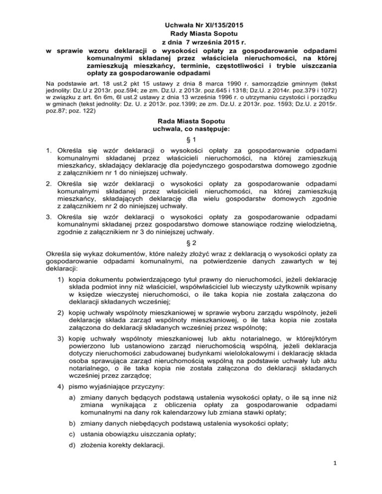 Uchwała Nr XI/135/2015 Rady Miasta Sopotu z dnia 7 września 2015 r. w sprawie wzoru deklaracji o wysokości opłaty za gospodarowanie odpadami komunalnymi składanej przez właściciela nieruchomości, na której zamieszkują mieszkańcy, terminie, częstotliwości i trybie uiszczania opłaty za gospodarowanie odpadami Na podstawie art. 18 ust.2 pkt 15 ustawy z dnia 8 marca 1990 r. samorządzie gminnym (tekst jednolity: Dz.U z 2013r. poz.594; ze zm. Dz.U. z 2013r. poz.645 i 1318; Dz.U. z 2014r. poz.379 i 1072) w związku z art. 6n 6m, 6l ust.2 ustawy z dnia 13 września 1996 r. o utrzymaniu czystości i porządku w gminach (tekst jednolity: Dz. U. z 2013r. poz.1399; ze zm. Dz.U. z 2013r. poz. 1593; Dz.U. z 2015r. poz.87; poz. 122) Rada Miasta Sopotu uchwala, co następuje: §1 1. Określa się wzór deklaracji o wysokości opłaty za gospodarowanie odpadami komunalnymi składanej przez właścicieli nieruchomości, na której zamieszkują mieszkańcy, składający deklarację dla pojedynczego gospodarstwa domowego zgodnie z załącznikiem nr 1 do niniejszej uchwały. 2. Określa się wzór deklaracji o wysokości opłaty za gospodarowanie odpadami komunalnymi składanej przez właścicieli nieruchomości, na której zamieszkują mieszkańcy, składających deklarację dla wielu gospodarstw domowych zgodnie z załącznikiem nr 2 do niniejszej uchwały. 3. Określa się wzór deklaracji o wysokości opłaty za gospodarowanie odpadami komunalnymi składanej przez gospodarstwo domowe stanowiące rodzinę wielodzietną, zgodnie z załącznikiem nr 3 do niniejszej uchwały. §2 Określa się wykaz dokumentów, które należy złożyć wraz z deklaracją o wysokości opłaty za gospodarowanie odpadami komunalnymi, na potwierdzenie danych zawartych w tej deklaracji: 1) kopia dokumentu potwierdzającego tytuł prawny do nieruchomości, jeżeli deklarację składa podmiot inny niż właściciel, współwłaściciel lub wieczysty użytkownik wpisany w księdze wieczystej nieruchomości, o ile taka kopia nie została załączona do deklaracji składanych wcześniej; 2) kopię uchwały wspólnoty mieszkaniowej w sprawie wyboru zarządu wspólnoty, jeżeli deklarację składa zarząd wspólnoty mieszkaniowej, o ile taka kopia nie została załączona do deklaracji składanych wcześniej przez wspólnotę; 3) kopię uchwały wspólnoty mieszkaniowej lub aktu notarialnego, w której/którym powierzono lub ustanowiono zarząd nieruchomością wspólną, jeżeli deklaracja dotyczy nieruchomości zabudowanej budynkami wielolokalowymi i deklarację składa osoba sprawująca zarząd nieruchomością wspólną na podstawie uchwały lub aktu notarialnego, o ile taka kopia nie została załączona do deklaracji składanych wcześniej przez zarządcę; 4) pismo wyjaśniające przyczyny: a) zmiany danych będących podstawą ustalenia wysokości opłaty, o ile są inne niż zmiana wynikająca z obliczenia opłaty za gospodarowanie odpadami komunalnymi na dany rok kalendarzowy lub zmiana stawki opłaty; b) zmiany danych niebędących podstawą ustalenia wysokości opłaty; c) ustania obowiązku uiszczania opłaty; d) złożenia korekty deklaracji. 1 §3 Deklaracje, o których mowa w § 1 właściciele nieruchomości obowiązani są złożyć w Zakładzie Oczyszczania Miasta w Sopocie w terminie: 1) do 15 lutego – na dany rok kalendarzowy, 2) w terminie 14 dni od dnia zamieszkania na danej nieruchomości pierwszego mieszkańca, 3) w terminie 14 dni od daty zmiany danych zawartych w deklaracji będących podstawą ustalenia wysokości należnej opłaty za gospodarowanie odpadami komunalnymi. §4 1. Deklaracje, o których mowa w § 1 uchwały, mogą być składane za pomocą środków komunikacji elektronicznej, z zachowaniem wskazanych warunków i trybu ich składania zgodnie z zapisami z ust.2 i 3 niniejszego paragrafu. 2. Format elektroniczny deklaracji, o którym mowa w § 1 uchwały, określa się jako format danych XML z układem informacji i powiązań między nimi wynikającymi ze wzoru deklaracji. 3. Deklaracje są opatrywane bezpiecznym podpisem elektronicznym weryfikowanym za pomocą ważnego kwalifikowanego certyfikatu w rozumieniu ustawy z dnia 18 września 2001r. o podpisie elektronicznym (tekst jednolity Dz.U. z 2013r. poz.262) lub podpisem potwierdzonym profilem zaufanym ePUAP w rozumieniu ustawy z dnia 17 lutego 2005r. o informatyzacji działalności podmiotów realizujących zadania publiczne (tekst jednolity Dz.U. z 2014 r. poz.1114). §5 1. Ustala się, iż opłaty za gospodarowanie odpadami komunalnymi odbieranymi od właścicieli nieruchomości, na których zamieszkują mieszkańcy uiszcza się z dołu bez wezwania, miesięcznie, w terminie do 30-go dnia każdego miesiąca. 2. Opłatę uiszcza się gotówką w kasie Zakładu Oczyszczania Miasta w Sopocie lub przelewem na indywidualnie wskazany rachunek bankowy. §6 Tracą moc: 1) uchwała nr XXIX/397/2013 Rady Miasta Sopotu z dnia 14 czerwca 2013r. w sprawie wzoru deklaracji o wysokości opłaty za gospodarowanie odpadami komunalnymi składanej przez właściciela nieruchomości (Dziennik Urzędowy Województwa Pomorskiego z dnia 24 czerwca 2013r. poz. 2614); 2) uchwała nr XXIV/329/2012 Rady Miasta Sopotu z dnia 20 grudnia 2012r. w sprawie terminu częstotliwości i trybu uiszczania opłaty za gospodarowanie odpadami komunalnymi (Dziennik Urzędowy Województwa Pomorskiego z dnia 22 stycznia 2013r. poz. 490, zmieniona uchwałą nr XXIX/395/2013 z dnia 14 czerwca 2013r. (Dziennik Urzędowy Województwa Pomorskiego z dnia 24 czerwca 2013r. poz. 26146). §7 Wykonanie uchwały powierza się Prezydentowi Miasta Sopotu. §8 Uchwała wchodzi w życie po upływie 14 dni od dnia jej ogłoszenia w Dzienniku Urzędowym Województwa Pomorskiego z mocą obowiązywania od dnia 1 stycznia 2016 roku. Przewodniczący Rady Miasta Sopotu Wieczesław Augustyniak 2 3 UZASADNIENIE W dniu 28 listopada 2014 uchwalona została ustawa o zmianie ustawy o utrzymaniu c